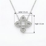 • This stunning necklace features a sophisticated four-leaf clover pendant crafted in high-quality silver-toned metal. At its heart lies a brilliant square-cut clear stone, serving as a focal point for the intricate design. Each petal is meticulously adorned with shimmering round-cut pavé stones, creating a dazzling effect from every angle. The delicate open-work filigree adds a touch of vintage elegance and airy grace. Suspended from a classic silver cable chain, this piece offers a timeless appeal that complements both casual and formal attire. Whether as a symbol of good luck or a statement of refined style, this exquisite pendant is a perfect accessory for any jewelry collection or a thoughtful gift for a loved one. | Brand: jewelryodm