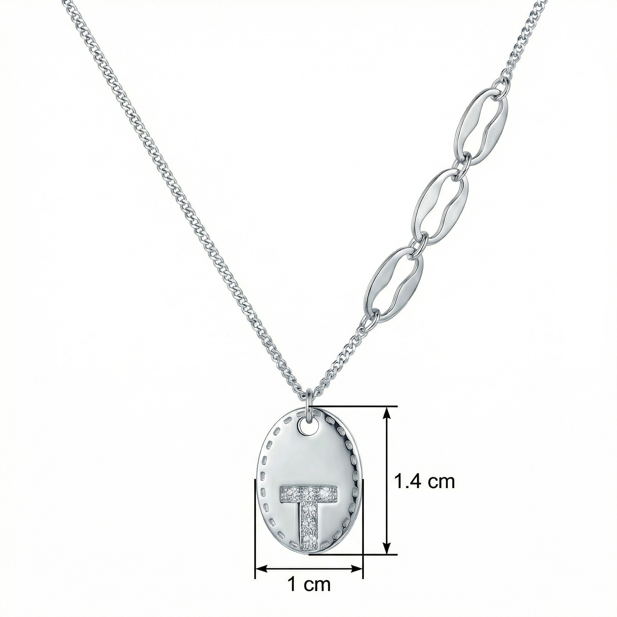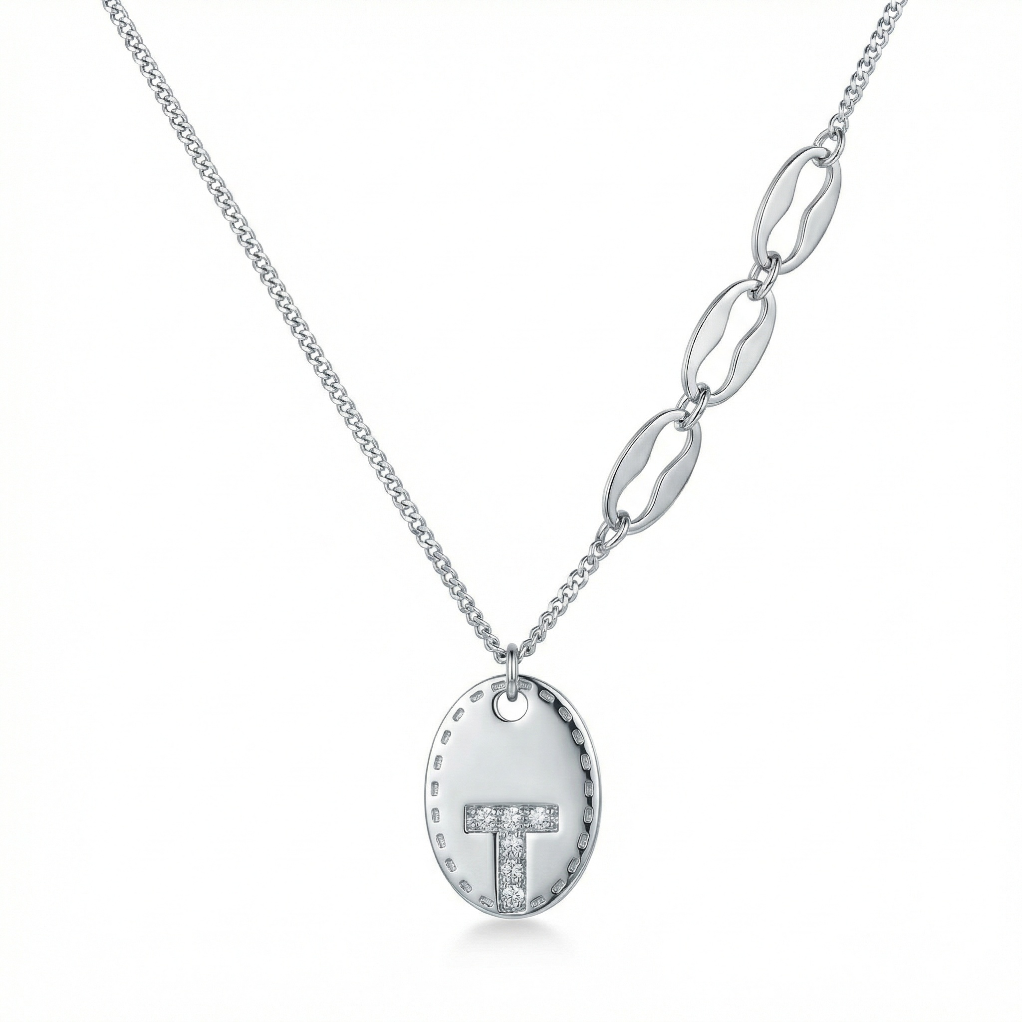 • This exquisite silver-tone necklace features a contemporary and personalized design. The centerpiece is a polished oval pendant with a subtle dotted border, showcasing a capital letter “T” pavé-set with shimmering crystals for a touch of brilliance. What makes this piece unique is its striking asymmetrical chain: one side consists of a delicate classic cable chain, while the other features three oversized, polished geometric links. This blend of delicate and bold elements creates a sophisticated, modern aesthetic. Perfect for daily wear or as a thoughtful gift, this monogrammed necklace offers a unique twist on a timeless accessory, combining individuality with high-fashion flair. | Brand: jewelryodm