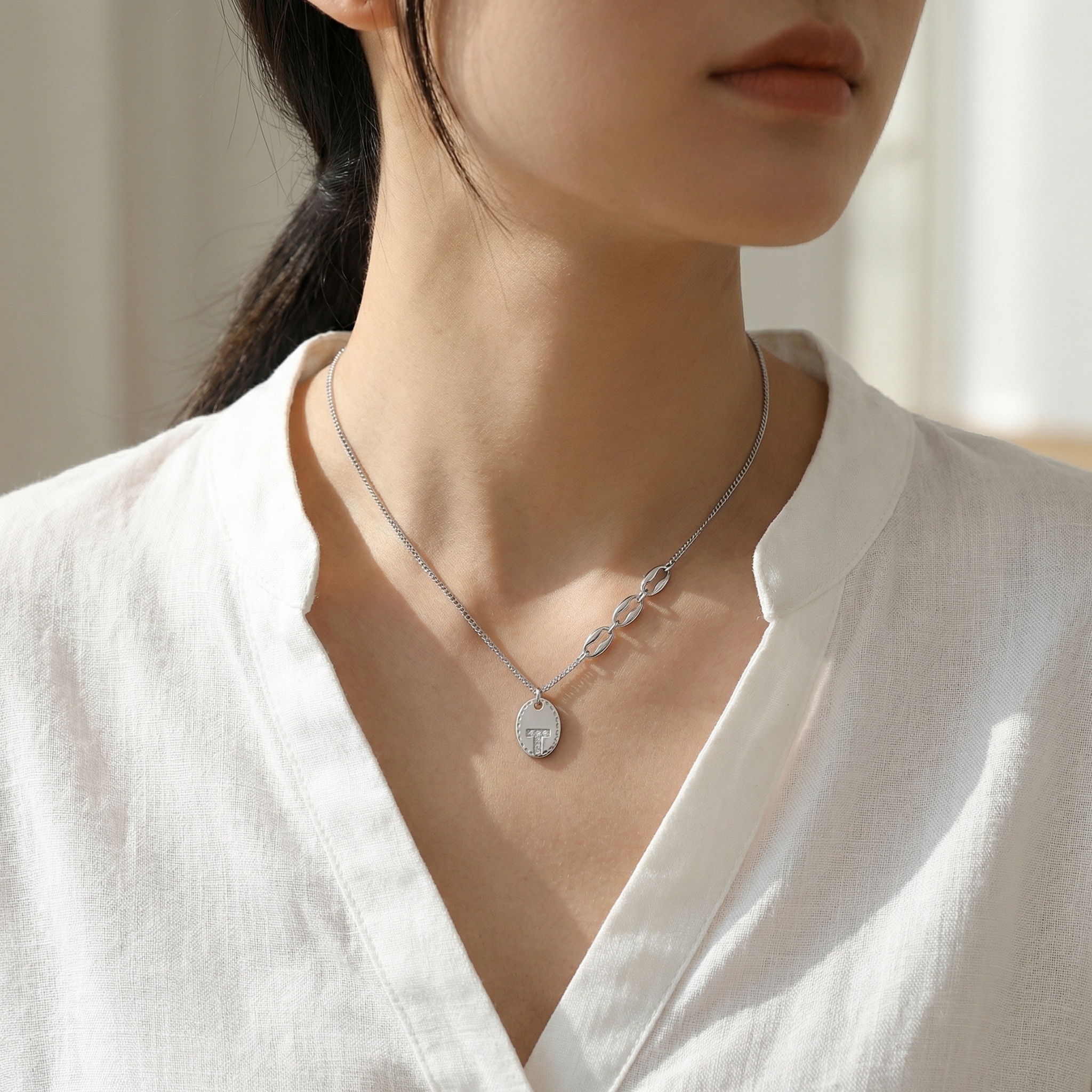 This exquisite silver-tone necklace features a contemporary and personalized design. The centerpiece is a polished oval pendant with a subtle dotted border, showcasing a capital letter “T” pavé-set with shimmering crystals for a touch of brilliance. What makes this piece unique is its striking asymmetrical chain: one side consists of a delicate classic cable chain, while the other features three oversized, polished geometric links. This blend of delicate and bold elements creates a sophisticated, modern aesthetic. Perfect for daily wear or as a thoughtful gift, this monogrammed necklace offers a unique twist on a timeless accessory, combining individuality with high-fashion flair. | Brand: jewelryodm