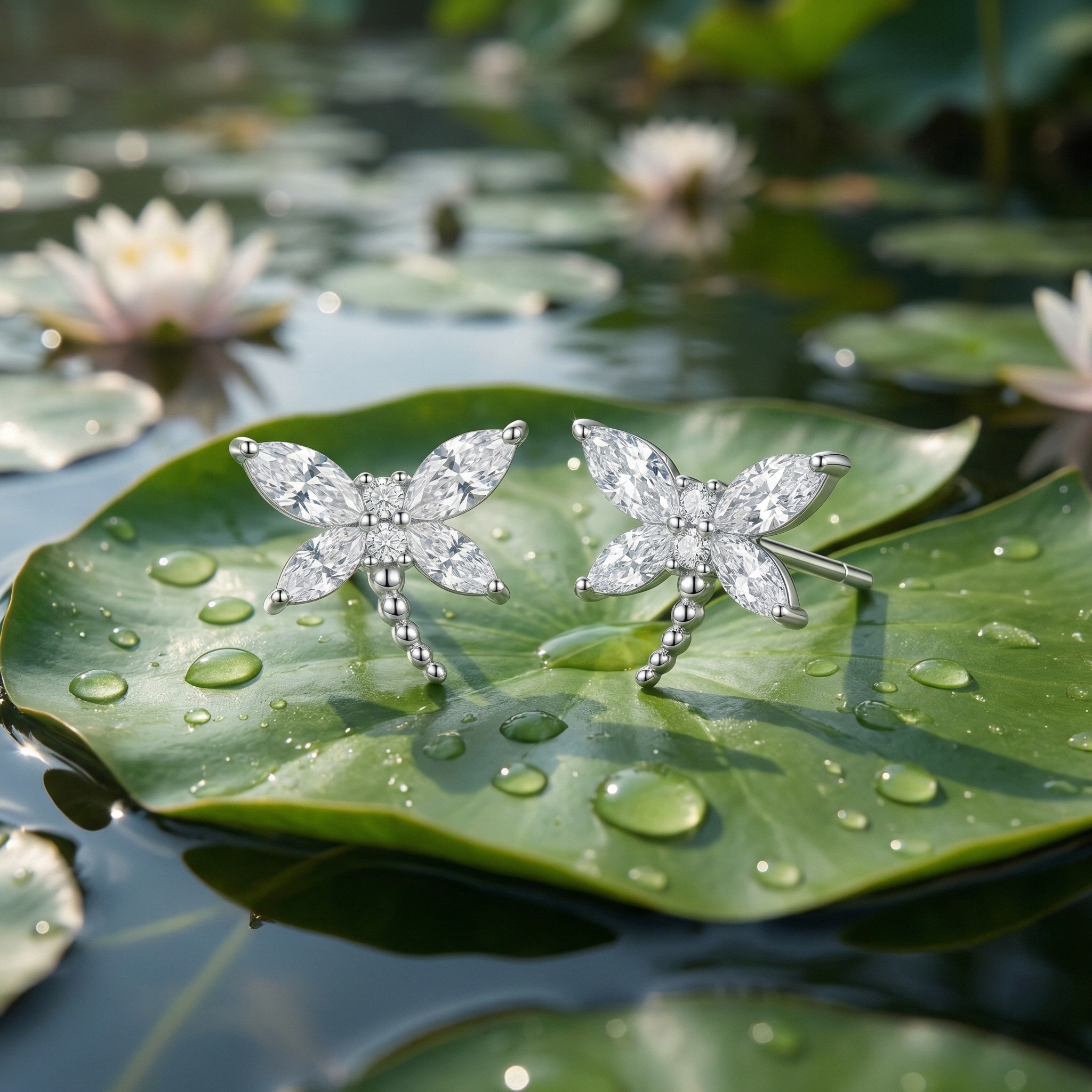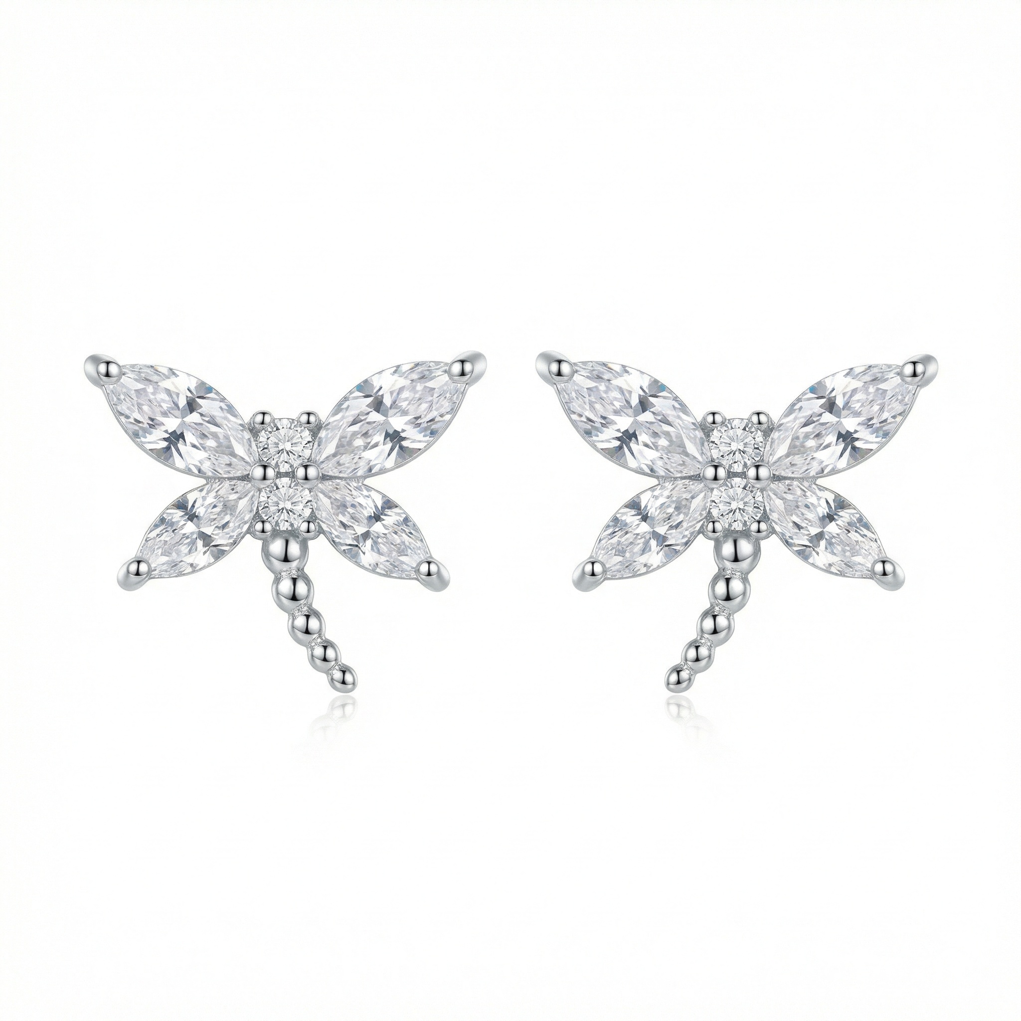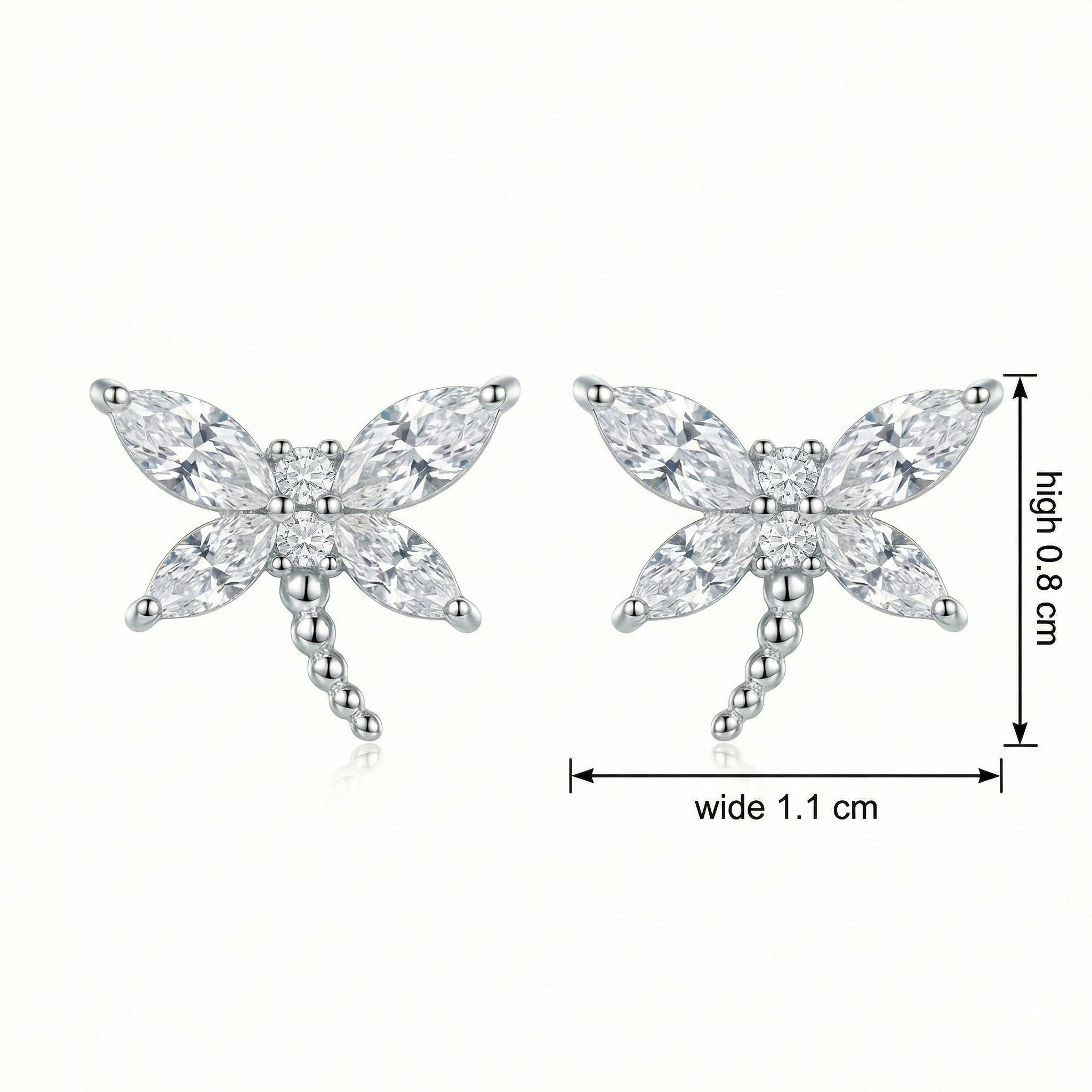 These exquisite dragonfly stud earrings capture the delicate beauty of nature with a sophisticated, modern twist. Meticulously crafted in high-quality sterling silver, each earring features a whimsical dragonfly silhouette adorned with shimmering clear gemstones. The wings are composed of four stunning marquise-cut stones that brilliantly reflect the light, while the body is accented with tiny round brilliant-cut stones for added sparkle. A polished, beaded tail adds a graceful finishing touch to the design. These earrings are perfect for adding a touch of elegance and whimsy to any outfit, whether for daily wear or special occasions. Lightweight and comfortable, they make an ideal gift for nature lovers or a charming addition to your own jewelry collection. Their timeless design ensures they will remain a cherished piece for years to come. | Brand: jewelryodm