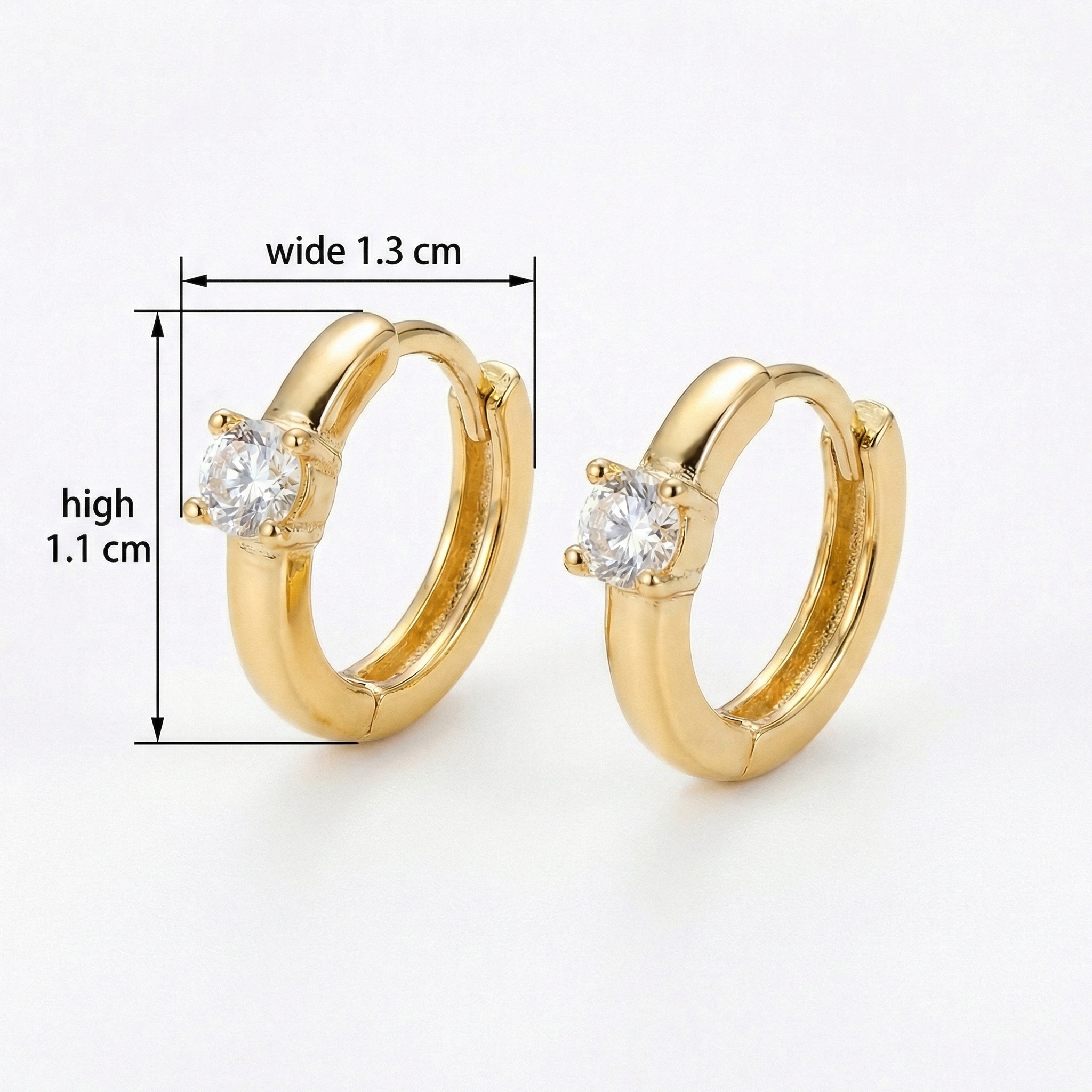 These sophisticated earrings feature a polished, lustrous finish in a rich metallic hue. Each huggie-style hoop is accented with a stunning round-cut clear stone, meticulously held in a secure four-prong setting. The brilliant facets of the centerpiece reflect light beautifully, offering a refined sparkle that enhances any look. Designed for both style and comfort, the hoops incorporate a smooth hinge closure, making them easy to wear throughout the day. Their minimalist and timeless design makes these earrings an essential addition to any jewelry box, perfect for layering or wearing solo. Whether for a casual outing or a formal event, these versatile accessories provide a touch of effortless elegance and charm. | Brand: jewelryodm