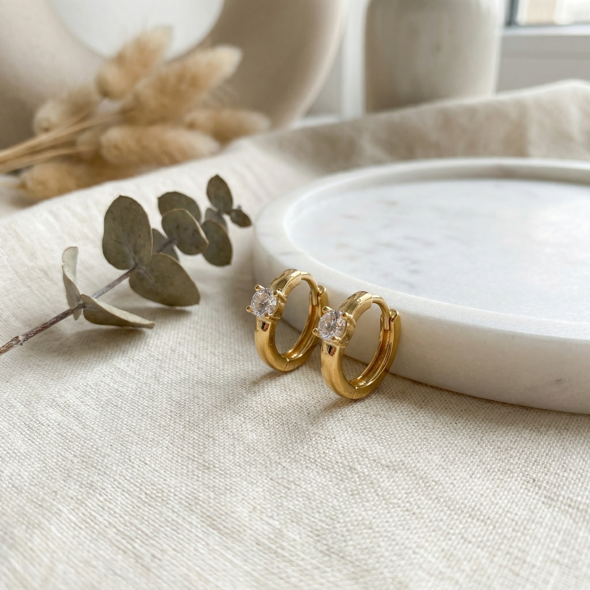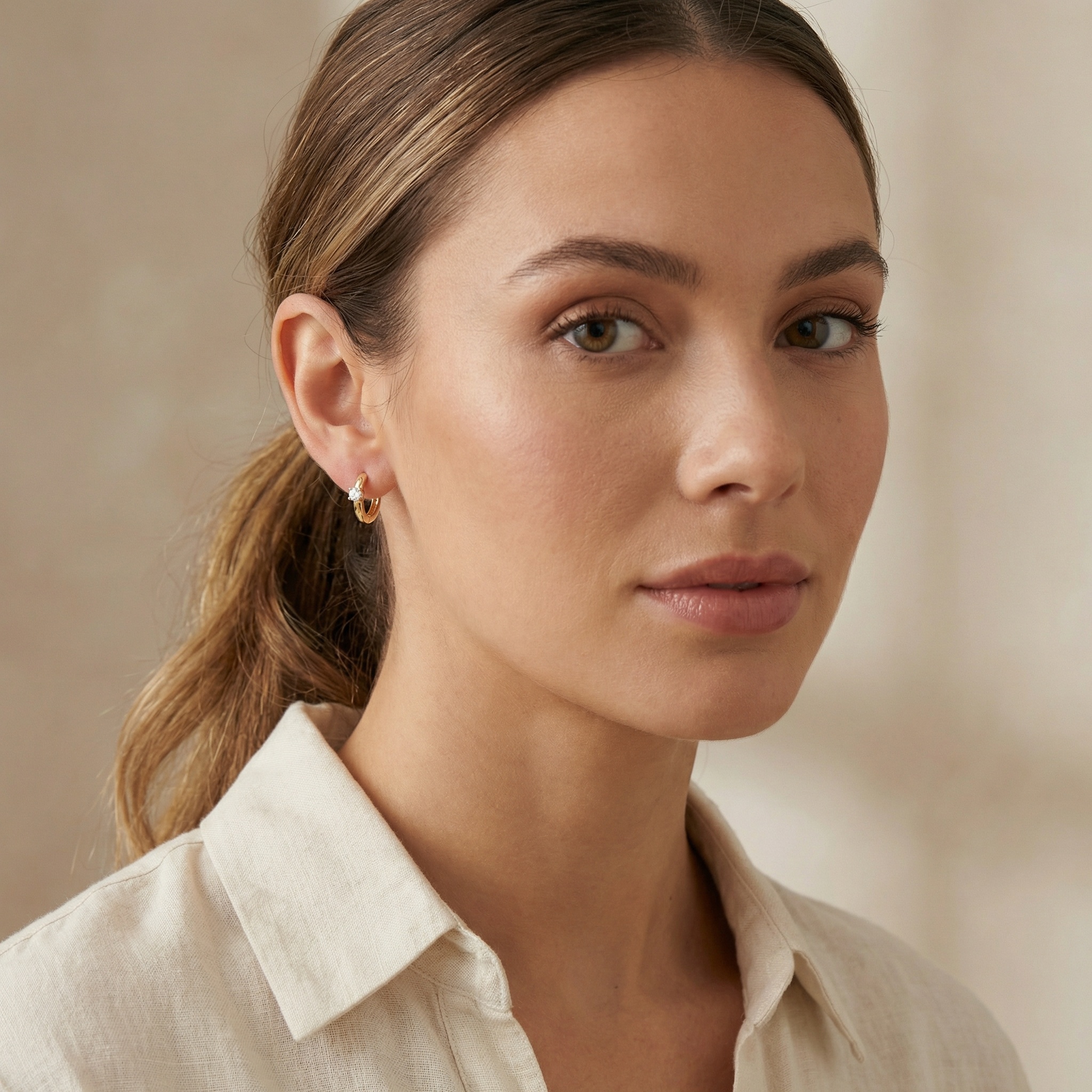 • These sophisticated earrings feature a polished, lustrous finish in a rich metallic hue. Each huggie-style hoop is accented with a stunning round-cut clear stone, meticulously held in a secure four-prong setting. The brilliant facets of the centerpiece reflect light beautifully, offering a refined sparkle that enhances any look. Designed for both style and comfort, the hoops incorporate a smooth hinge closure, making them easy to wear throughout the day. Their minimalist and timeless design makes these earrings an essential addition to any jewelry box, perfect for layering or wearing solo. Whether for a casual outing or a formal event, these versatile accessories provide a touch of effortless elegance and charm. | Brand: jewelryodm