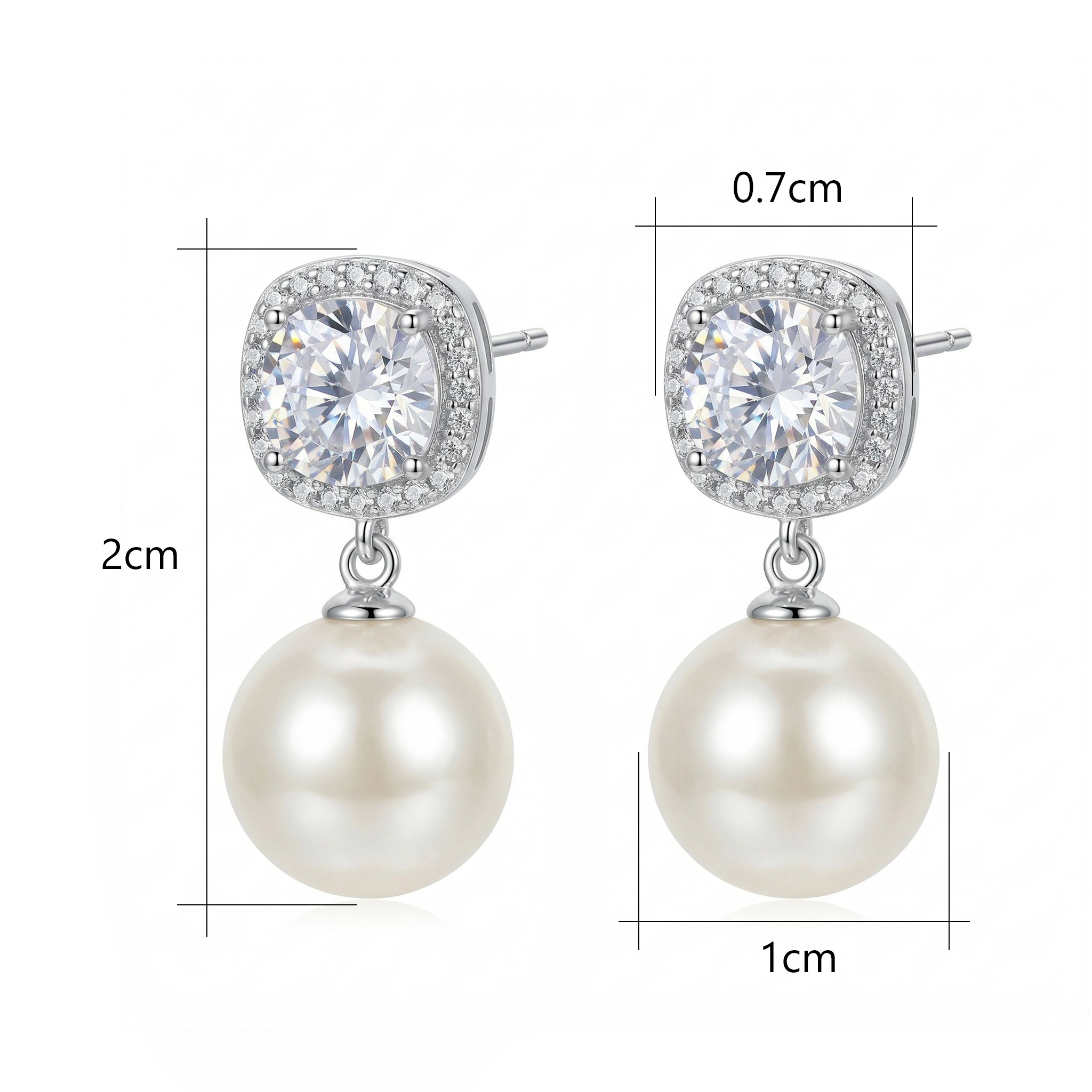 925 Sterling Silver Elegant Square Halo CZ and White Pearl Drop Earrings