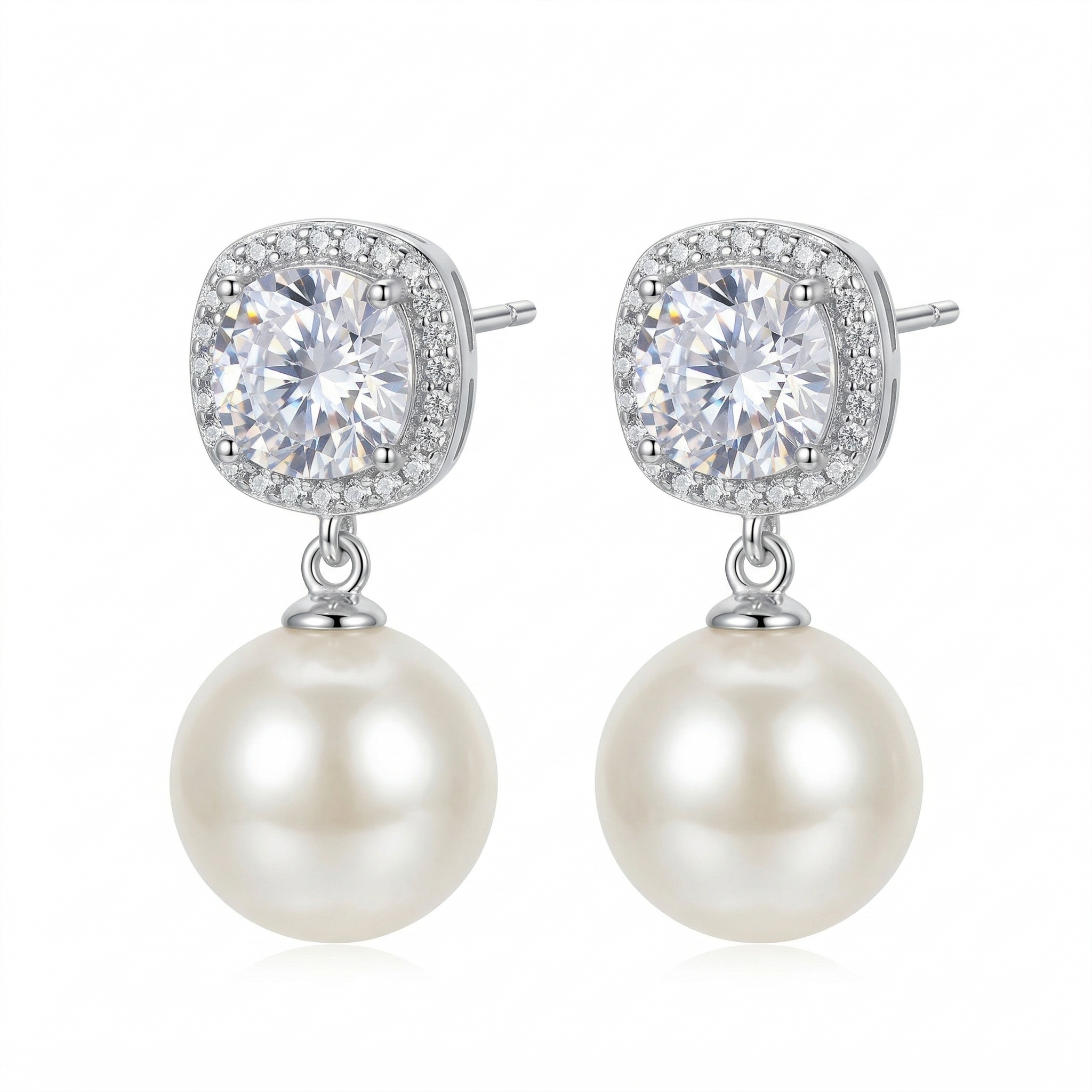 These stunning earrings showcase a timeless combination of lustrous pearls and brilliant sparkle. Each earring features a large, perfectly round white pearl suspended from a sophisticated square halo mount. The upper portion is meticulously crafted with a central round-cut clear stone, encircled by a delicate frame of shimmering pavé-set accents. Set in polished silver-toned metal, the design captures a refined and luxurious aesthetic. Ideal for bridal wear, formal occasions, or elegant evening events, these drop earrings blend classic charm with contemporary brilliance. The contrast between the radiant light-reflecting crystals and the soft, creamy glow of the pearls creates a breathtaking accessory. Lightweight and comfortable for all-day wear, these exquisite dangle earrings are a must-have addition to any jewelry collection, offering a touch of sophisticated glamour for every special moment. | Brand: jewelryodm