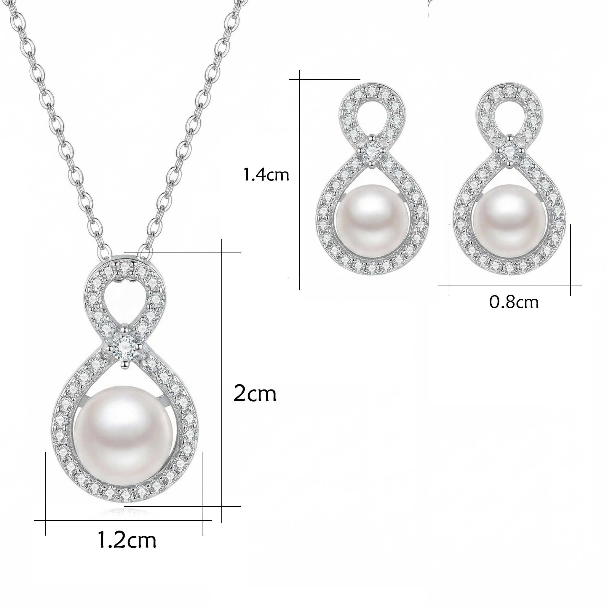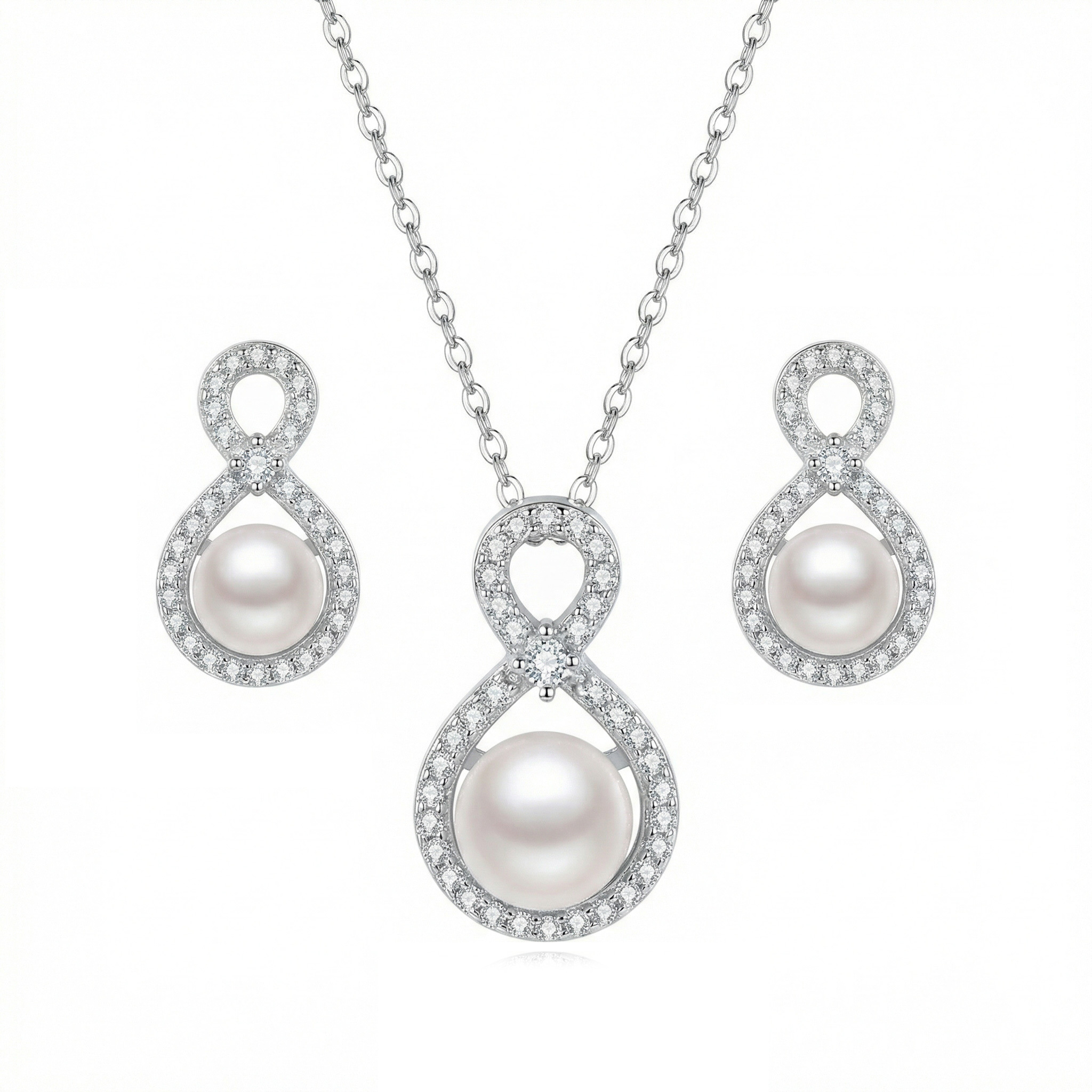 This exquisite jewelry set features a timeless infinity loop design, symbolizing eternal love and grace. Crafted with a polished silver-tone finish, each piece is meticulously paved with shimmering cubic zirconia crystals that catch the light from every angle. At the heart of each bottom loop sits a lustrous, round white pearl, adding a touch of classic sophistication. The set includes a delicate cable chain necklace with a matching pendant and a pair of coordinating stud earrings. This elegant ensemble is the perfect accessory for brides, anniversaries, or special formal occasions. Its blend of modern symbolism and traditional pearl elegance makes it a meaningful gift for someone special. | Brand: jewelryodm