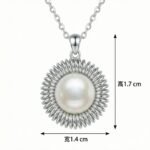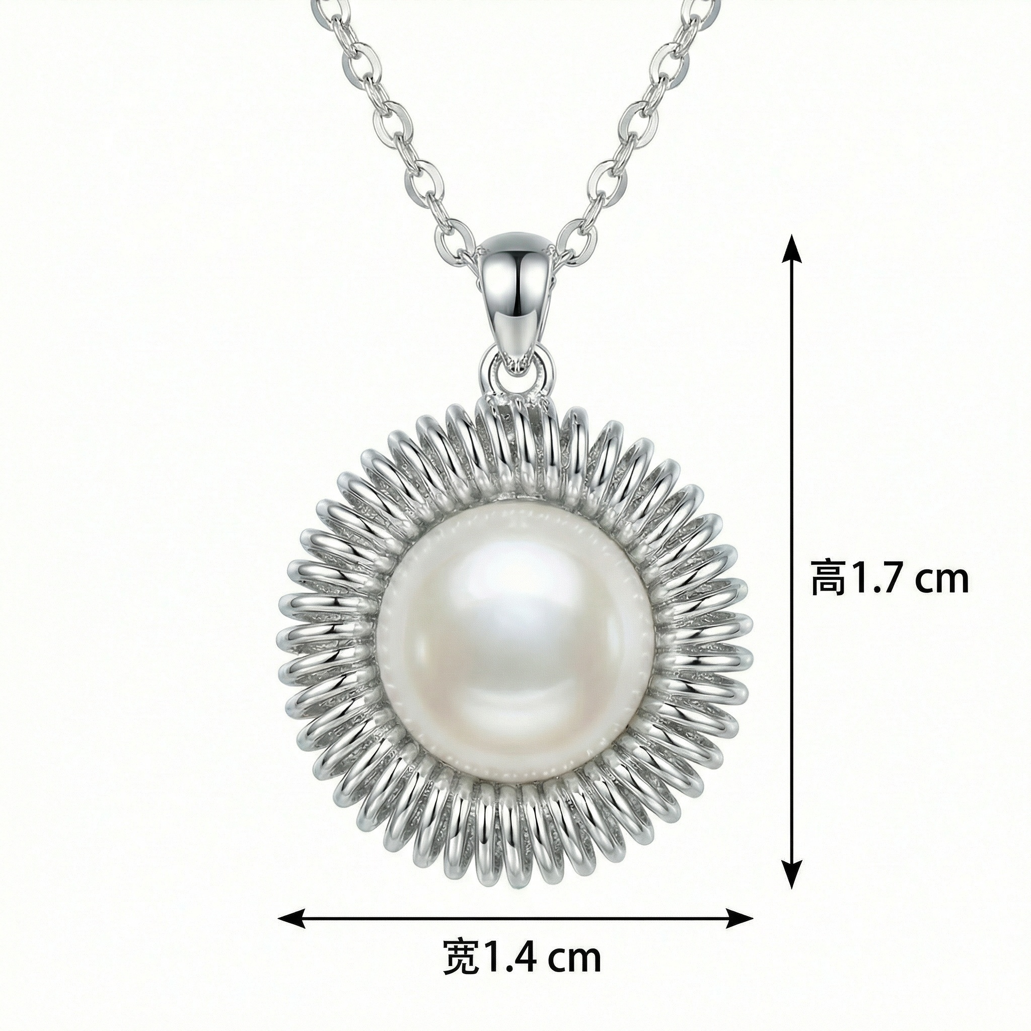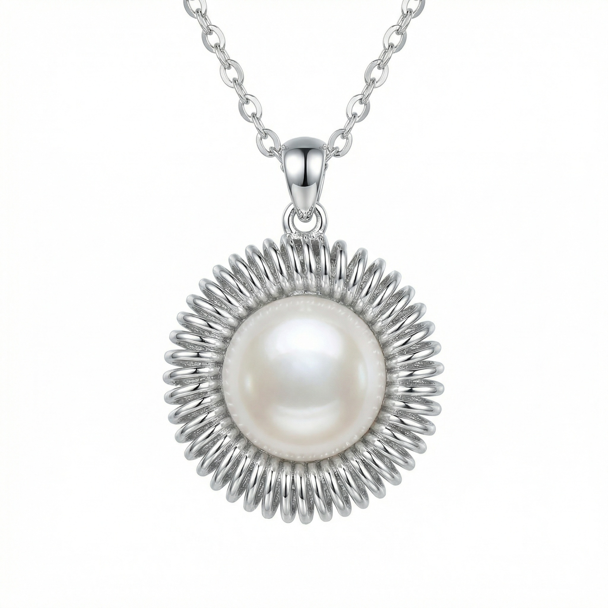 This exquisite necklace features a stunning round white pearl as its centerpiece, radiating a natural, soft luster. The pearl is securely nestled within an intricate, polished silver frame. This frame boasts a unique coiled or corrugated design, creating a dynamic sunburst effect that adds a modern yet timeless flair to the piece. Crafted from high-quality silver, the circular pendant hangs gracefully from a delicate matching link chain. The combination of the classic, smooth pearl and the textured silver border makes this necklace a versatile accessory, perfect for adding a touch of sophistication to a formal ensemble or elevating a casual outfit. Its elegant design and radiant finish make it a beautiful statement piece for any jewelry collection. | Brand: jewelryodm