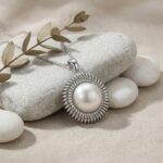 • This exquisite necklace features a stunning round white pearl as its centerpiece, radiating a natural, soft luster. The pearl is securely nestled within an intricate, polished silver frame. This frame boasts a unique coiled or corrugated design, creating a dynamic sunburst effect that adds a modern yet timeless flair to the piece. Crafted from high-quality silver, the circular pendant hangs gracefully from a delicate matching link chain. The combination of the classic, smooth pearl and the textured silver border makes this necklace a versatile accessory, perfect for adding a touch of sophistication to a formal ensemble or elevating a casual outfit. Its elegant design and radiant finish make it a beautiful statement piece for any jewelry collection. | Brand: jewelryodm
