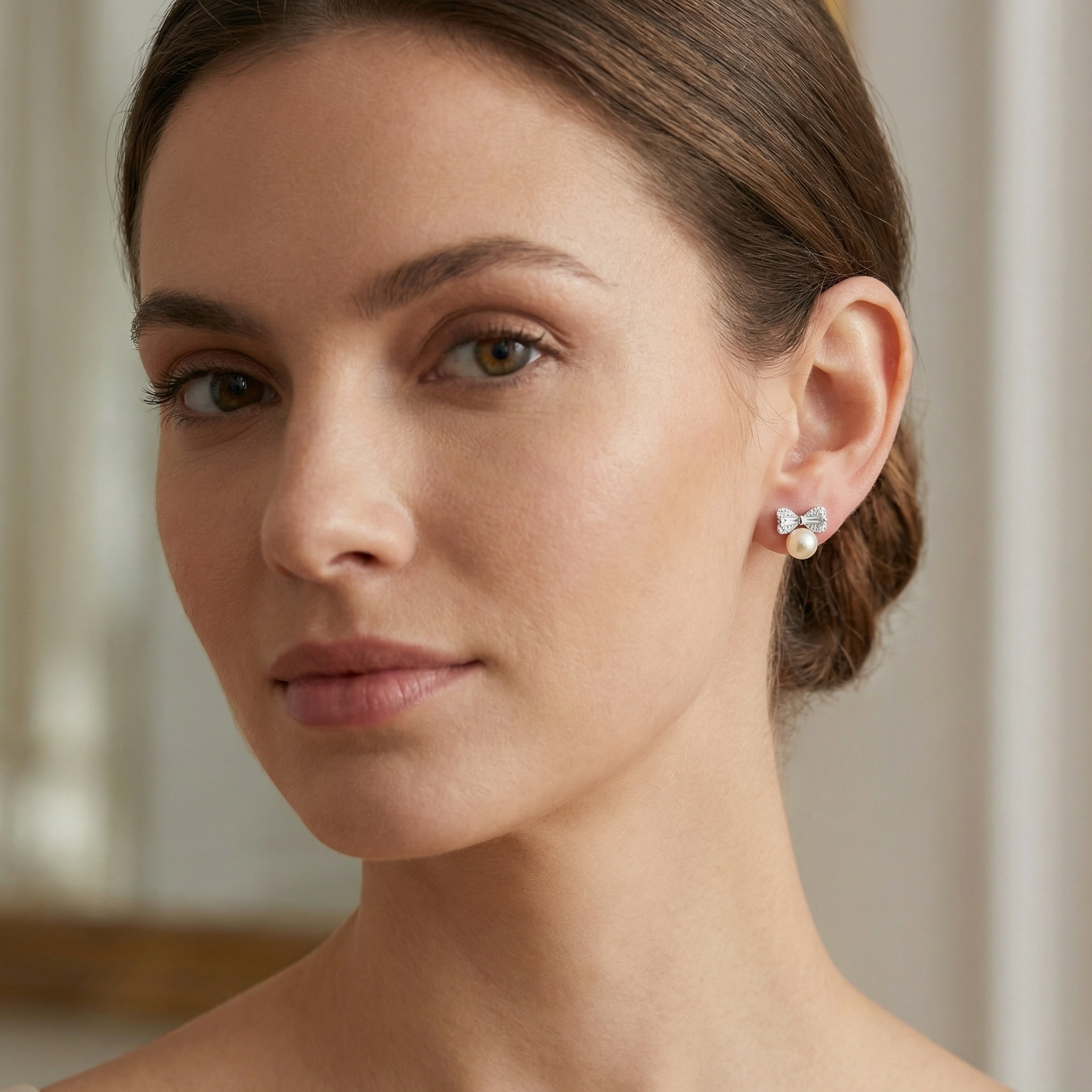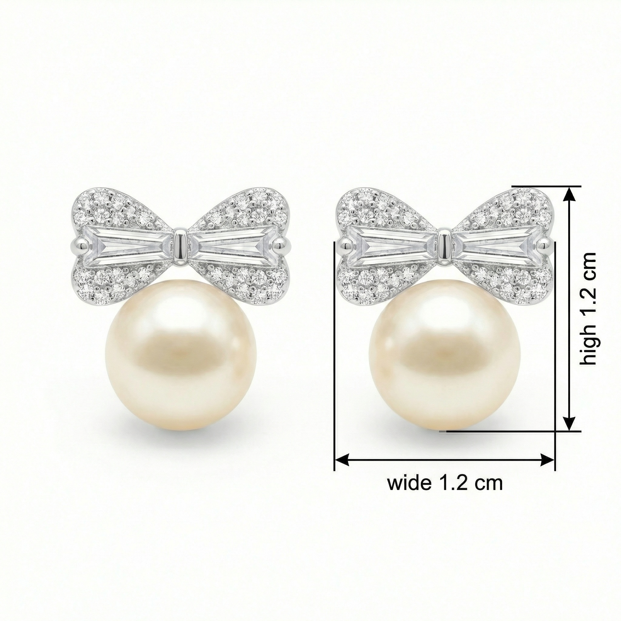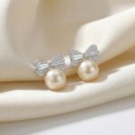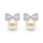 • This exquisite pair of earrings features a harmonious blend of classic elegance and modern charm. Each piece showcases a lustrous, creamy-white pearl at its base, topped with a meticulously crafted bow design. The bows are cast in a polished silver-toned metal, intricately pavé-set with shimmering crystals that catch the light beautifully. At the heart of each bow’s wing sits a brilliant baguette-cut stone, adding a touch of geometric sophistication. Perfect for bridal wear, formal occasions, or as a thoughtful gift, these stud earrings offer a timeless appeal that complements any outfit. Their delicate yet radiant design makes them a versatile accessory for those who appreciate refined craftsmanship and feminine style. | Brand: jewelryodm