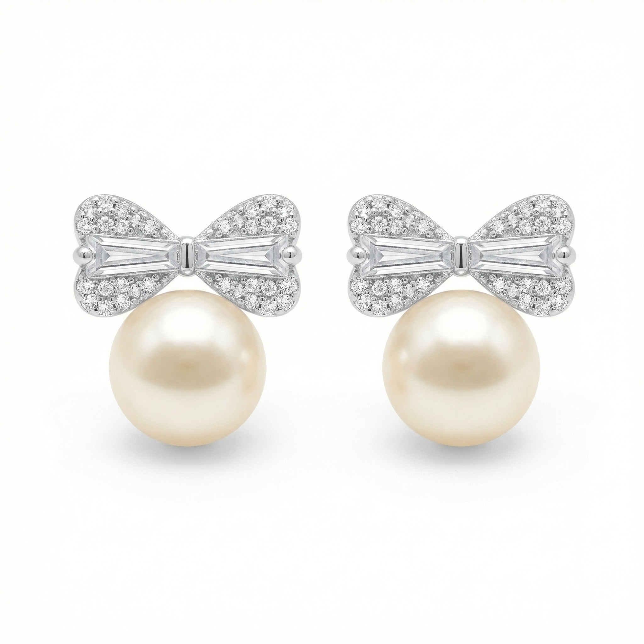 This exquisite pair of earrings features a harmonious blend of classic elegance and modern charm. Each piece showcases a lustrous, creamy-white pearl at its base, topped with a meticulously crafted bow design. The bows are cast in a polished silver-toned metal, intricately pavé-set with shimmering crystals that catch the light beautifully. At the heart of each bow’s wing sits a brilliant baguette-cut stone, adding a touch of geometric sophistication. Perfect for bridal wear, formal occasions, or as a thoughtful gift, these stud earrings offer a timeless appeal that complements any outfit. Their delicate yet radiant design makes them a versatile accessory for those who appreciate refined craftsmanship and feminine style. | Brand: jewelryodm