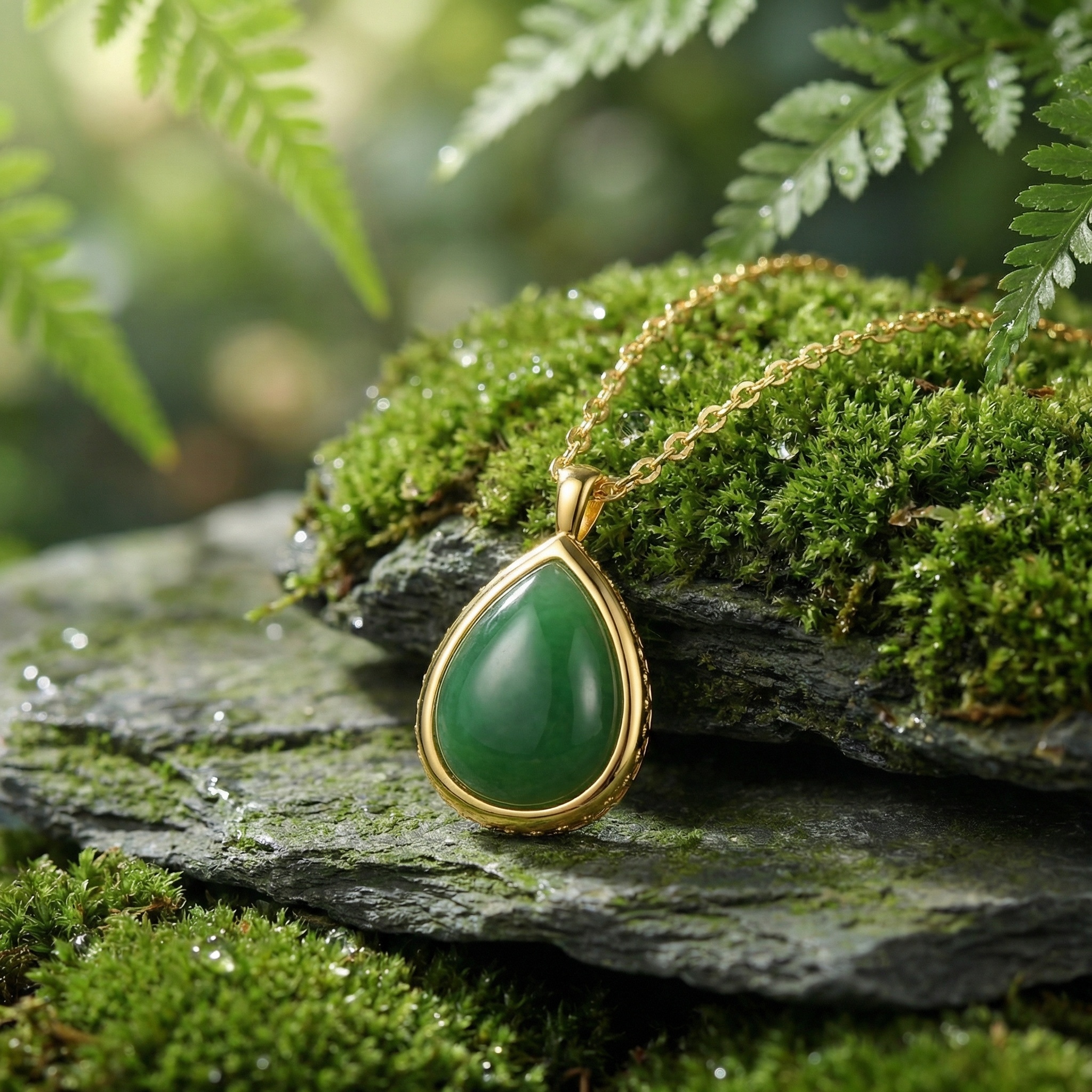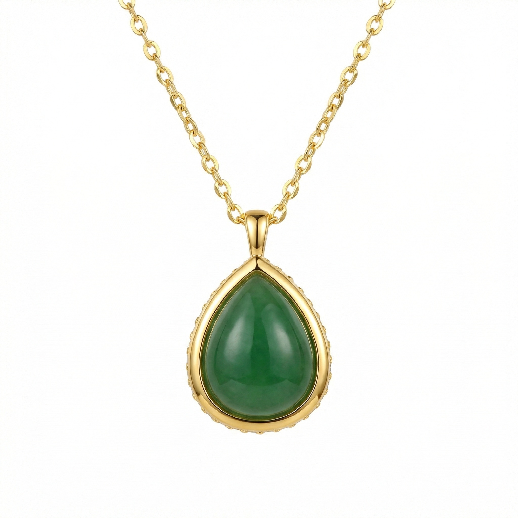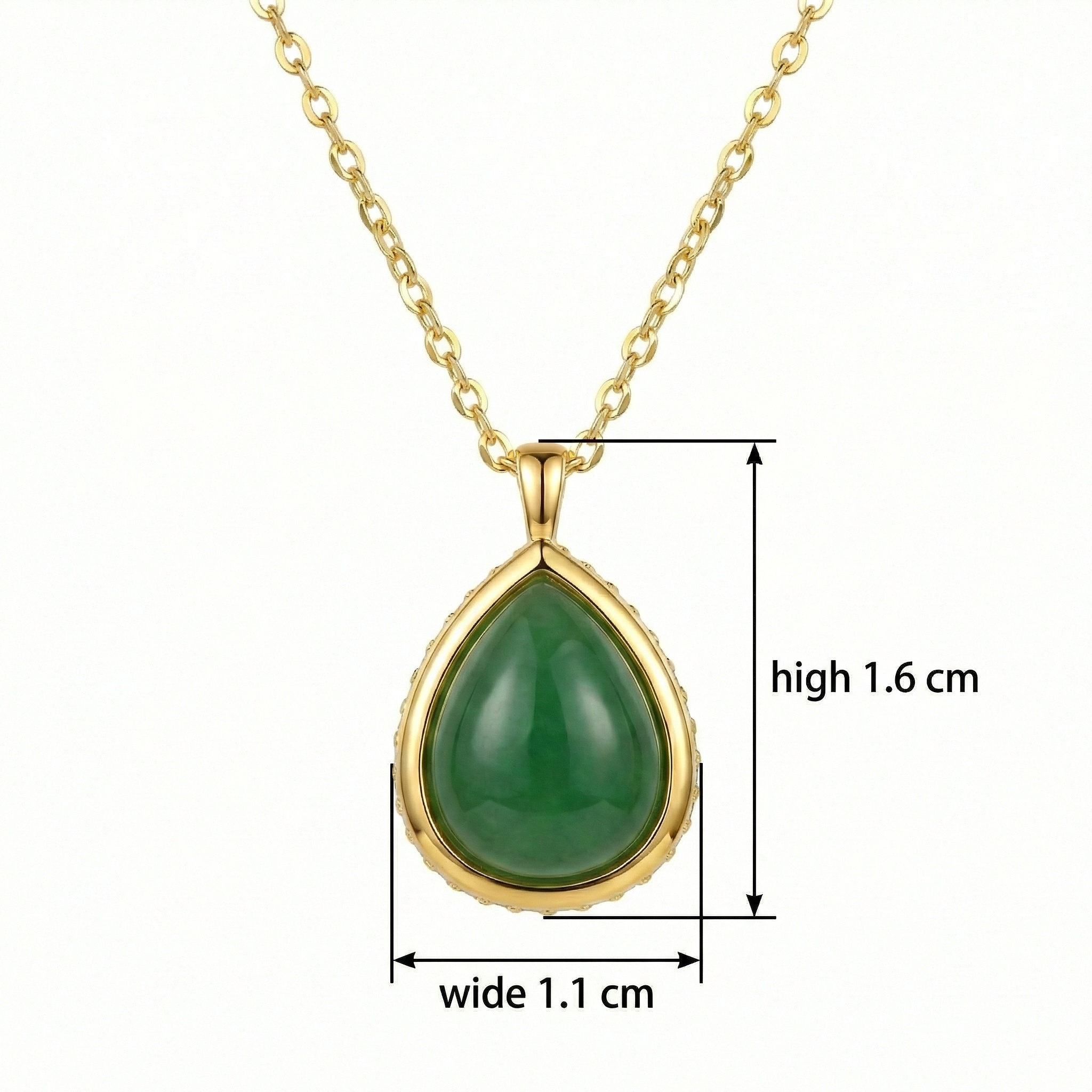 • This exquisite necklace features a stunning teardrop-shaped green gemstone, reminiscent of fine jade, meticulously polished to a smooth cabochon finish. The deep, vibrant green hue of the stone is beautifully complemented by a lustrous metallic setting that adds a touch of sophistication to any outfit. Suspended from a delicate yet durable chain, this pendant is designed to rest gracefully against the skin. Whether worn for a formal occasion or as an everyday statement piece, its timeless silhouette and rich color make it a versatile addition to any jewelry collection. The meticulous craftsmanship ensures a high-shine finish that catches the light from every angle, making it an ideal gift for someone special or a luxurious treat for yourself. | Brand: jewelryodm