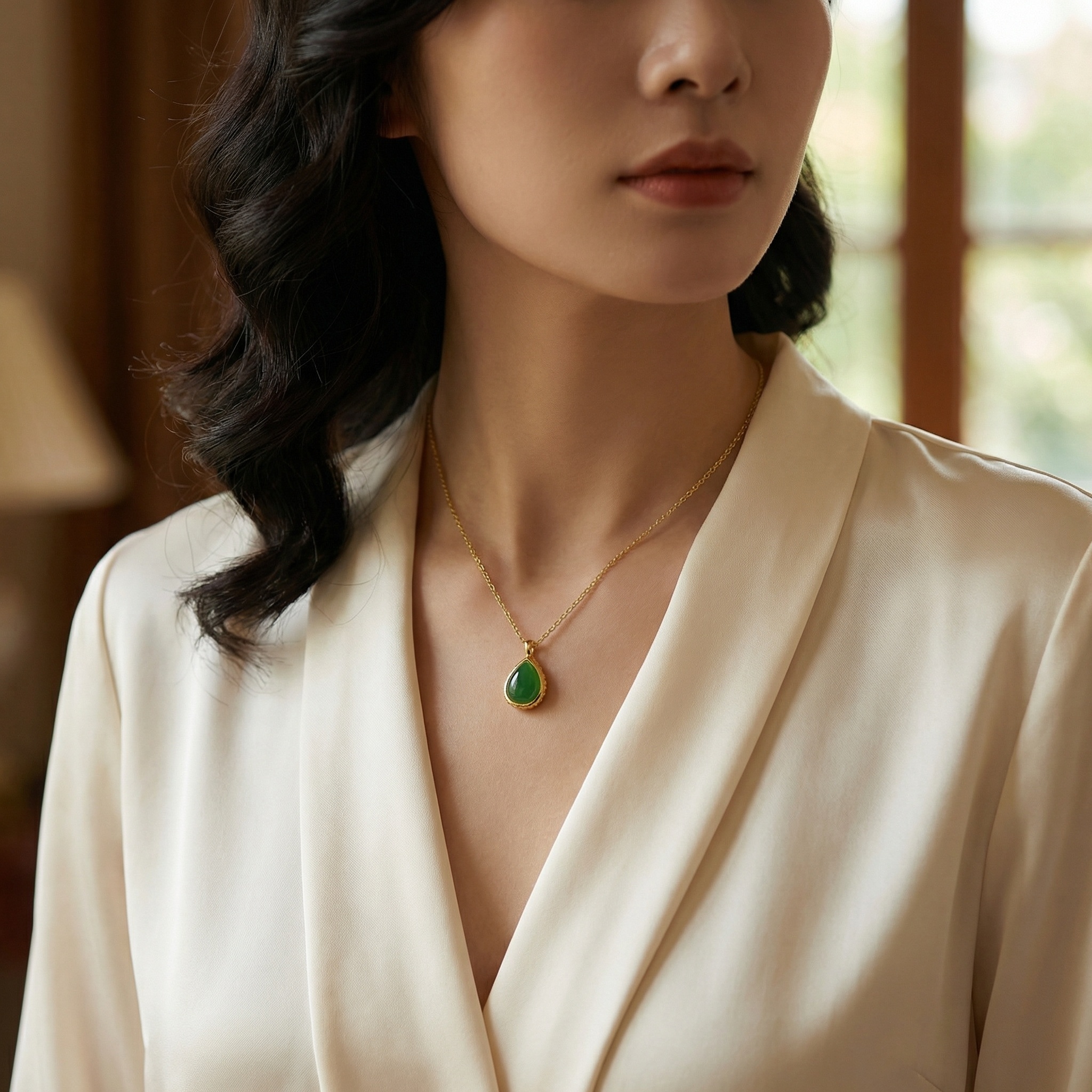 Be the first to review “925 Sterling Silver Elegant Teardrop Green Jade Pendant Necklace with Polished Gilt Chain for Timeless Style”