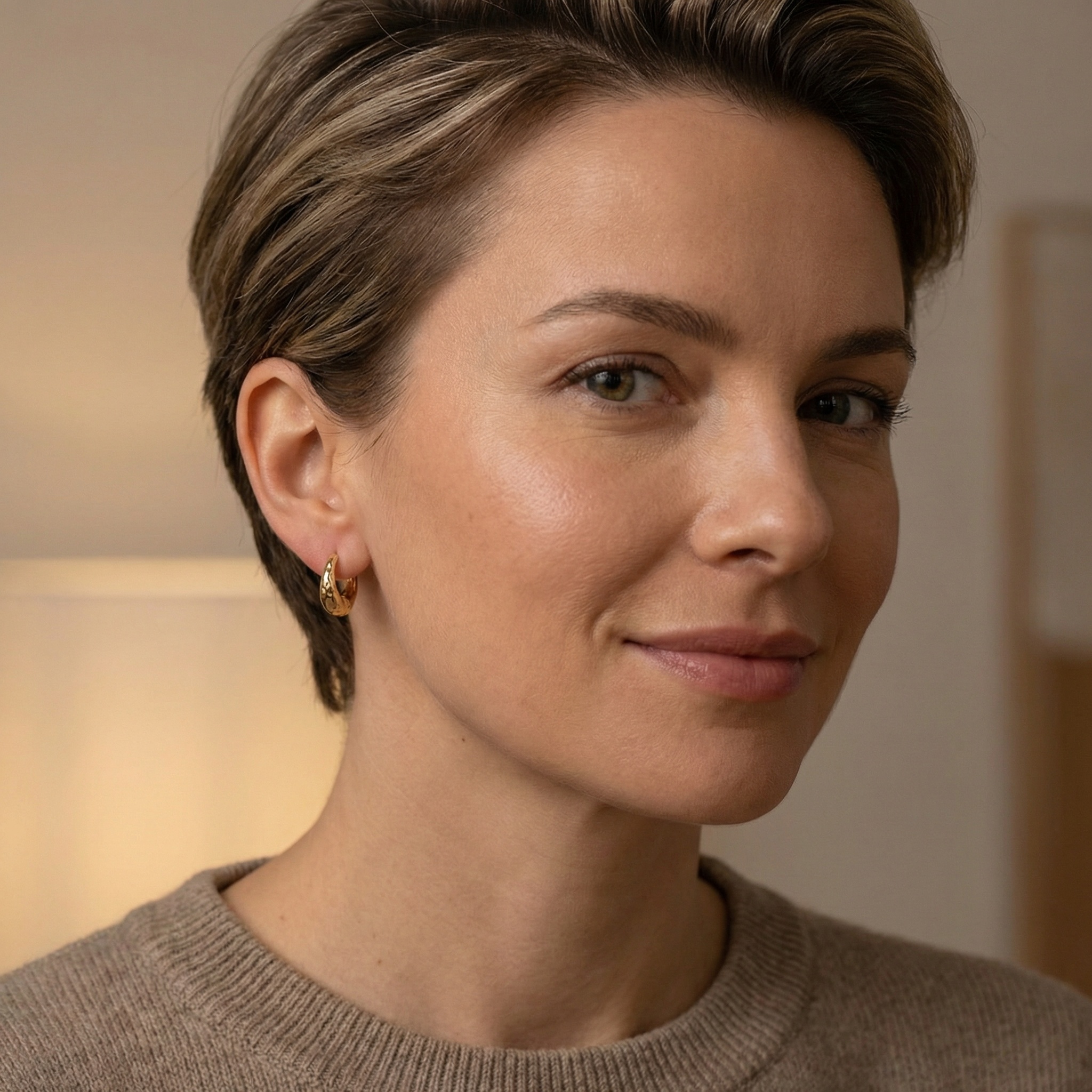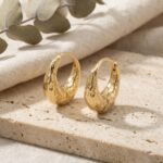 • Elevate your style with these striking hammered huggie hoop earrings. Each piece features a beautifully distressed, organic texture that captures light from every angle, creating a radiant and sophisticated glow. The chunky, crescent-inspired silhouette offers a bold yet timeless aesthetic, making them the perfect statement accessory for both casual and formal occasions. Designed for comfort and security, these earrings feature a sleek click-to-lock hinge mechanism that ensures a seamless fit. Their lustrous yellow finish provides a luxurious warmth that complements any skin tone. Whether worn alone for a minimalist look or paired with other studs for a curated ear stack, these artisan-crafted hoops add a touch of modern elegance to your daily style. Lightweight enough for all-day wear, they are an essential addition for those who appreciate unique, sculptural design and effortless glamor. | Brand: jewelryodm