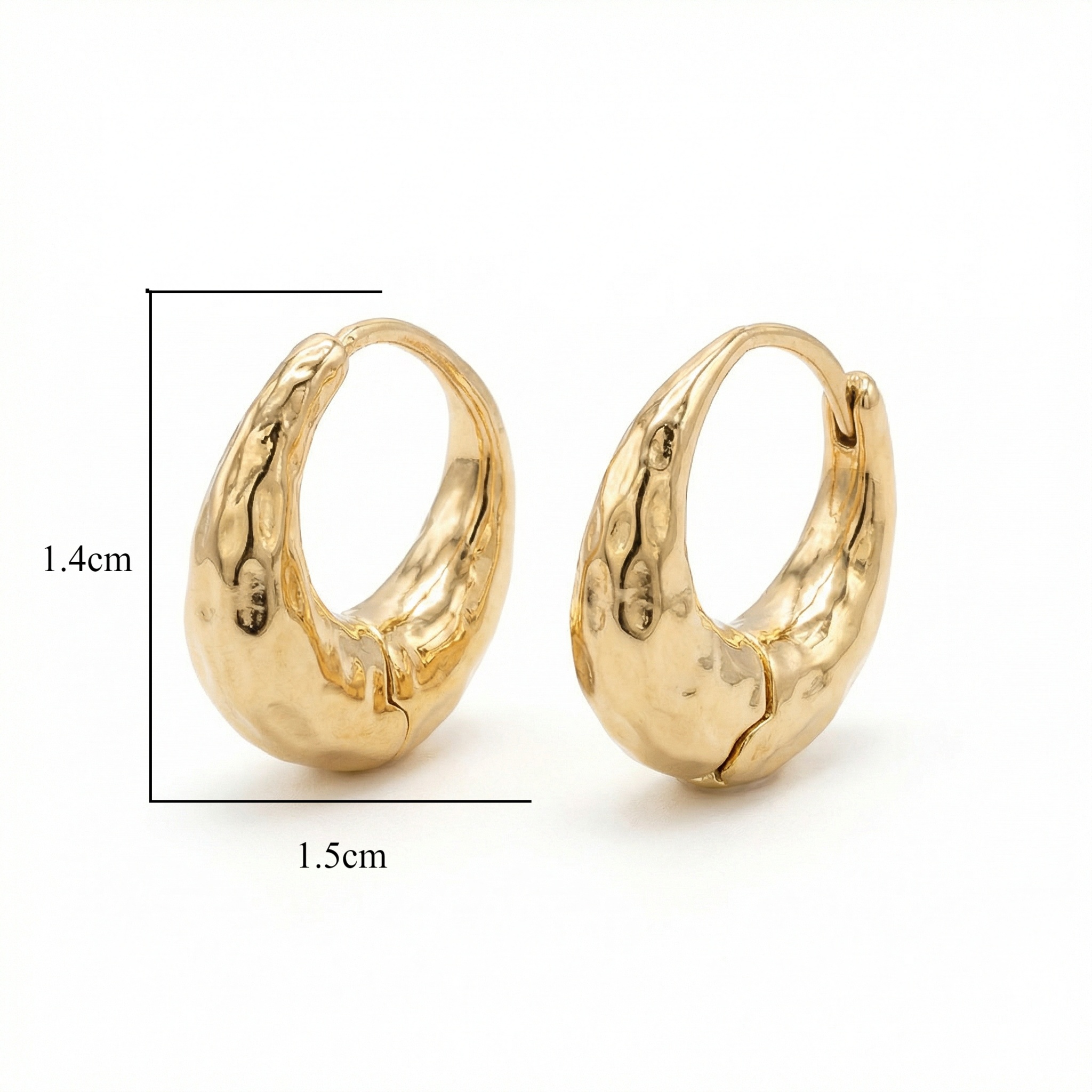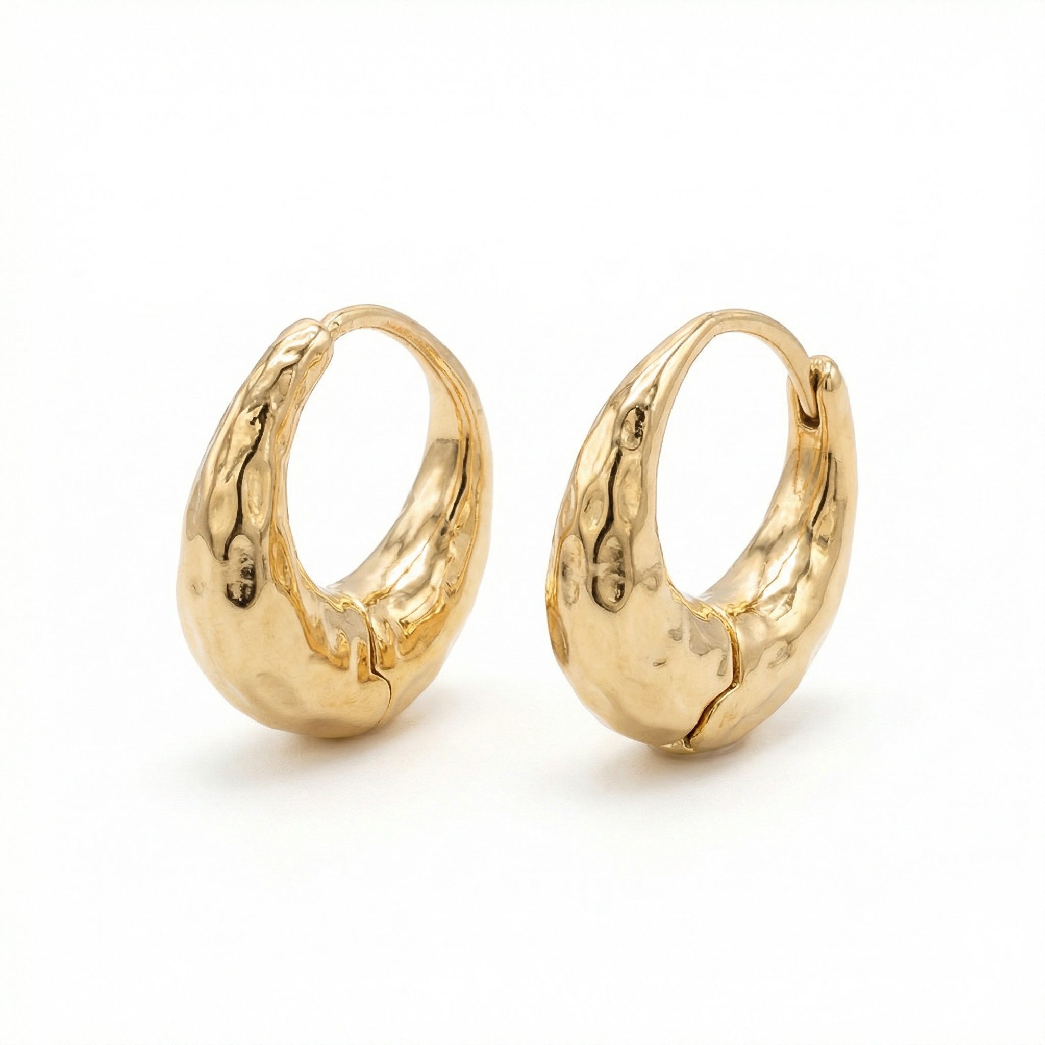 Elevate your style with these striking hammered huggie hoop earrings. Each piece features a beautifully distressed, organic texture that captures light from every angle, creating a radiant and sophisticated glow. The chunky, crescent-inspired silhouette offers a bold yet timeless aesthetic, making them the perfect statement accessory for both casual and formal occasions. Designed for comfort and security, these earrings feature a sleek click-to-lock hinge mechanism that ensures a seamless fit. Their lustrous yellow finish provides a luxurious warmth that complements any skin tone. Whether worn alone for a minimalist look or paired with other studs for a curated ear stack, these artisan-crafted hoops add a touch of modern elegance to your daily style. Lightweight enough for all-day wear, they are an essential addition for those who appreciate unique, sculptural design and effortless glamor. | Brand: jewelryodm