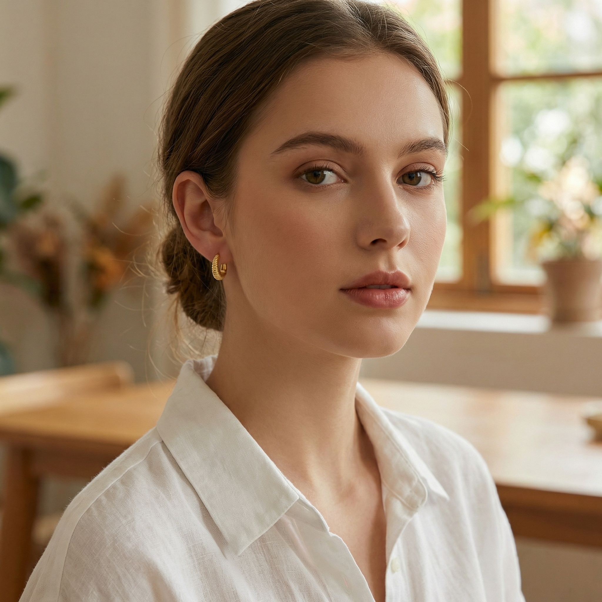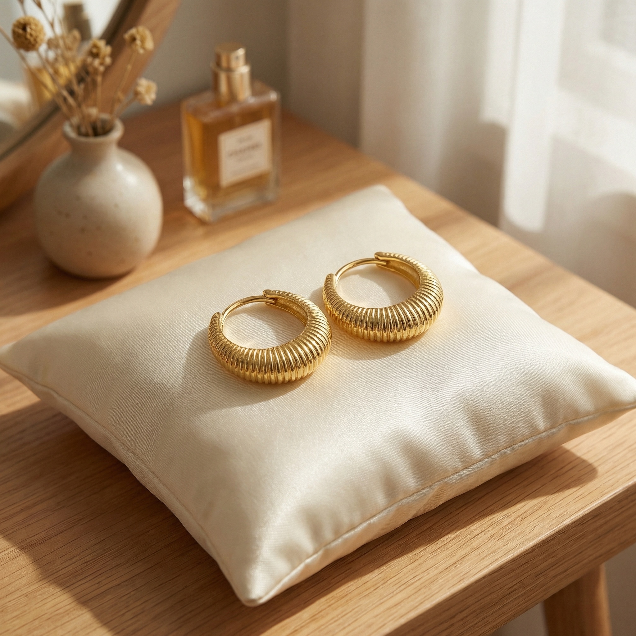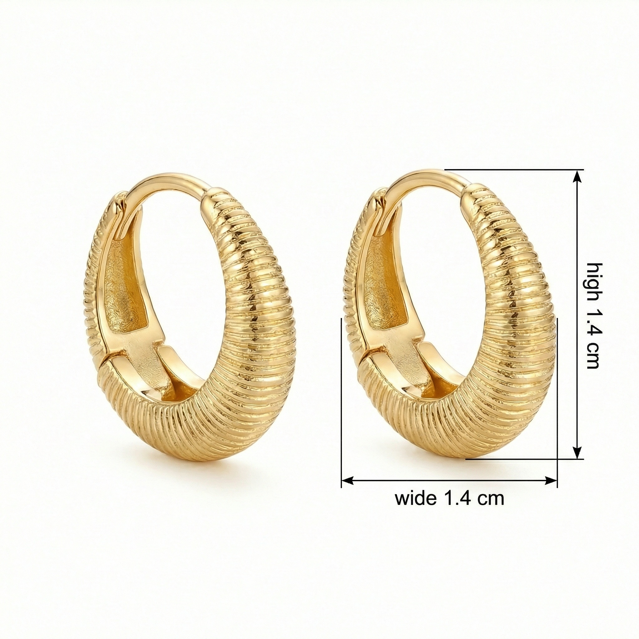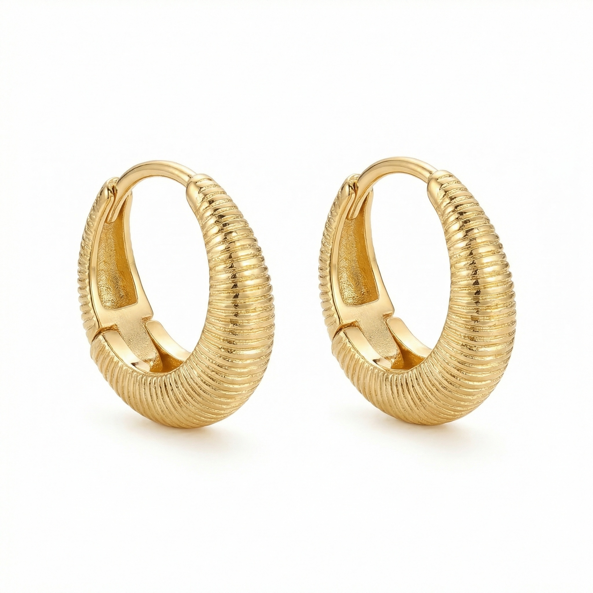 These exquisite huggie hoop earrings feature a striking ribbed texture that catches the light from every angle. Crafted with a lustrous metallic finish, their chunky yet refined silhouette offers a modern twist on a classic design. The intricate linear patterns create a sophisticated aesthetic, making them a perfect statement piece for both casual and formal occasions. Each earring is equipped with a secure hinged closure for comfortable all-day wear. The warm, radiant sheen of these pieces adds a touch of timeless elegance to any jewelry collection. Lightweight and stylish, they are designed to hug the earlobe perfectly, providing a bold and polished appearance. Whether worn alone or stacked with other pieces, these textured hoops are a versatile accessory that elevates your style with ease and sophistication. | Brand: jewelryodm