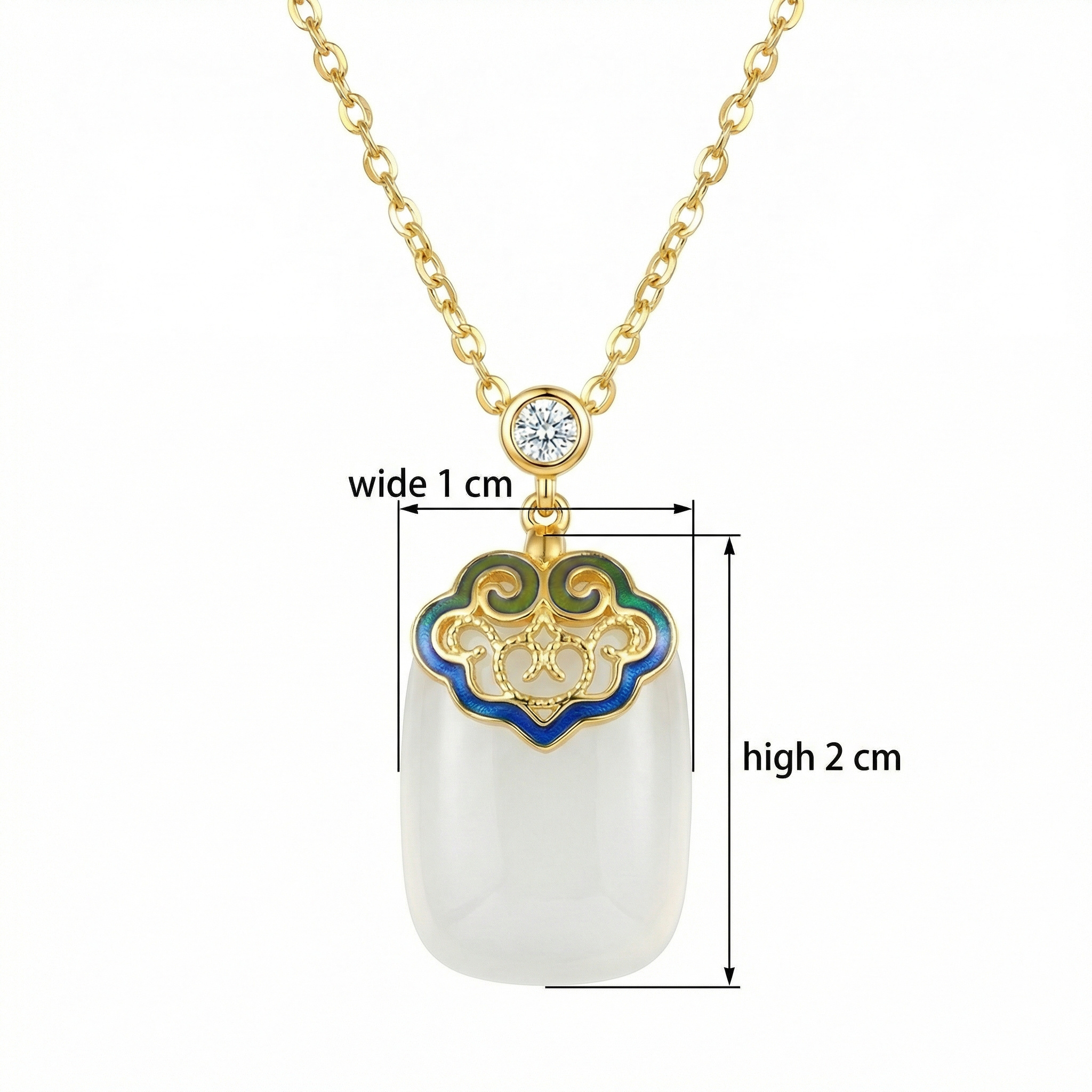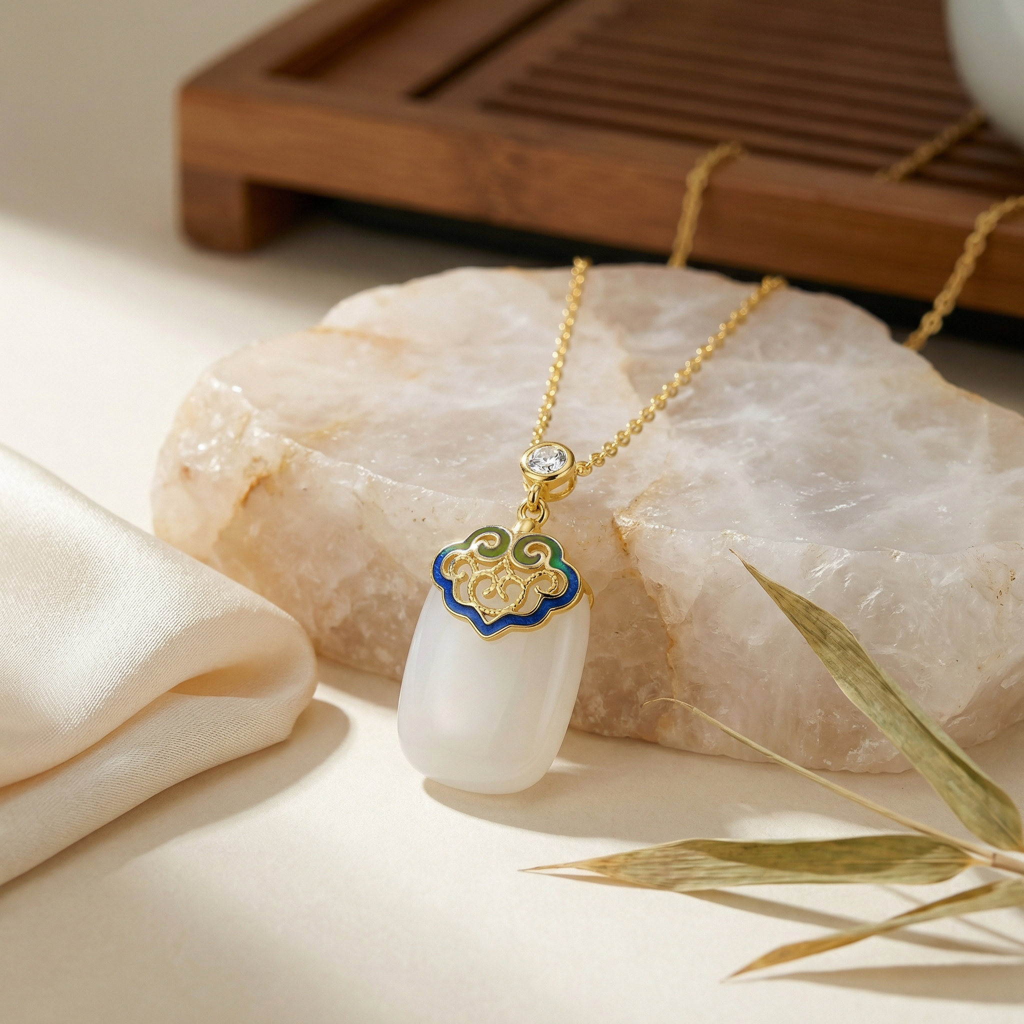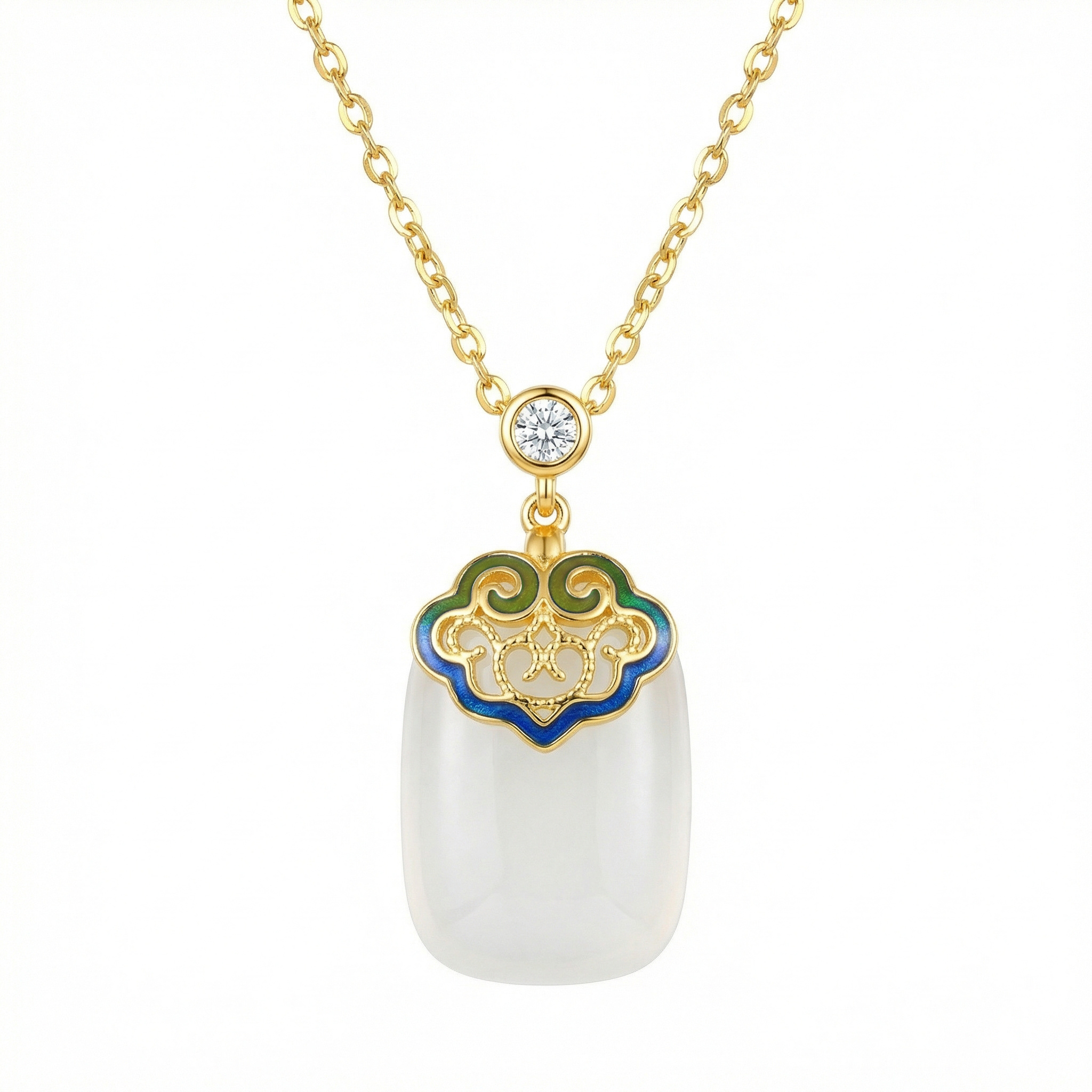 This exquisite necklace features a smooth, translucent white gemstone pendant, elegantly capped with a hand-painted blue enamel Ruyi motif. Symbolizing luck and harmony, the intricate blue detailing provides a vibrant contrast against the creamy stone. Above the pendant sits a brilliant-cut diamond, adding a touch of timeless sparkle to the design. The pendant is suspended from a delicate lustrous link chain, creating a refined and sophisticated look. Perfect for adding a touch of cultural heritage to modern attire, this piece combines traditional craftsmanship with contemporary elegance. Its harmonious blend of colors and textures makes it a standout accessory for any special occasion or daily wear. | Brand: jewelryodm