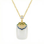 • This exquisite necklace features a smooth, translucent white gemstone pendant, elegantly capped with a hand-painted blue enamel Ruyi motif. Symbolizing luck and harmony, the intricate blue detailing provides a vibrant contrast against the creamy stone. Above the pendant sits a brilliant-cut diamond, adding a touch of timeless sparkle to the design. The pendant is suspended from a delicate lustrous link chain, creating a refined and sophisticated look. Perfect for adding a touch of cultural heritage to modern attire, this piece combines traditional craftsmanship with contemporary elegance. Its harmonious blend of colors and textures makes it a standout accessory for any special occasion or daily wear. | Brand: jewelryodm