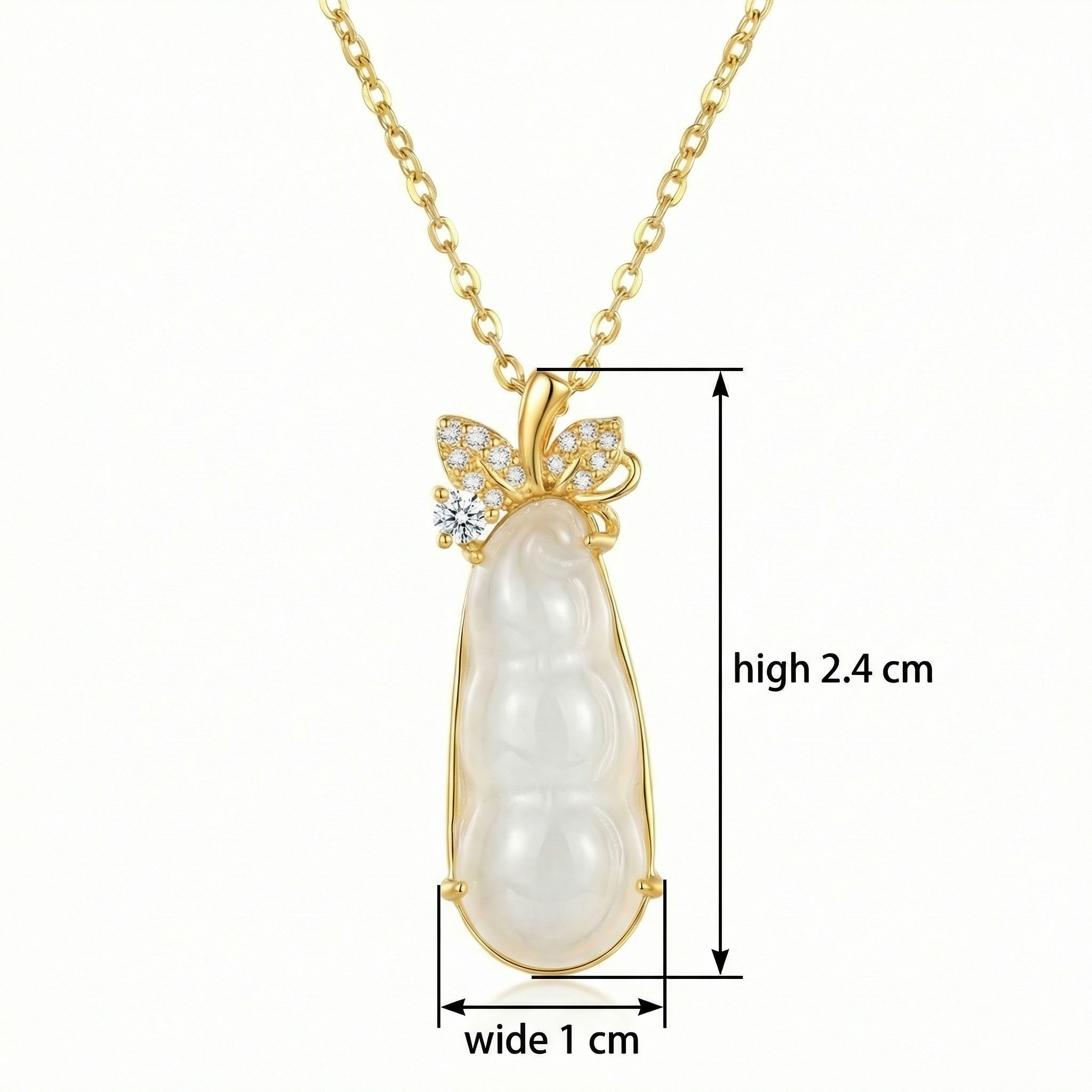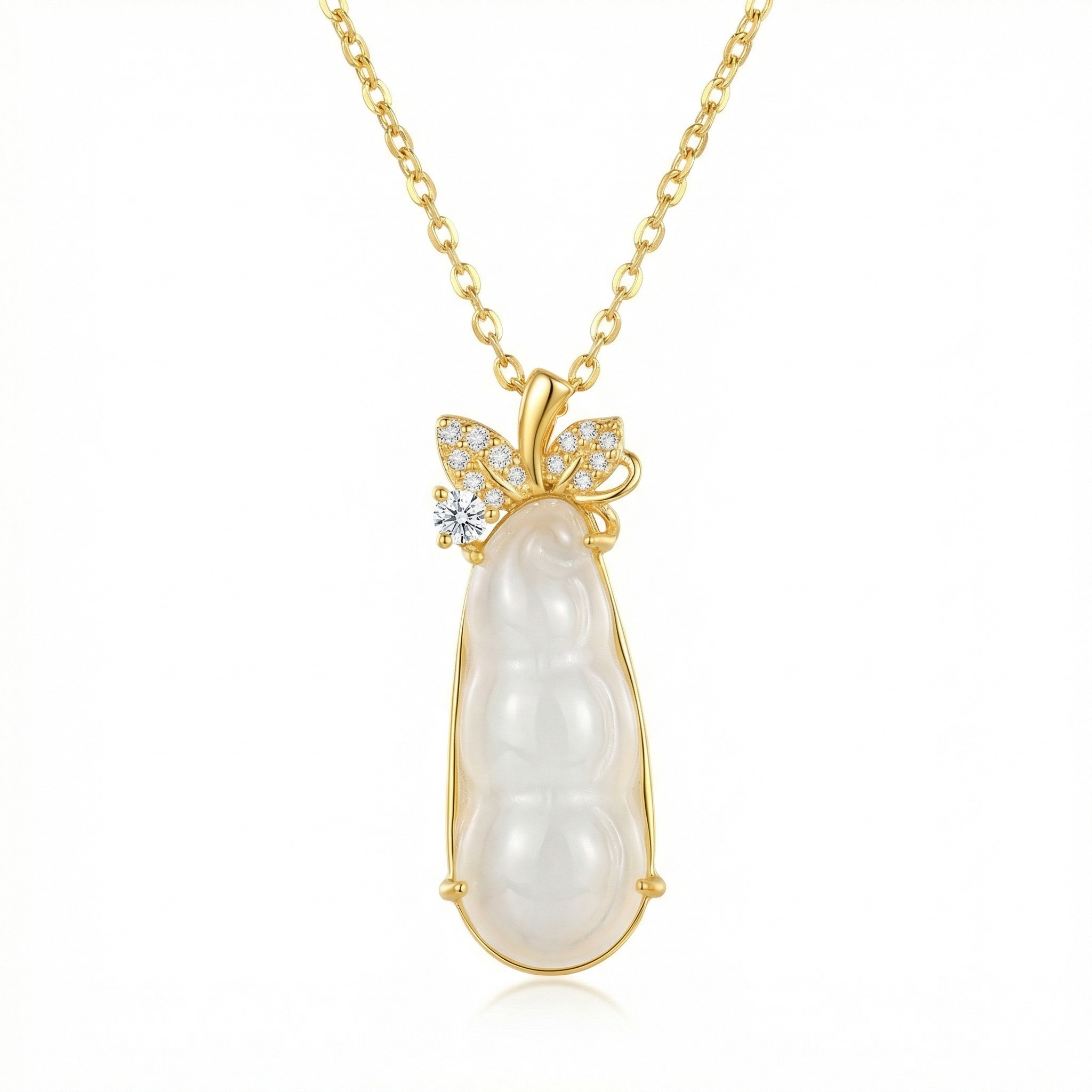 This exquisite necklace features a beautifully carved pea pod pendant, crafted from a lustrous white gemstone that radiates a soft, milky glow. The organic shape is encased in a polished metallic frame, showcasing fine craftsmanship. At the top of the pendant, a delicate leaf motif is encrusted with shimmering pavé-set diamonds, complemented by a larger, brilliant-cut solitaire diamond that catches the light with every movement. Symbolizing prosperity and a harmonious family life, the pea pod design is both meaningful and stylish. Suspended from a refined link chain, this piece blends traditional symbolism with contemporary elegance. Whether worn for a special occasion or as an everyday statement, this timeless accessory adds a touch of sophisticated charm to any ensemble, making it a perfect gift for those who appreciate nature-inspired jewelry and delicate detailing. | Brand: jewelryodm