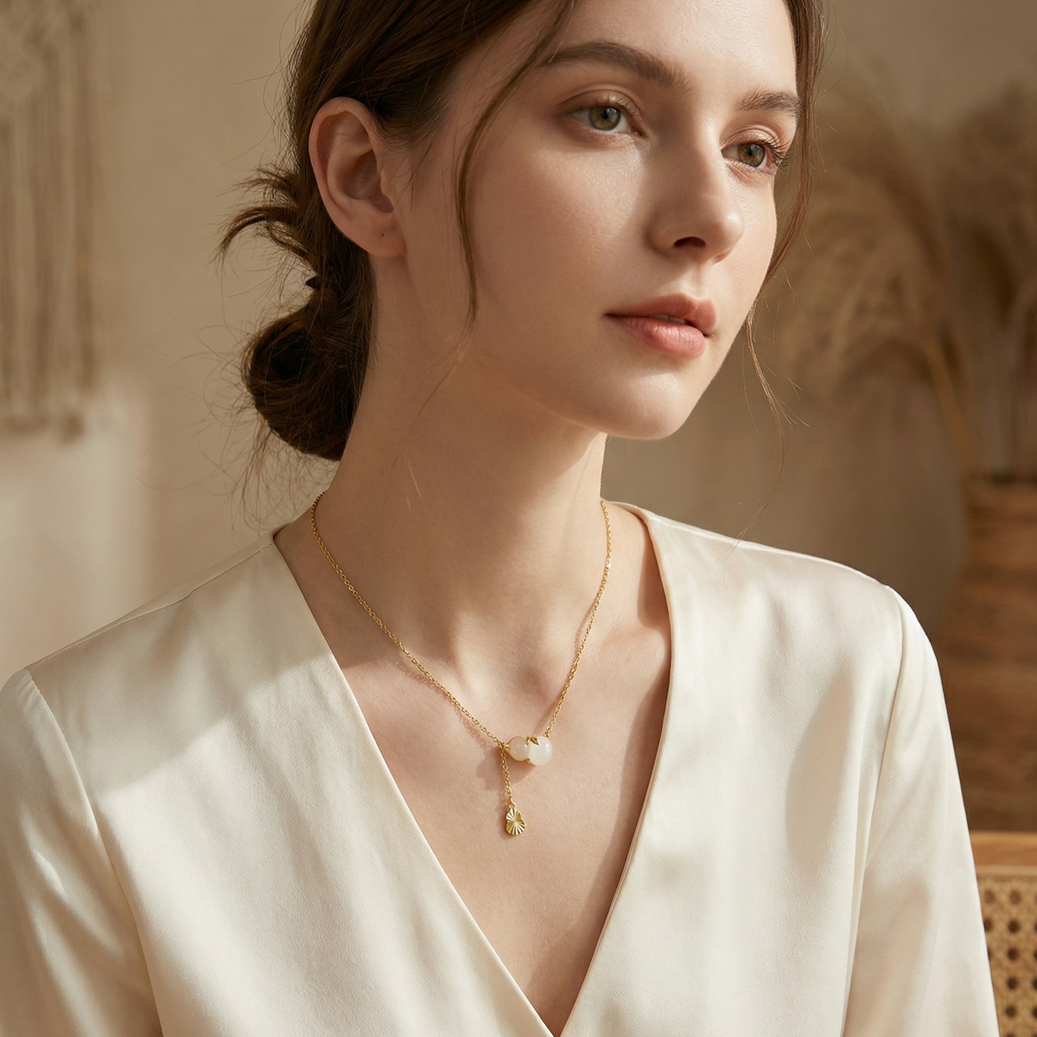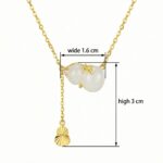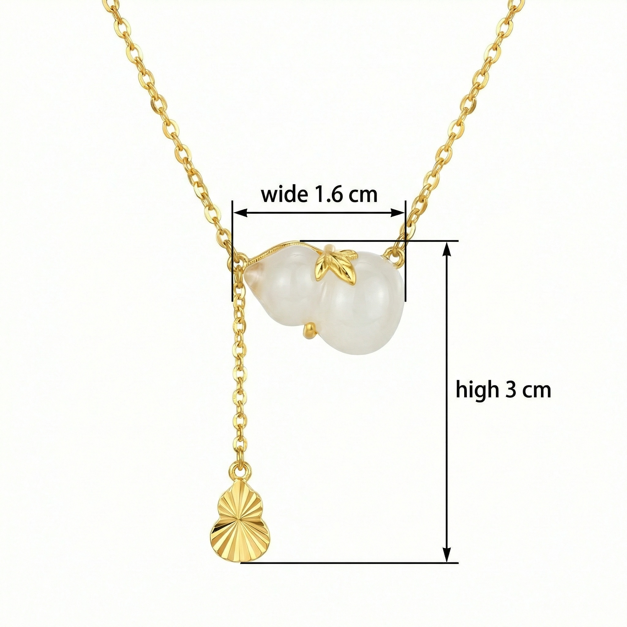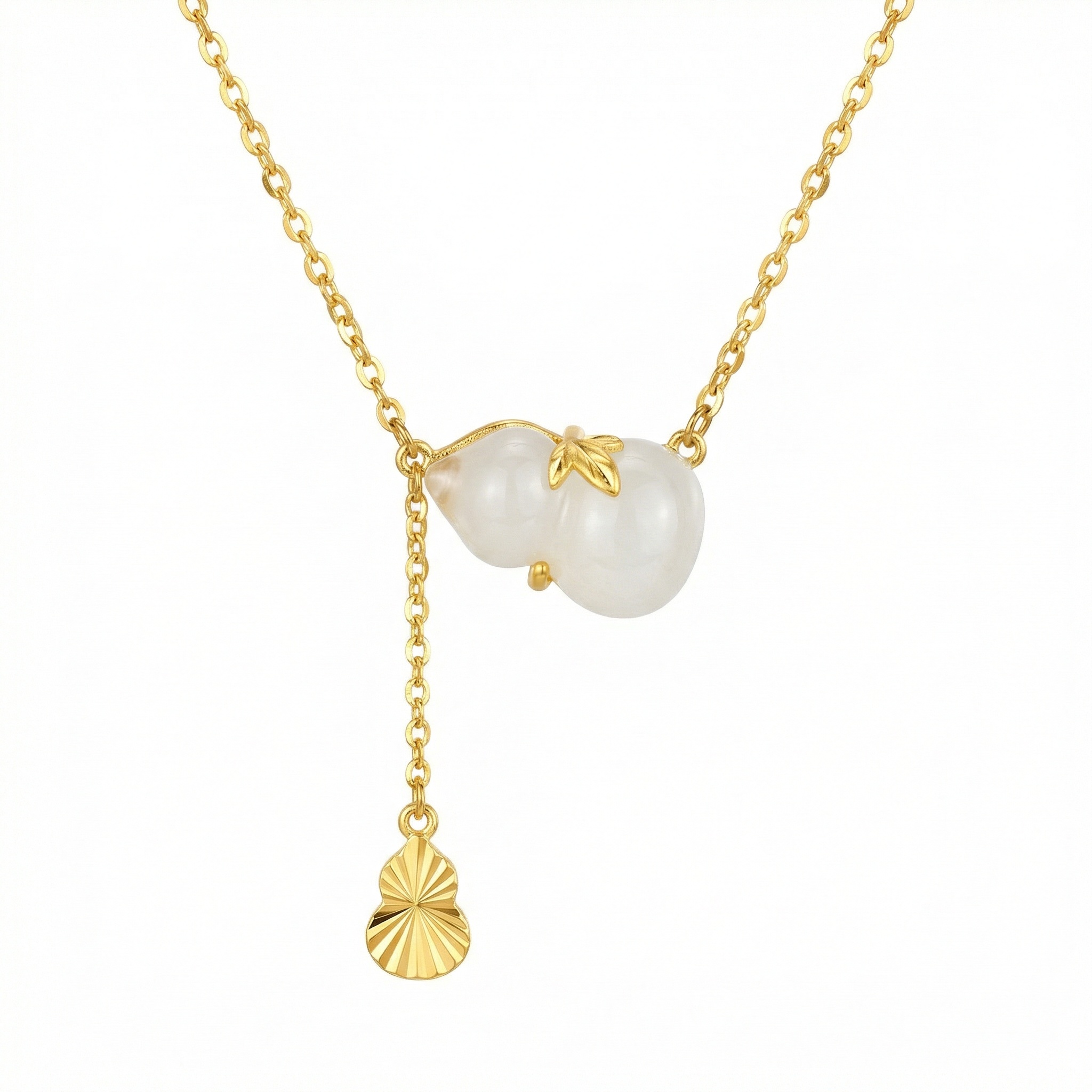 This exquisite necklace features a beautifully crafted double gourd pendant, a traditional symbol of longevity and prosperity. The main piece is carved from a lustrous, milky-white stone that glows with a soft radiance. A delicate metallic leaf rests atop the gourd, adding a touch of nature-inspired elegance. The fine chain is complemented by a secondary dangling element, showcasing a smaller, textured gourd charm that adds movement and charm to the piece. Perfectly balancing modern aesthetics with timeless cultural symbolism, this piece is an ideal accessory for those seeking elegance with a deeper meaning. Its refined silhouette makes it suitable for both daily wear and special occasions, offering a sophisticated touch to any ensemble. | Brand: jewelryodm
