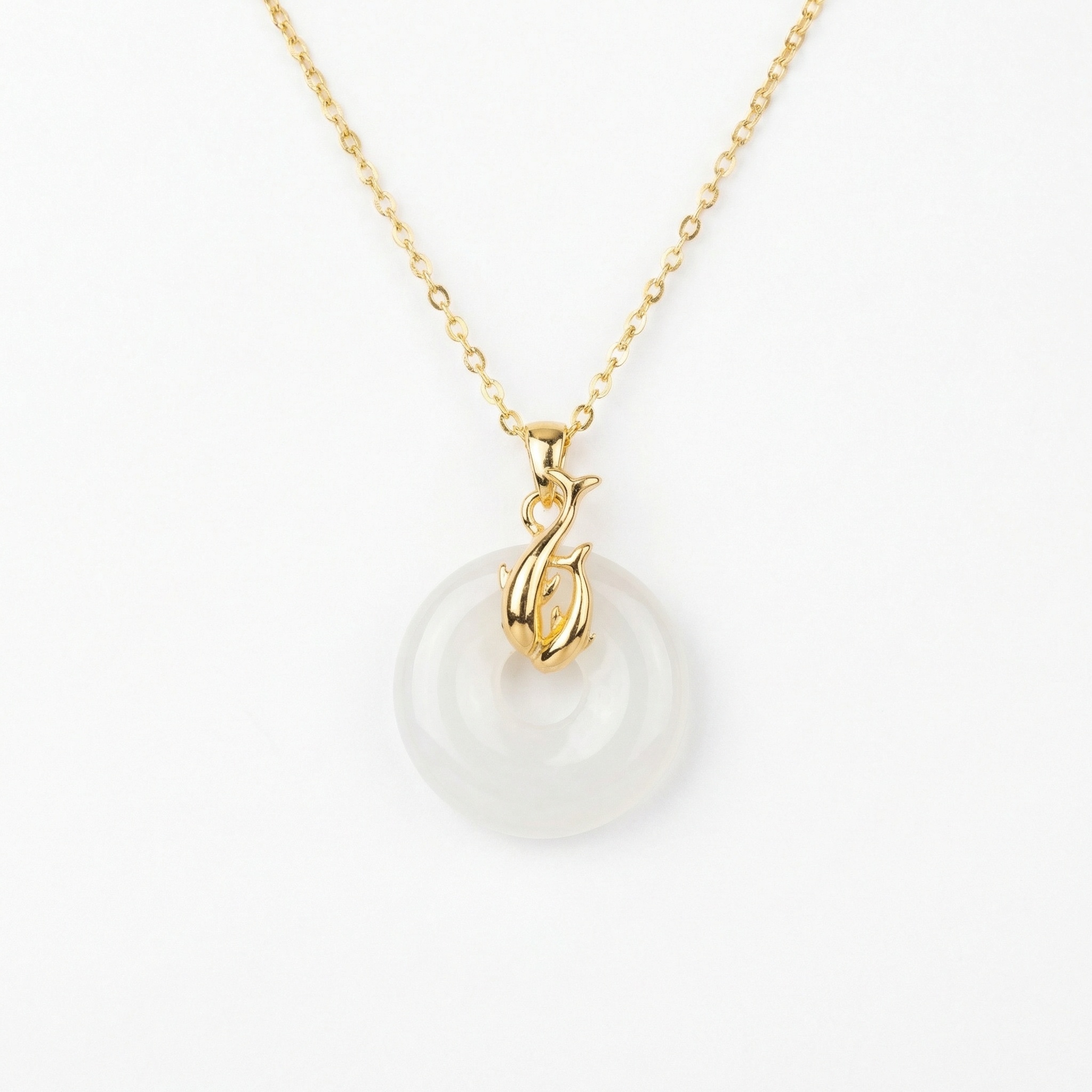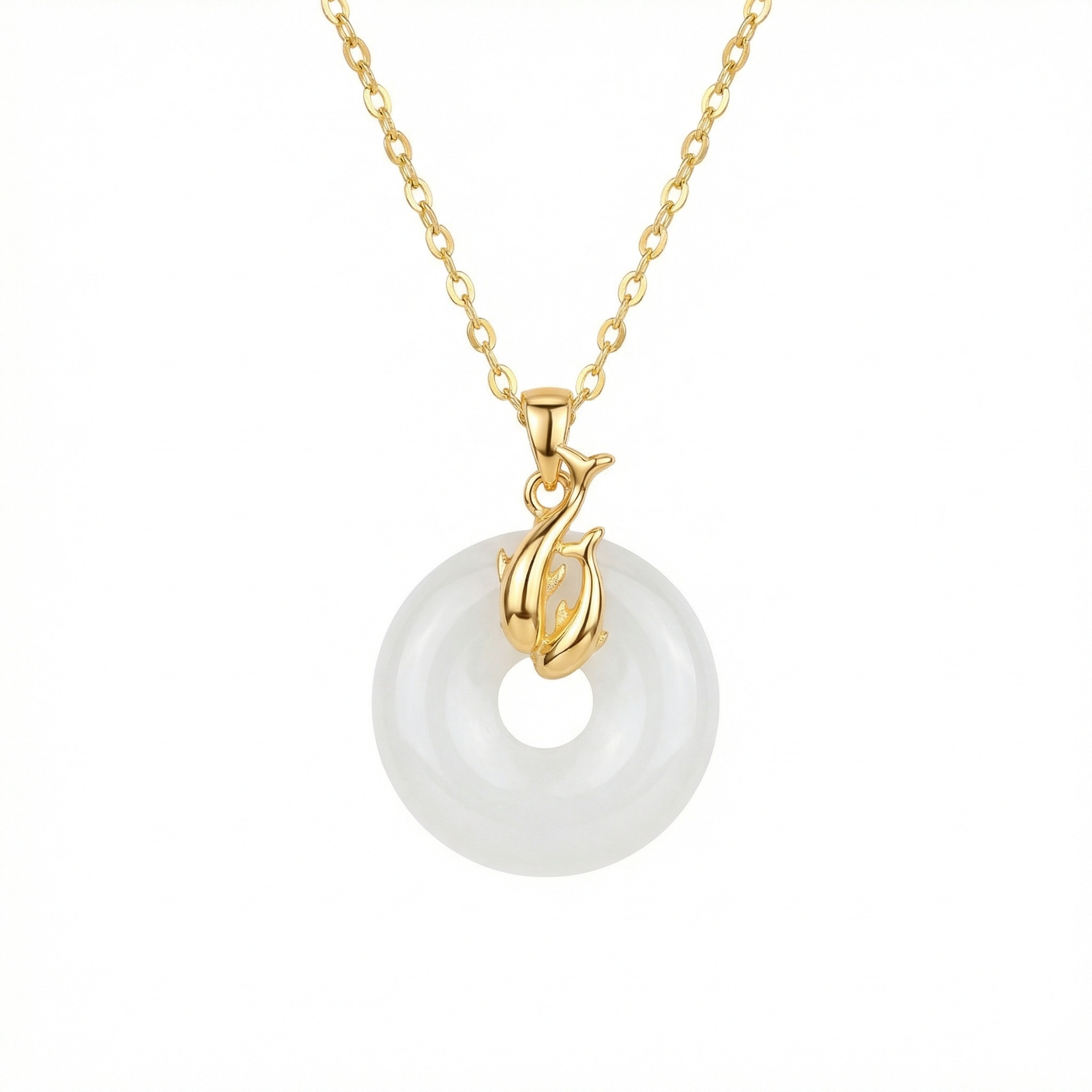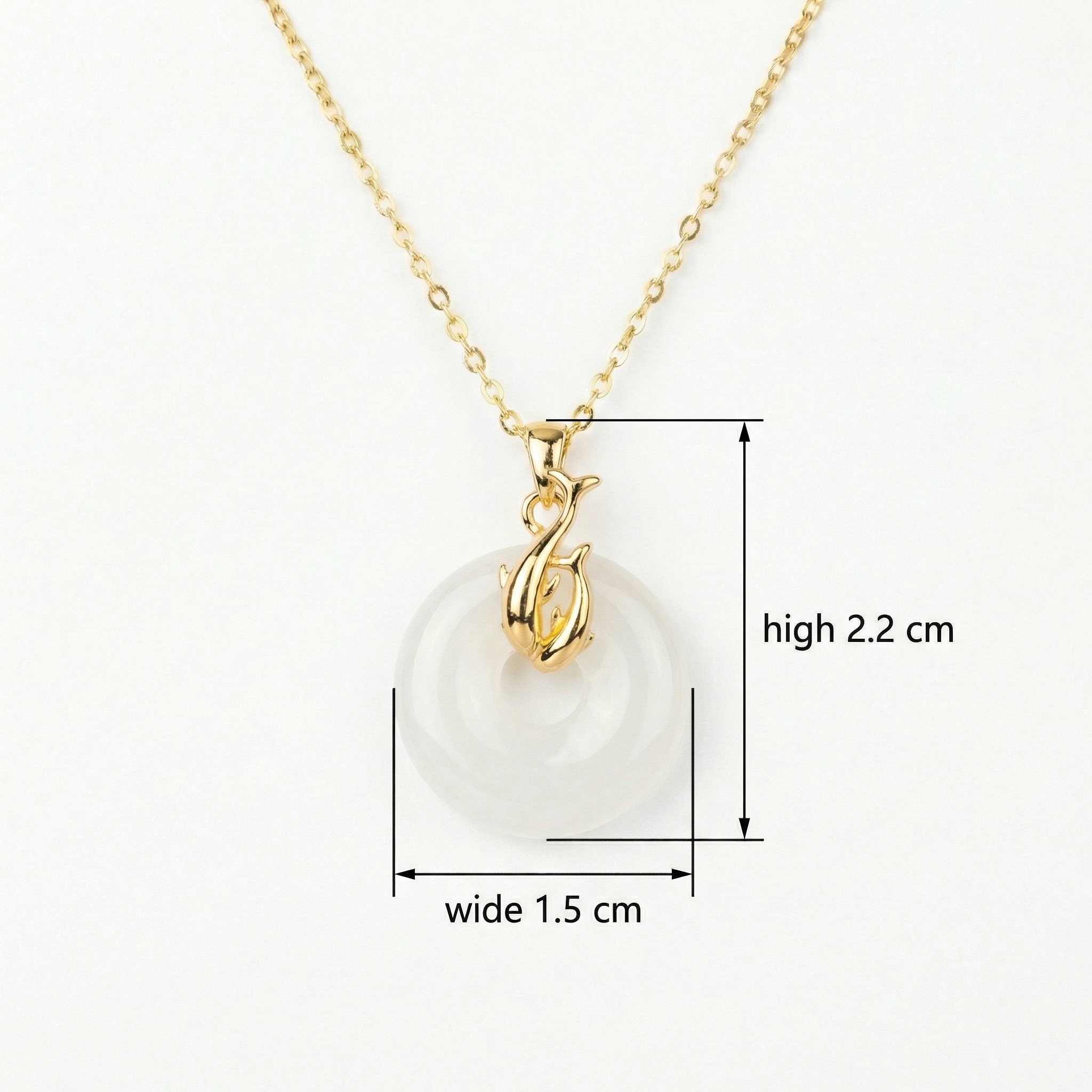 This elegant necklace features a beautifully polished white jade donut pendant, a classic symbol of harmony and longevity. The pendant is held by a unique bail designed with two intricate dolphins, adding a touch of maritime charm and grace to the piece. The metallic accents provide a stunning contrast against the milky white translucence of the natural stone. Suspended from a slender, matching chain, this necklace is both versatile and meaningful, making it suitable for daily wear or special occasions. Its minimalist yet symbolic design captures the essence of tranquility and playfulness, offering a timeless aesthetic that resonates with nature lovers and jewelry enthusiasts alike. A perfect gift to convey protection and joy, this piece is a testament to delicate craftsmanship and serene beauty. | Brand: jewelryodm