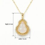 • This stunning necklace features a translucent white jade-style gourd pendant, a traditional symbol of prosperity and longevity. The central hulu-shaped stone is cradled within a masterfully crafted metallic frame, showcasing intricate filigree patterns that add a touch of vintage sophistication. Encircling the ornate openwork is a radiant halo of brilliant pavé-set crystals that catch the light from every angle, creating a mesmerizing sparkle. Suspended from a delicate matching link chain, this piece blends cultural heritage with modern luxury. Its warm metallic finish perfectly complements the serene purity of the center stone, making it an ideal accessory for both formal occasions and everyday elegance. This pendant is not just a beautiful piece of jewelry but a meaningful talisman designed to bring grace and good fortune to the wearer. | Brand: jewelryodm