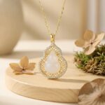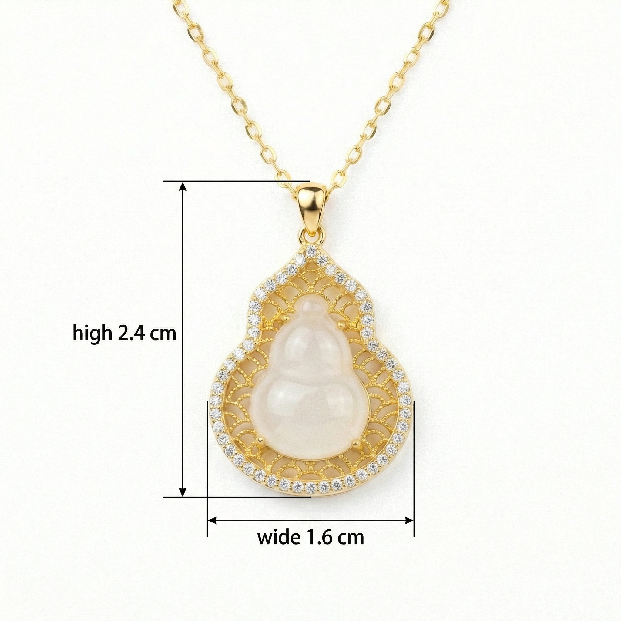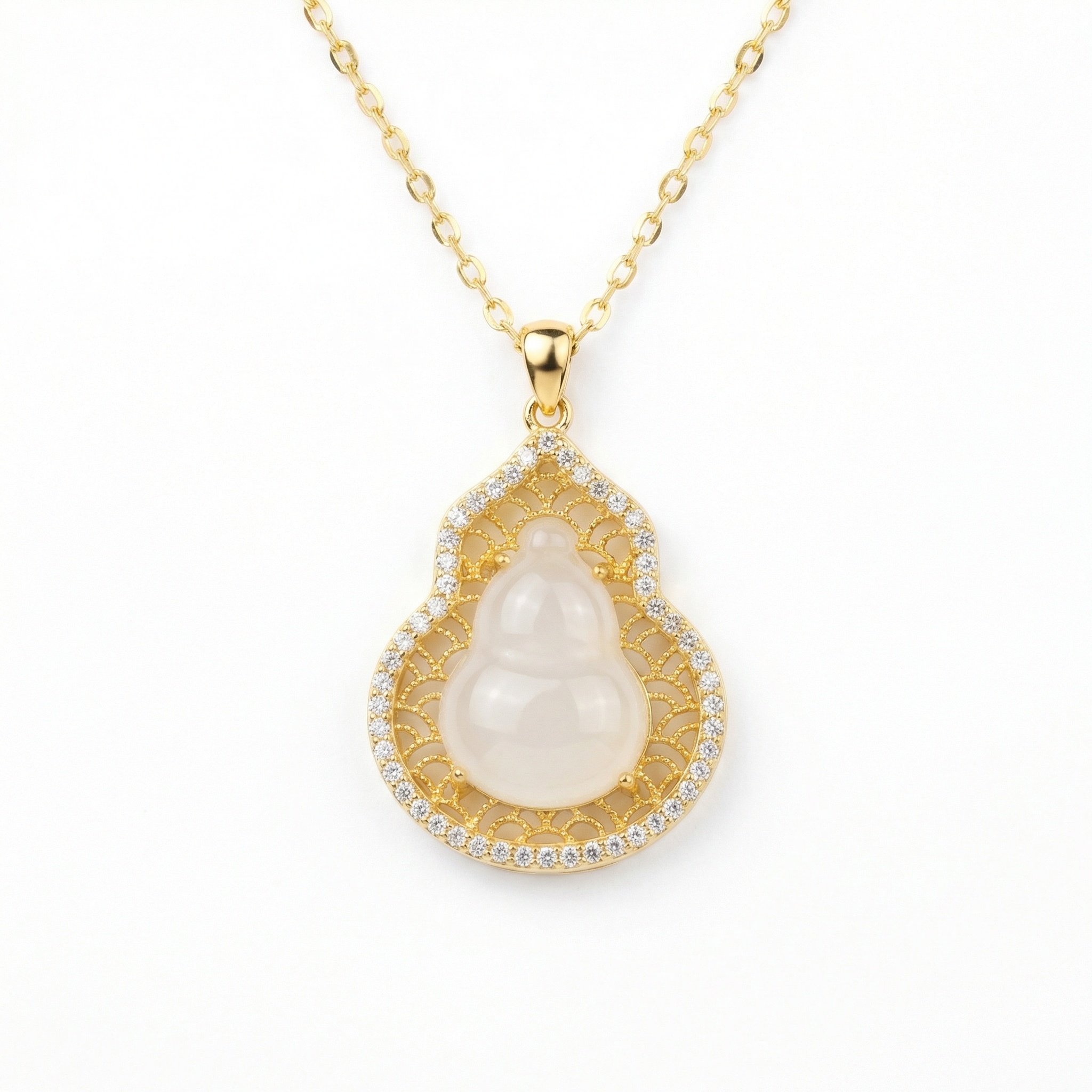 This stunning necklace features a translucent white jade-style gourd pendant, a traditional symbol of prosperity and longevity. The central hulu-shaped stone is cradled within a masterfully crafted metallic frame, showcasing intricate filigree patterns that add a touch of vintage sophistication. Encircling the ornate openwork is a radiant halo of brilliant pavé-set crystals that catch the light from every angle, creating a mesmerizing sparkle. Suspended from a delicate matching link chain, this piece blends cultural heritage with modern luxury. Its warm metallic finish perfectly complements the serene purity of the center stone, making it an ideal accessory for both formal occasions and everyday elegance. This pendant is not just a beautiful piece of jewelry but a meaningful talisman designed to bring grace and good fortune to the wearer. | Brand: jewelryodm