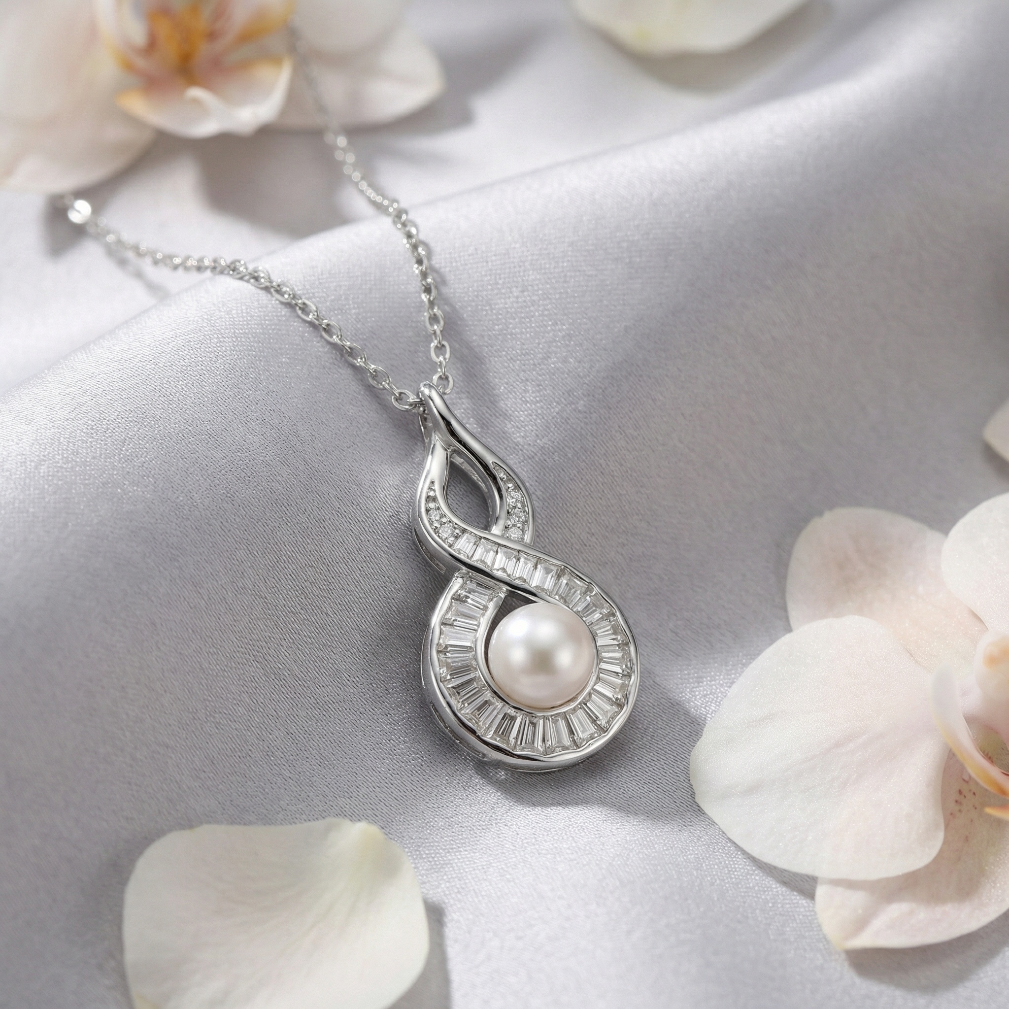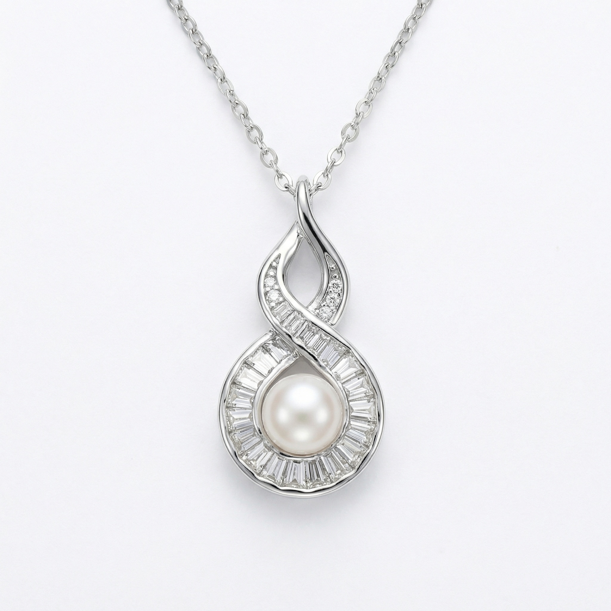 • This exquisite necklace features a luminous white pearl at its center, cradled within a gracefully twisted teardrop pendant. Crafted from polished silver-toned metal, the design incorporates an infinity-inspired motif embellished with a brilliant array of channel-set baguette diamonds and shimmering round accents. The combination of the smooth, iridescent pearl and the architectural sparkle of the baguette stones creates a sophisticated and timeless aesthetic. Suspended from a delicate link chain, this piece is an ideal choice for formal occasions, bridal wear, or as a luxurious gift for someone special. Its refined craftsmanship and classic appeal ensure it remains a cherished staple in any jewelry collection. | Brand: jewelryodm