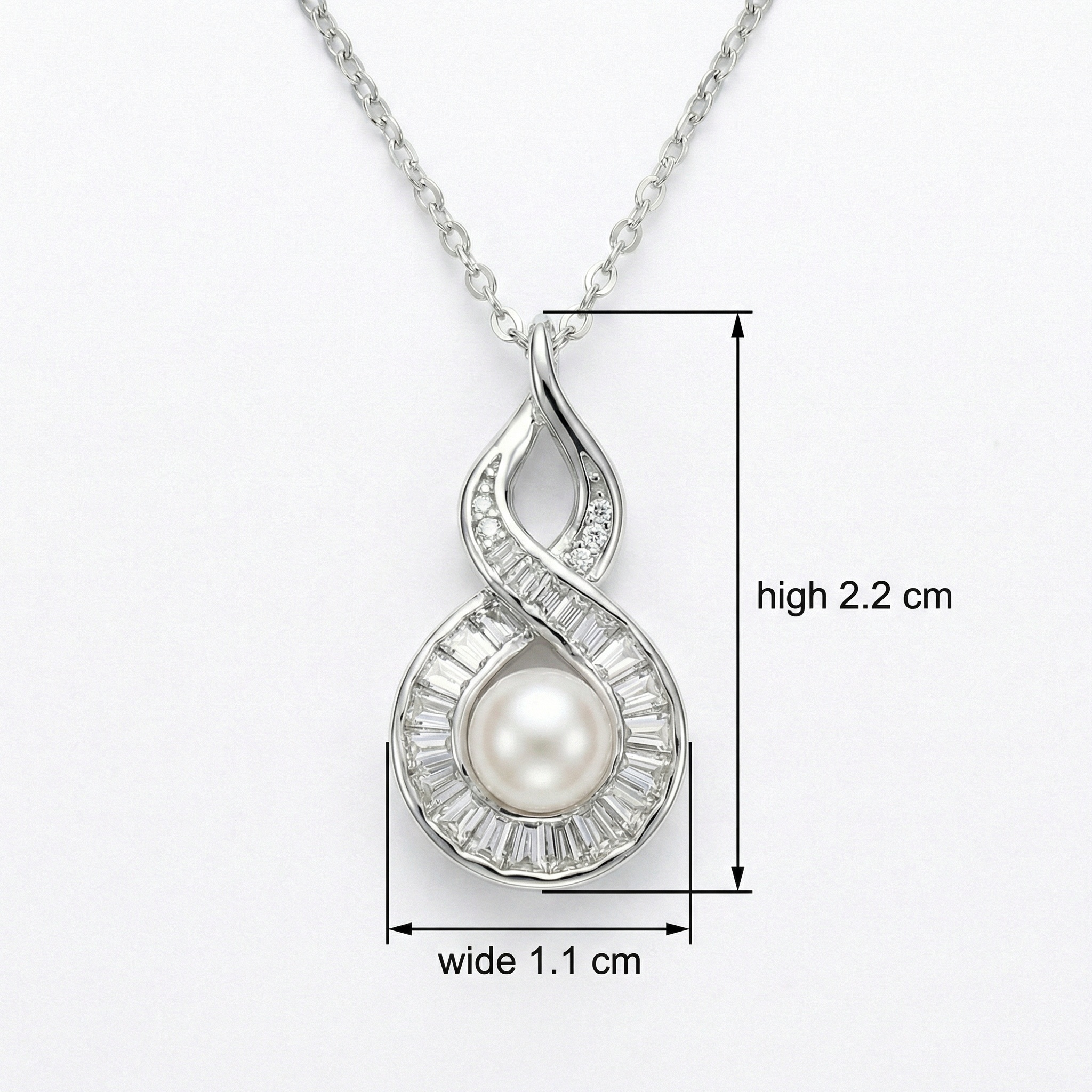 925 Sterling Silver Elegant White Pearl and Baguette Diamond Infinity Twist Pendant Necklace