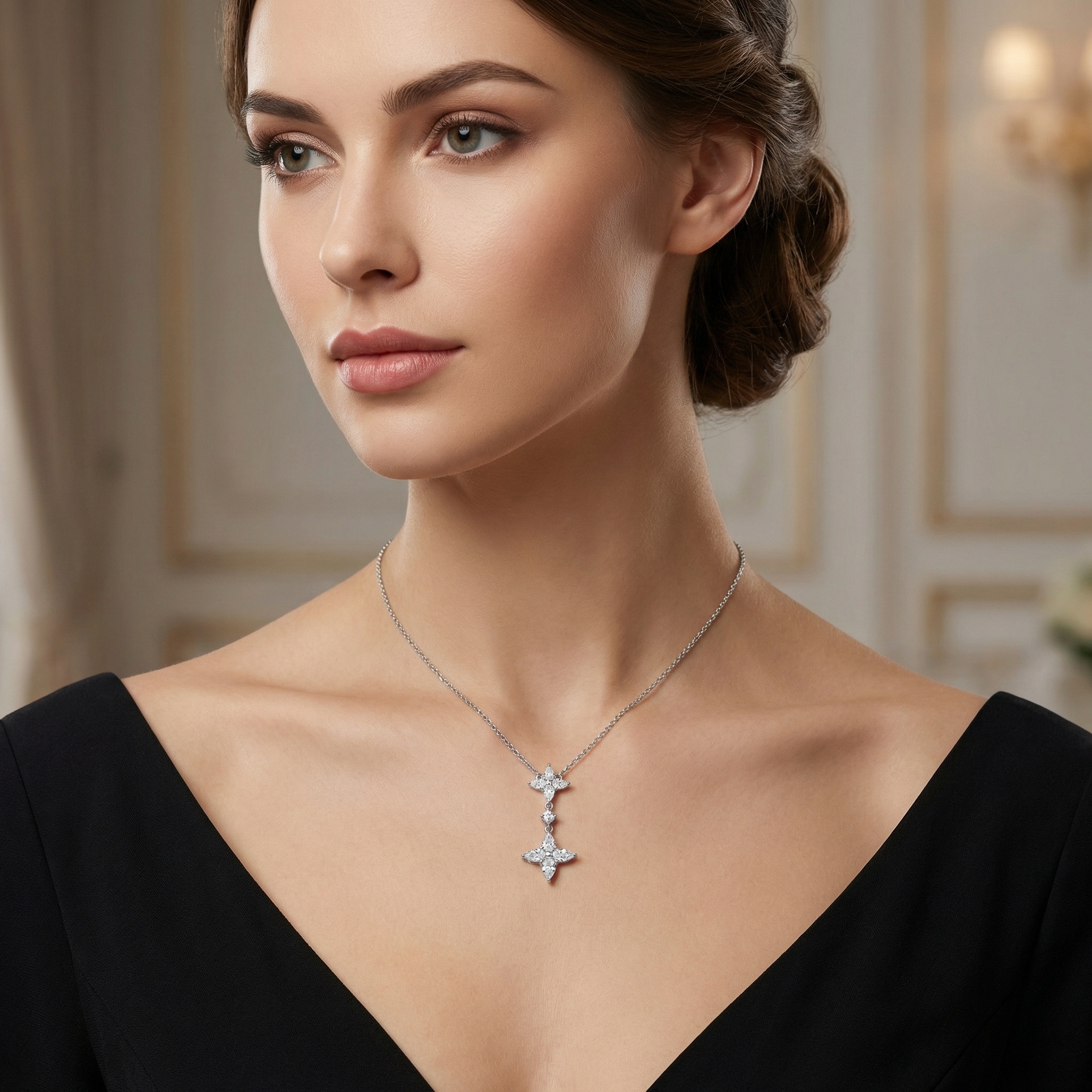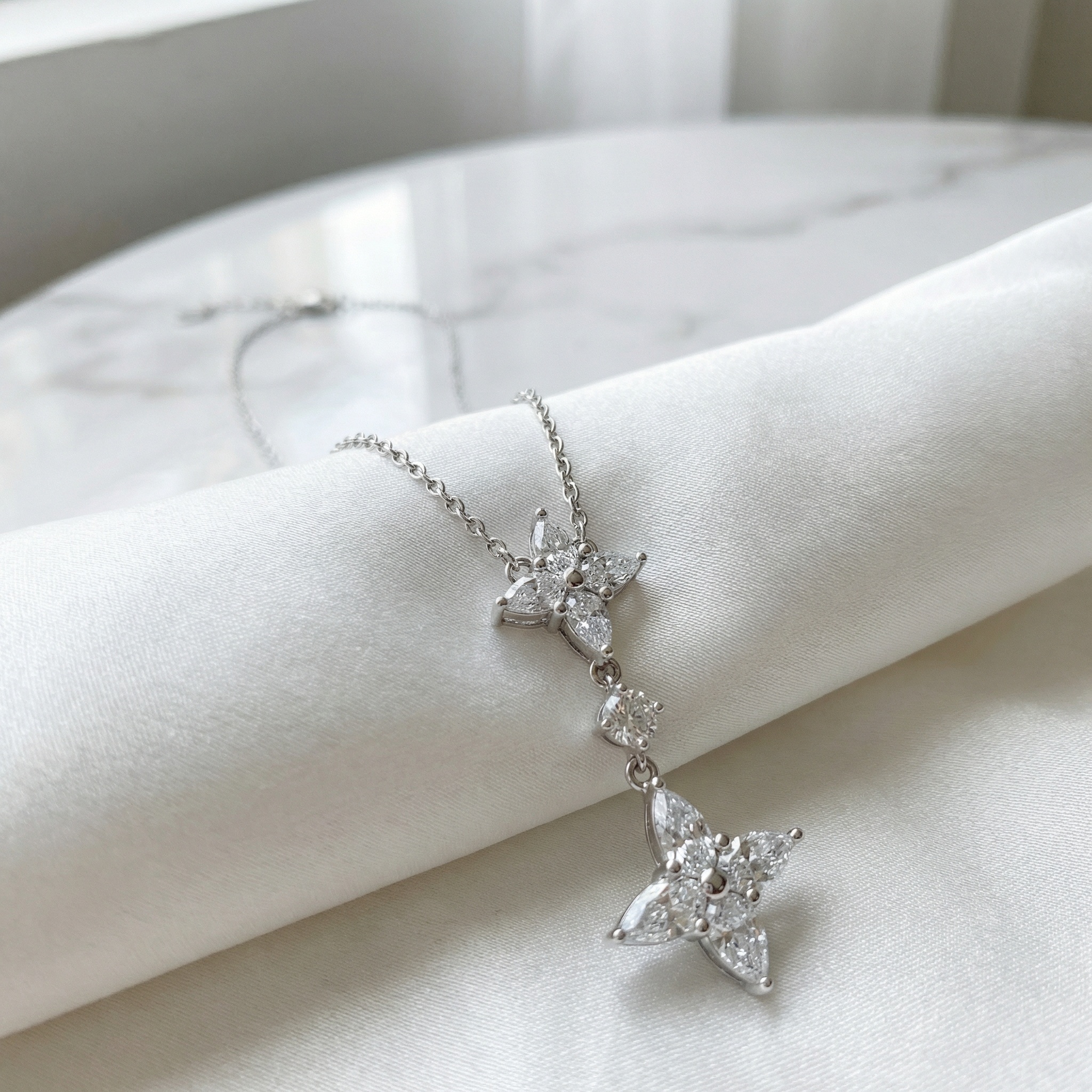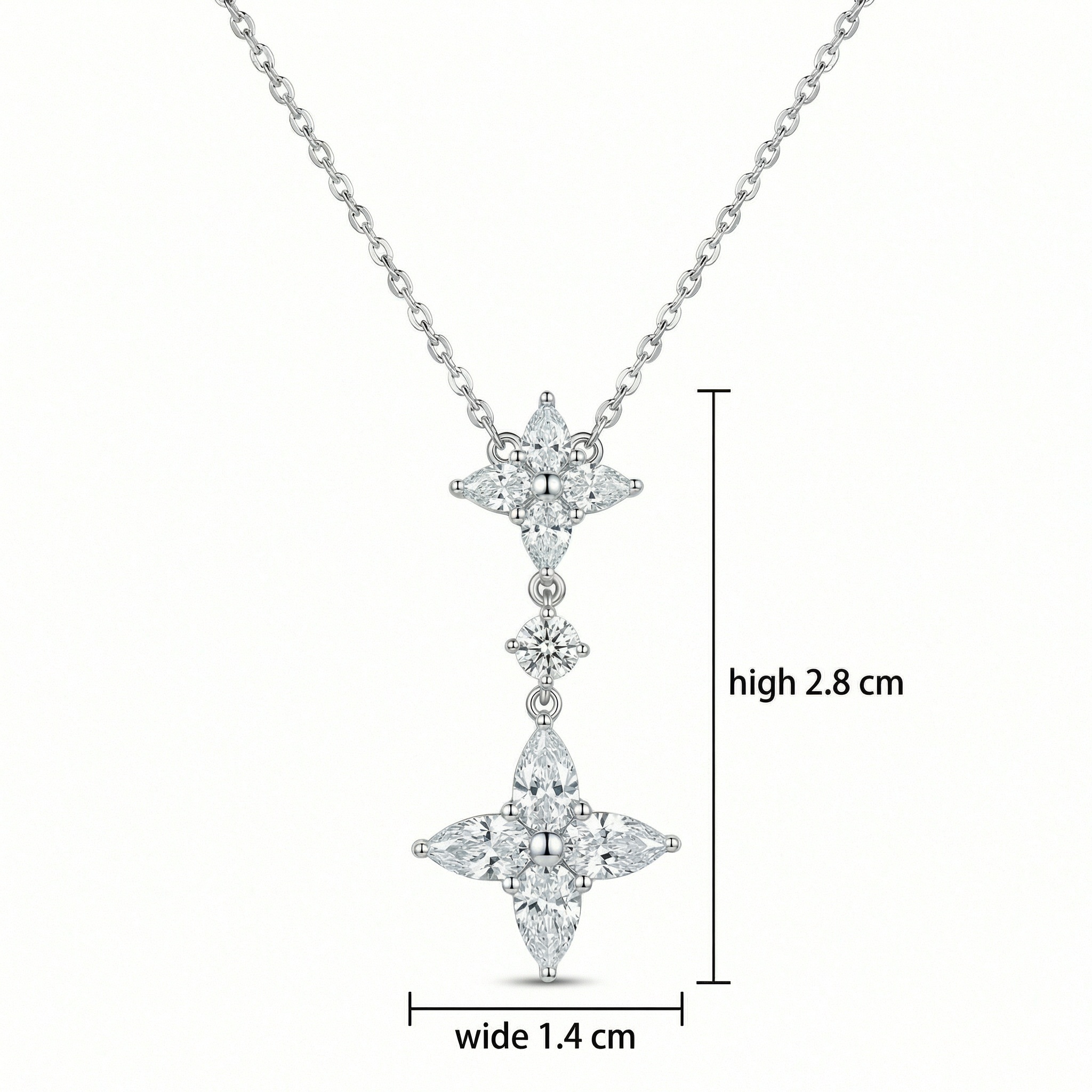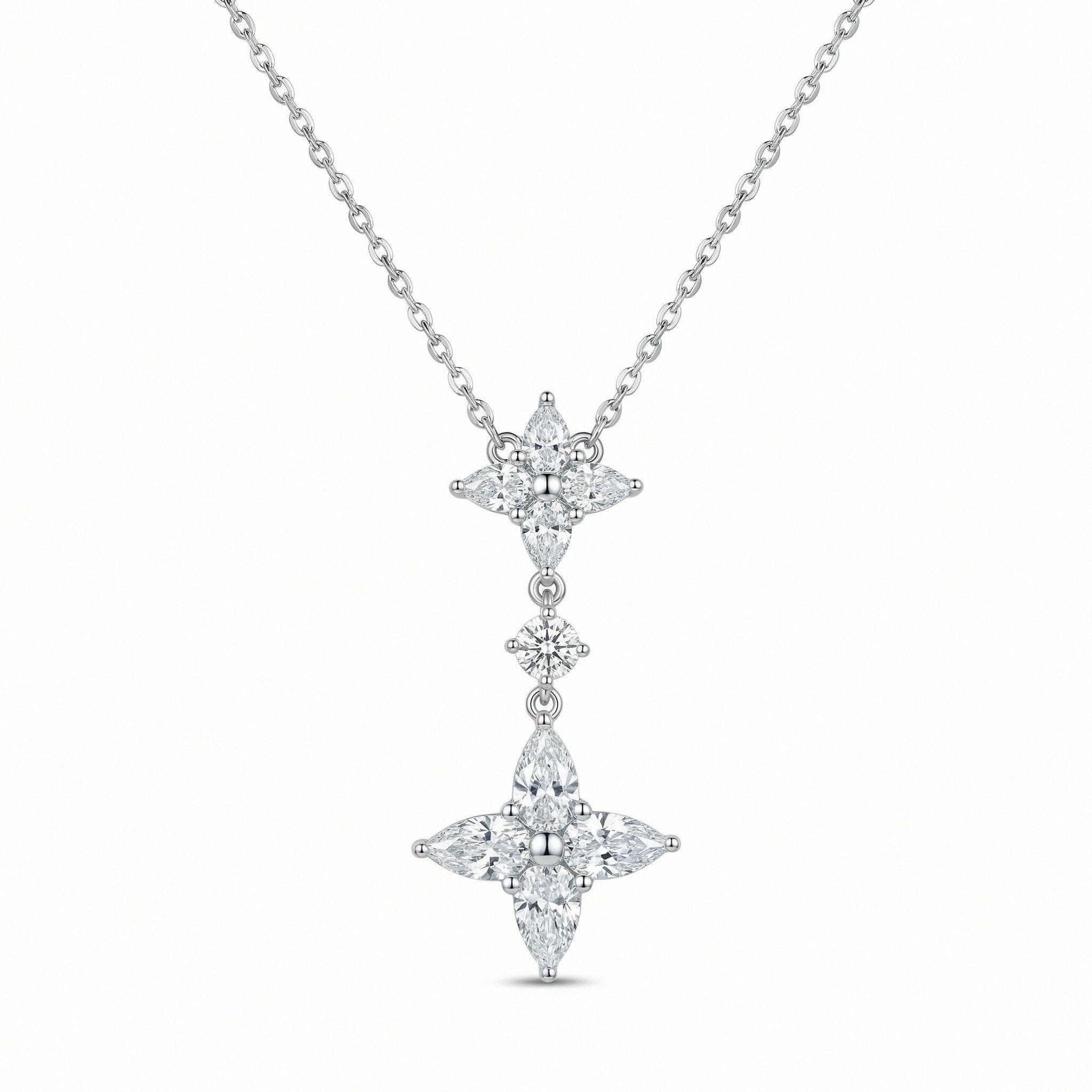 • This stunning necklace features a sophisticated drop design crafted in high-quality silver-toned metal. The centerpiece showcases two intricate floral-inspired clusters, each meticulously set with four shimmering marquise-cut stones arranged in a delicate star pattern. A single brilliant round-cut stone connects the two motifs, adding fluid movement and an extra touch of radiance. The polished finish enhances the brilliant sparkle of the stones, creating a timeless and luxurious look. Perfect for formal occasions, weddings, or as a sophisticated gift, this piece dangles gracefully from a classic cable chain. Its refined craftsmanship and elegant floral motif embody grace and eternal beauty, making it a versatile addition to any fine jewelry collection. | Brand: jewelryodm