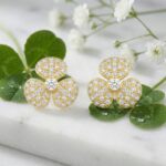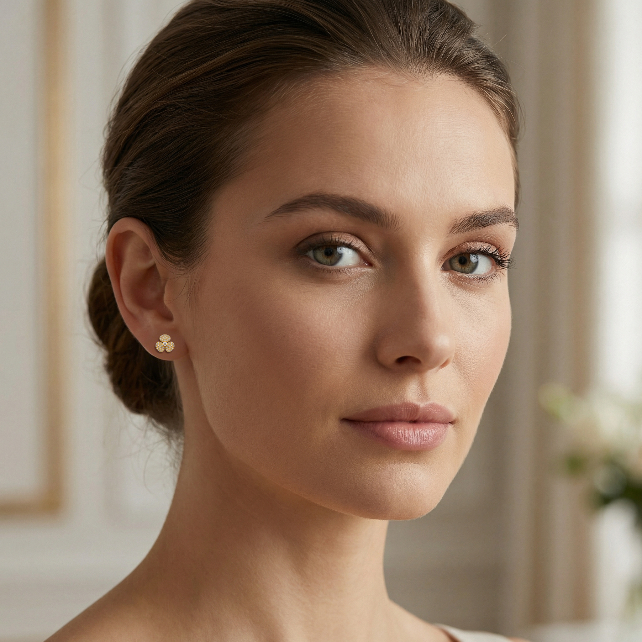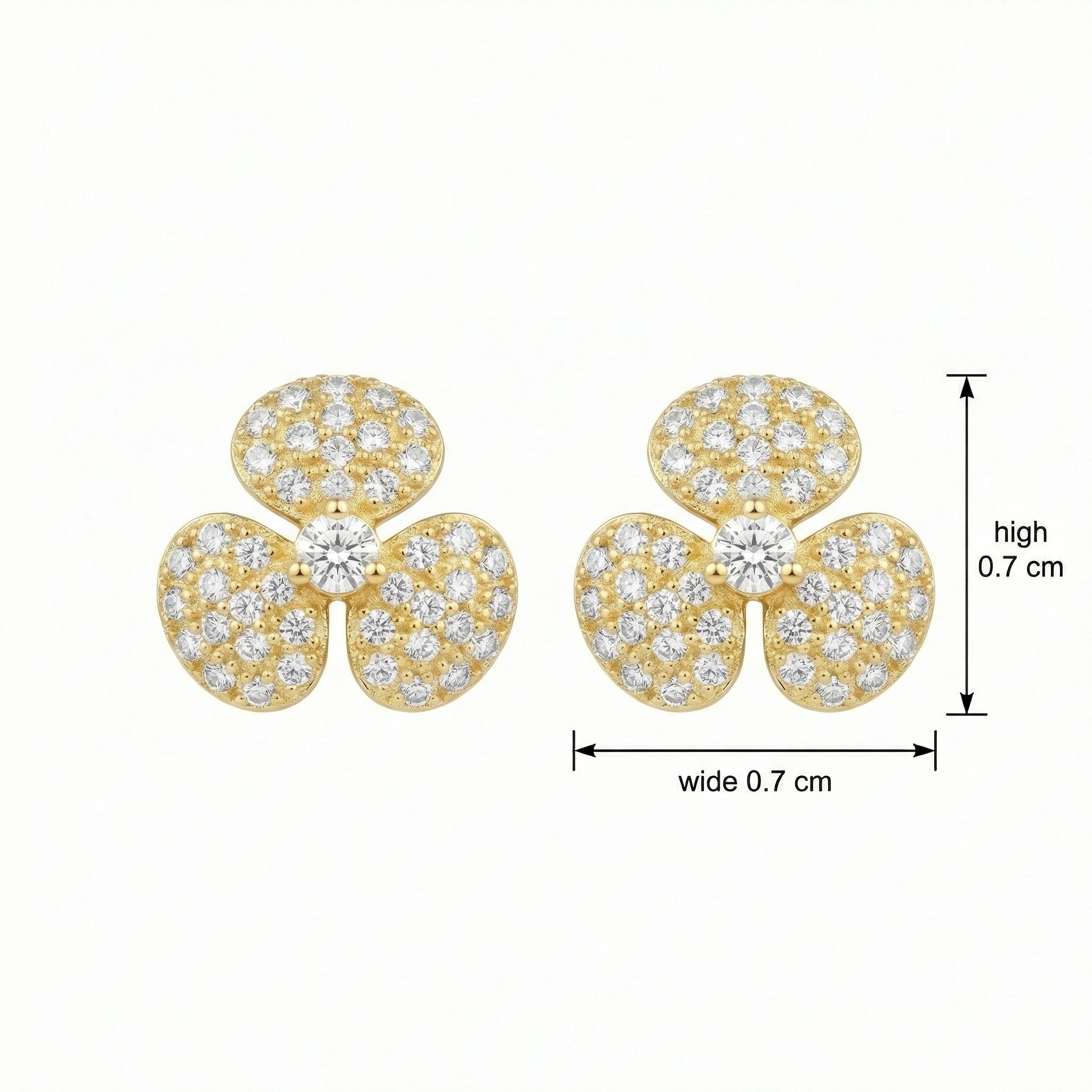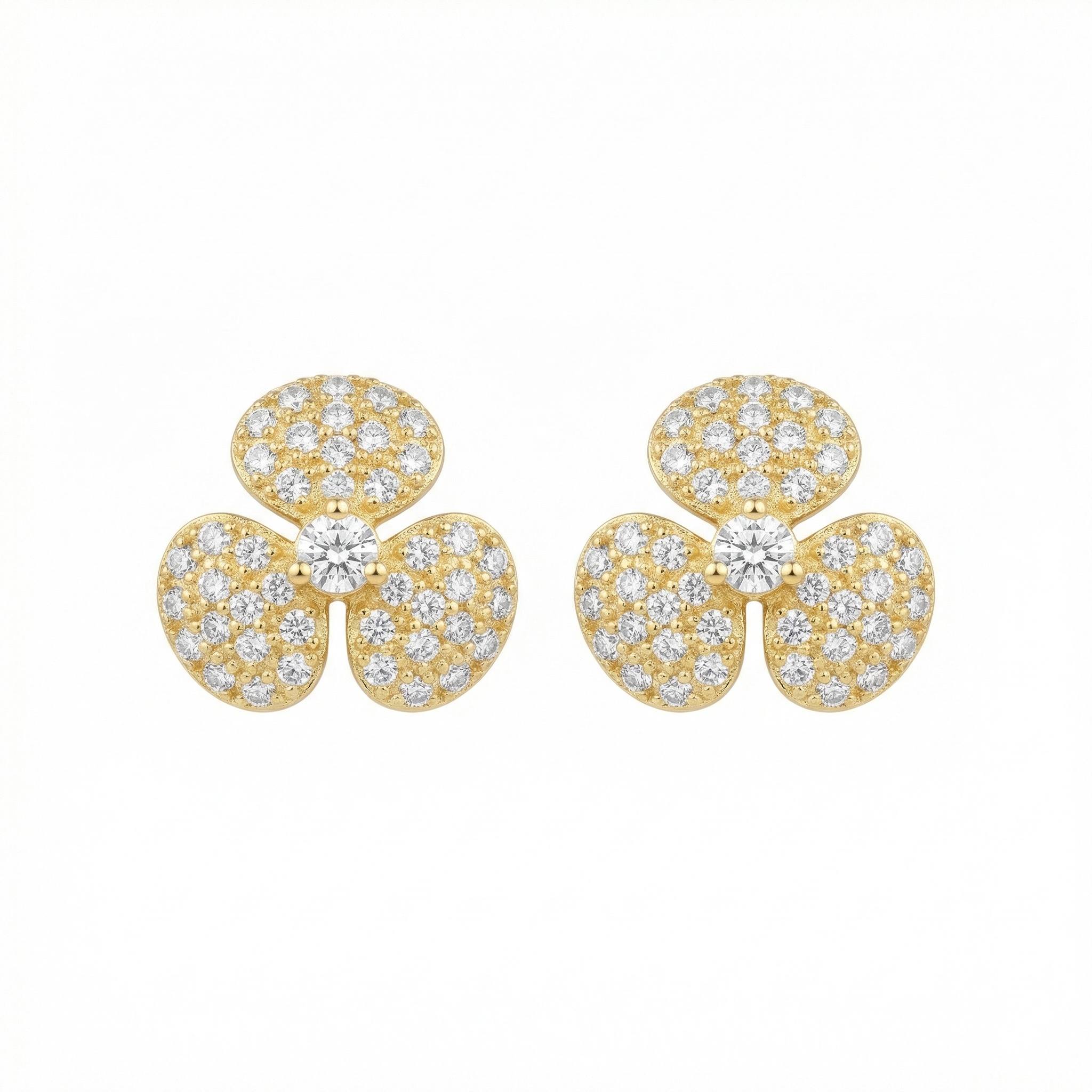 • These exquisite earrings showcase a delicate floral design inspired by the classic trifoil shape. Each of the three rounded petals is meticulously pavé-set with shimmering round diamonds, catching the light from every angle. At the heart of each piece lies a larger, brilliant-cut central diamond held securely in a classic prong setting, creating a focal point of intense brilliance. The warm-toned metallic finish complements the sparkling stones, exuding timeless elegance and sophistication. The combination of intricate pavé work and a prominent center stone makes them an ideal choice for adding a touch of luxury to both everyday ensembles and special evening attire. Whether worn as a personal statement or gifted to a loved one, these botanical-inspired earrings offer a radiant charm that captures the essence of classic beauty. | Brand: jewelryodm