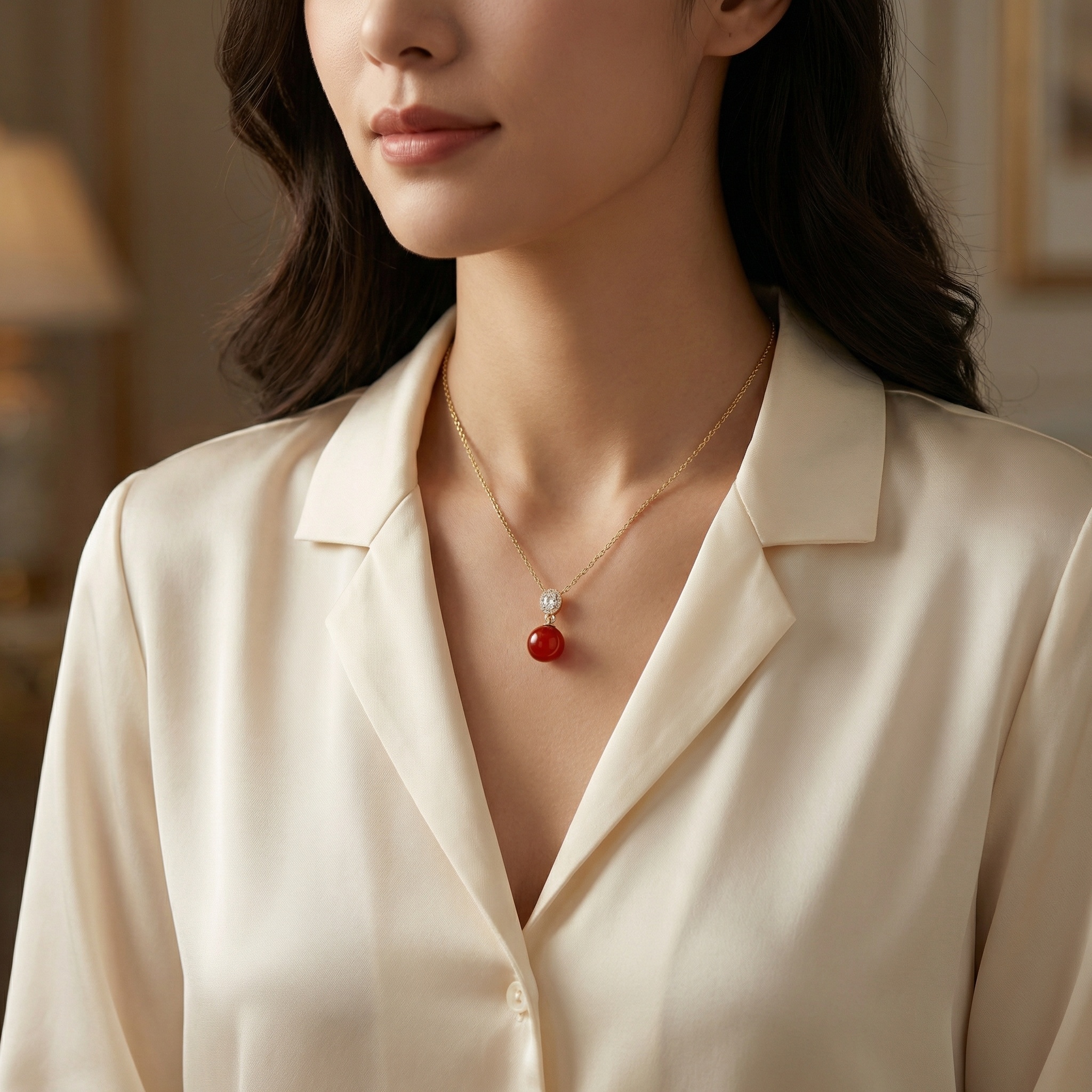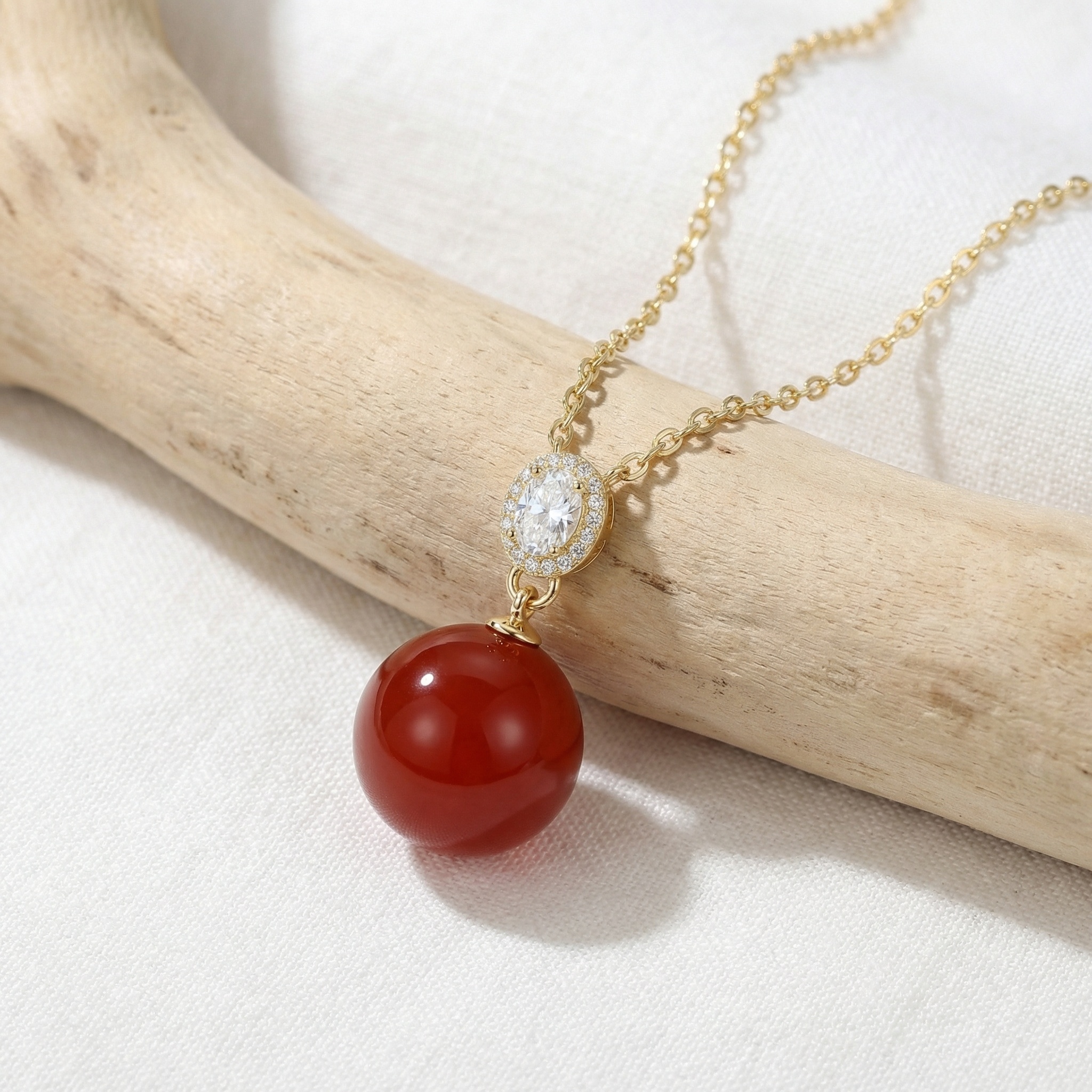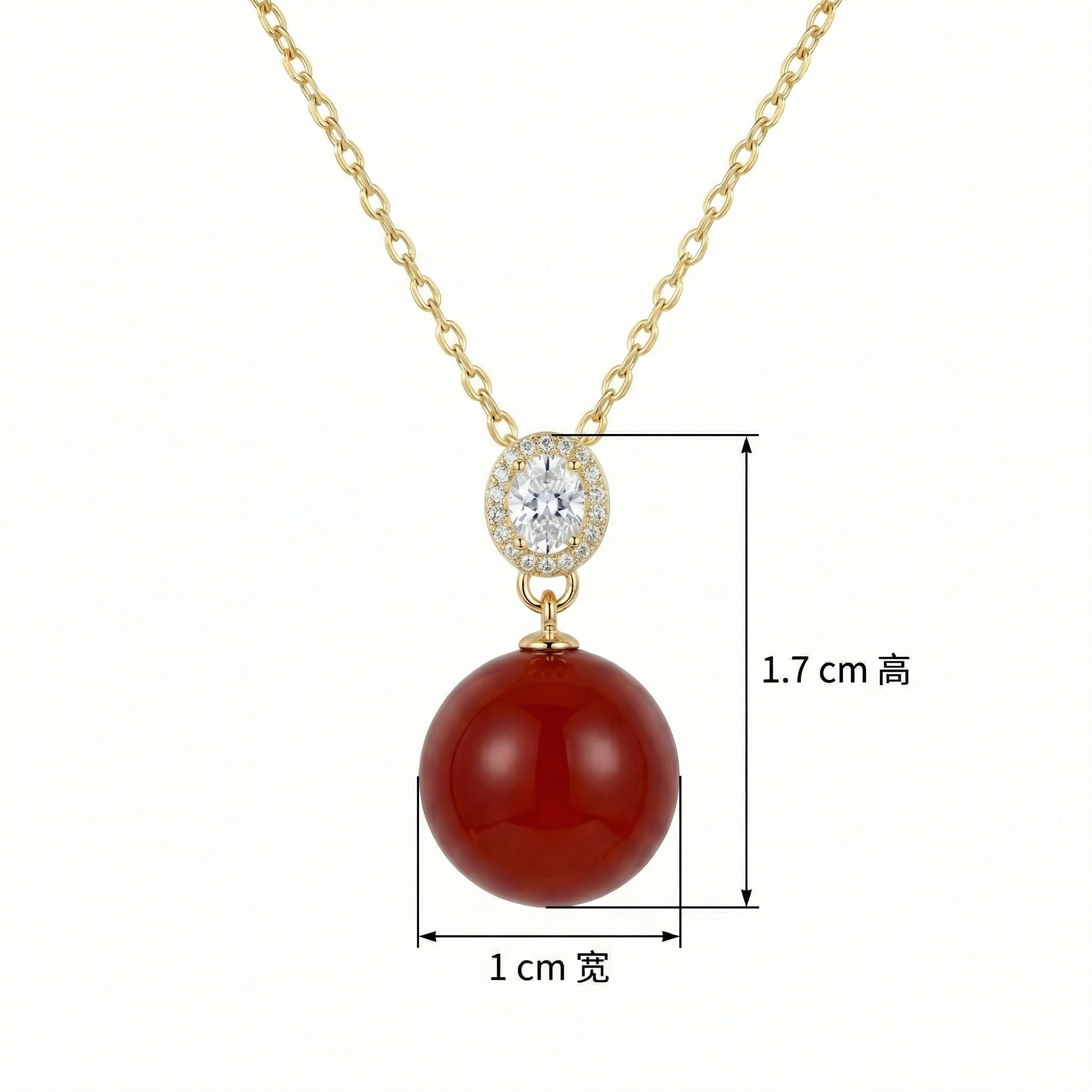 This elegant necklace features a vibrant, deep red sphere, polished to a brilliant shine. Above the main stone, a sparkling oval-cut diamond is encased in a delicate halo of smaller round-cut diamonds, adding a touch of classic luxury. The pendant is gracefully suspended from a refined link chain with a rich, warm metallic glow. This piece perfectly marries bold color with sophisticated sparkle, creating a timeless accessory suitable for any occasion. Whether worn as a statement piece or as an everyday luxury, its exquisite craftsmanship and striking design make it a standout addition to any jewelry collection. The contrast between the rich red gemstone and the clear, shimmering diamonds ensures this necklace will capture attention and admiration alike. | Brand: jewelryodm