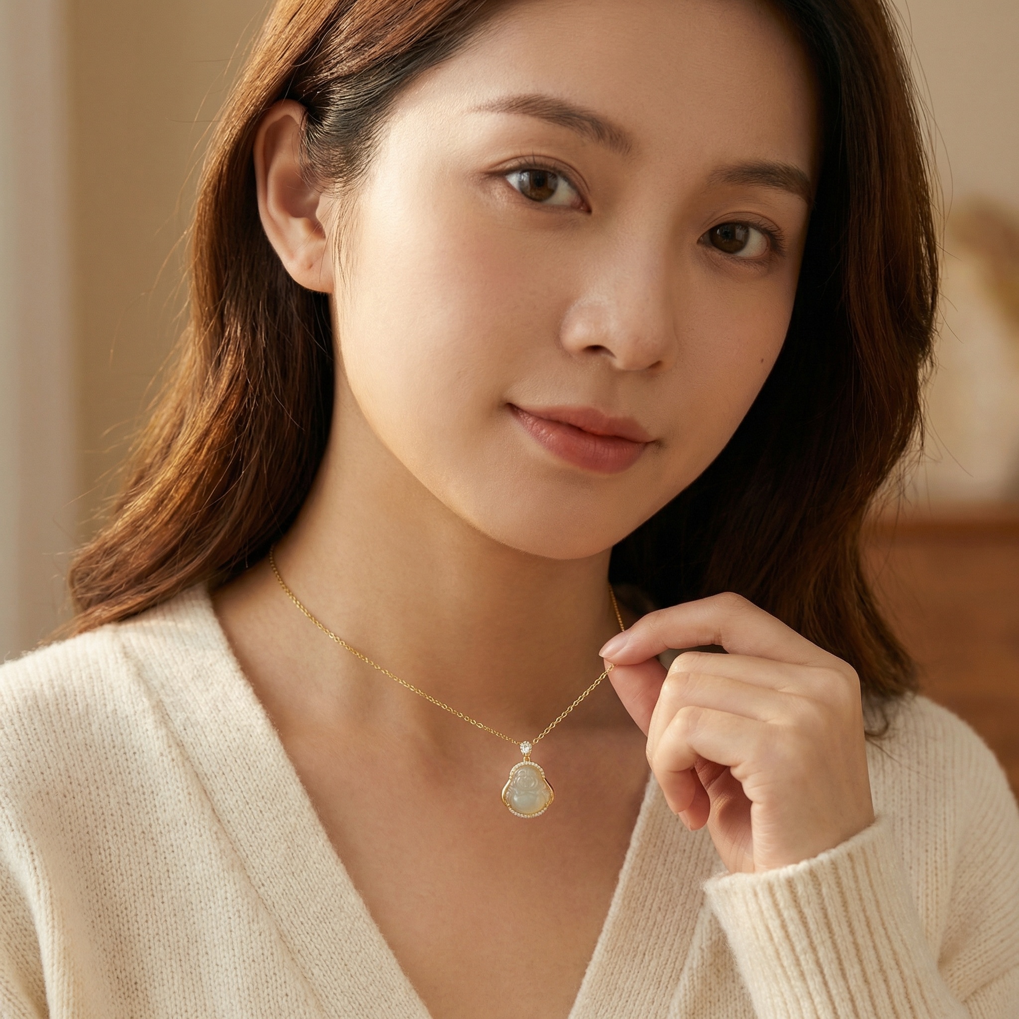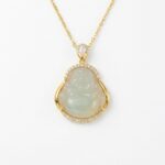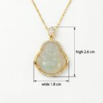 • This exquisite necklace features a serene Buddha pendant crafted from beautiful, translucent jadeite. Symbolizing peace, happiness, and prosperity, the Laughing Buddha is intricately carved and set within a lustrous metallic frame. To add a touch of brilliance, the border is meticulously adorned with sparkling, high-quality clear stones that catch the light from every angle. The matching bail is also embellished with a teardrop-shaped stone for a cohesive and sophisticated look. Suspended from a delicate, matching chain, this piece serves as both a meaningful spiritual talisman and a stunning fashion accessory. Perfect for daily wear or special occasions, it makes a thoughtful gift for anyone seeking positive energy and timeless style. The combination of the smooth gemstone and the shimmering accents creates a luxurious aesthetic that complements any outfit beautifully. | Brand: jewelryodm