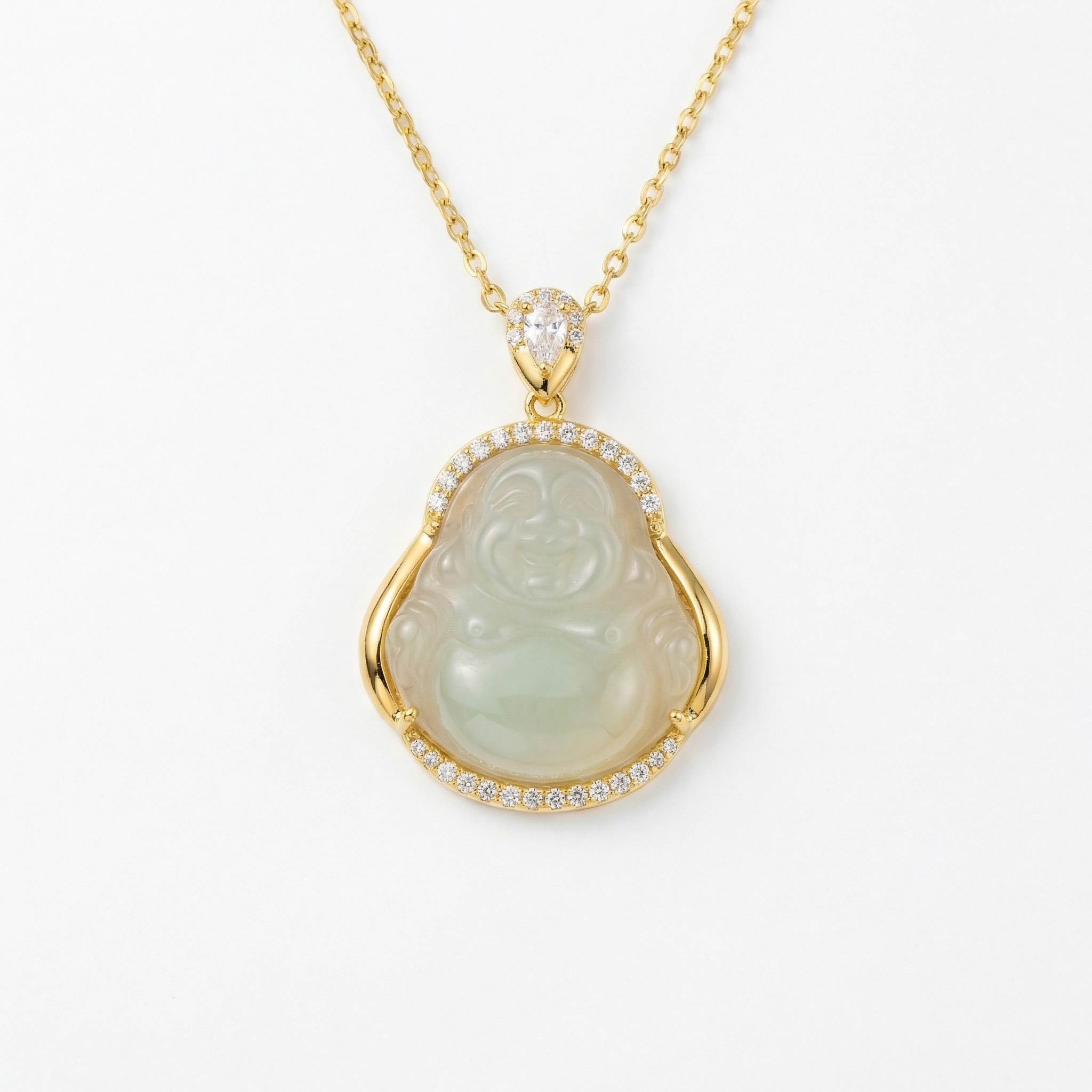 This exquisite necklace features a serene Buddha pendant crafted from beautiful, translucent jadeite. Symbolizing peace, happiness, and prosperity, the Laughing Buddha is intricately carved and set within a lustrous metallic frame. To add a touch of brilliance, the border is meticulously adorned with sparkling, high-quality clear stones that catch the light from every angle. The matching bail is also embellished with a teardrop-shaped stone for a cohesive and sophisticated look. Suspended from a delicate, matching chain, this piece serves as both a meaningful spiritual talisman and a stunning fashion accessory. Perfect for daily wear or special occasions, it makes a thoughtful gift for anyone seeking positive energy and timeless style. The combination of the smooth gemstone and the shimmering accents creates a luxurious aesthetic that complements any outfit beautifully. | Brand: jewelryodm