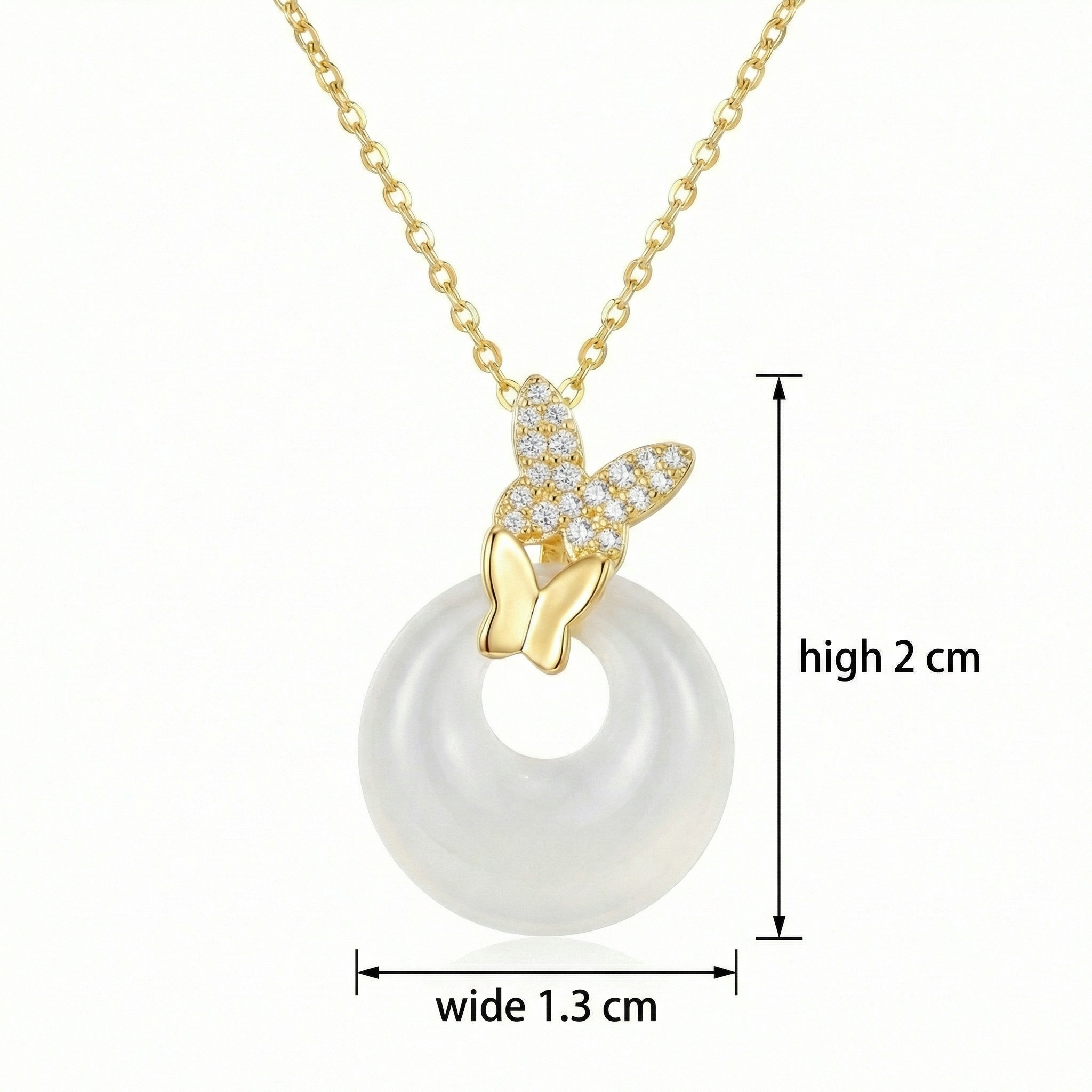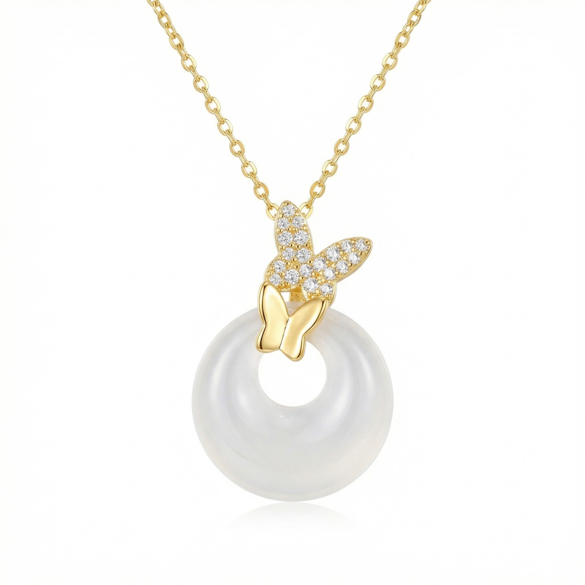 • This exquisite necklace features a stunning dual butterfly design perched atop a polished, translucent white circular gemstone. The upper butterfly is meticulously encrusted with shimmering crystals that catch the light from every angle, while the lower butterfly showcases a smooth, high-shine metallic finish. The central pendant is a beautiful white donut-shaped stone, symbolizing peace and eternity. Suspended from a delicate, shimmering cable chain, this piece blends timeless elegance with nature-inspired charm. Perfect for adding a sophisticated touch to any outfit, this necklace serves as an ideal gift for anniversaries, birthdays, or special celebrations. The warm metallic setting perfectly complements the milky white luster of the stone, creating a look that transcends seasons and trends. Its lightweight design ensures comfort for daily wear while maintaining a luxurious aesthetic. | Brand: jewelryodm