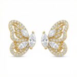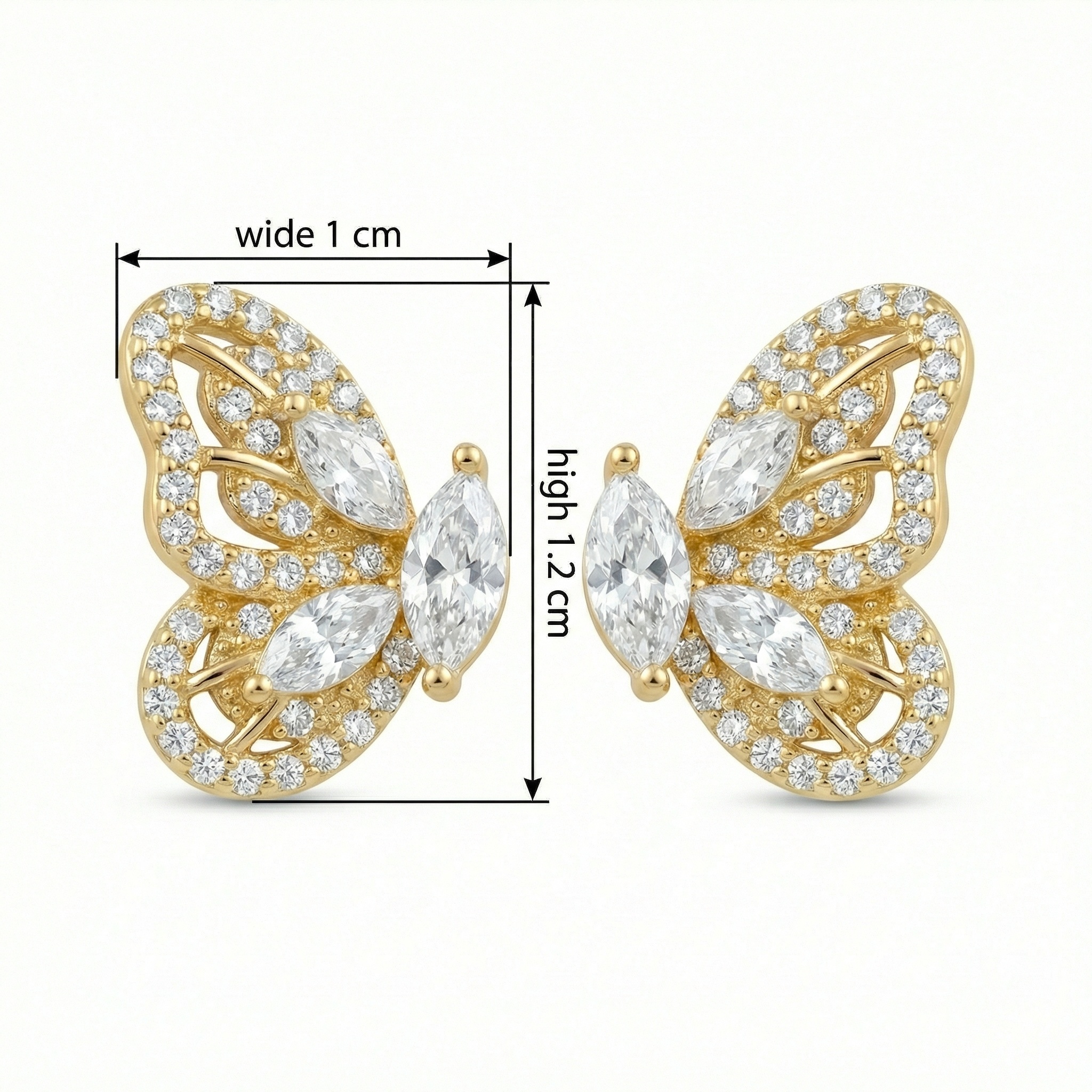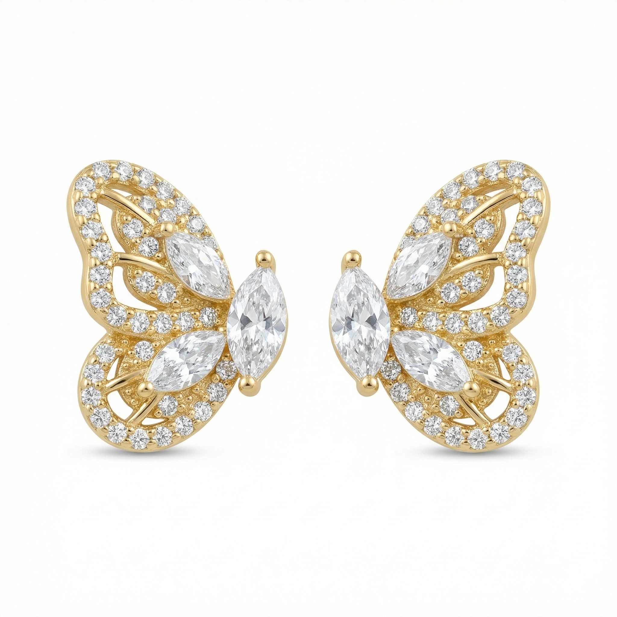 • Elevate your jewelry collection with these exquisite butterfly stud earrings, designed to capture the grace and transformation of nature. Each piece is meticulously crafted with a central marquise-cut stone representing the body, surrounded by delicate wings adorned with shimmering pavé-set round accents and additional marquise highlights. The warm metallic setting provides a luminous backdrop that amplifies the brilliance of every clear stone. Perfect for adding a touch of whimsy to your daily attire or a sparkle to evening wear, these earrings offer a sophisticated silhouette. Their intricate openwork detailing and high-polish finish make them a standout accessory. Featuring secure backings for comfortable, all-day wear, these butterfly earrings are a timeless symbol of beauty, making them an ideal gift for a loved one or a charming treat for yourself. | Brand: jewelryodm
