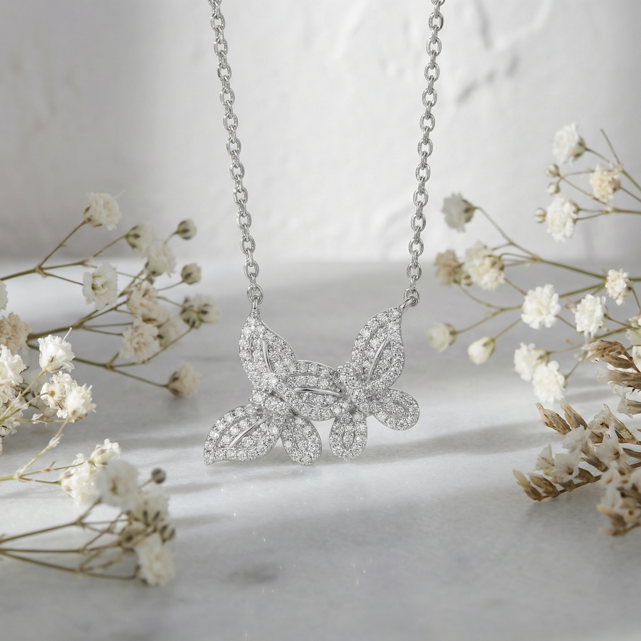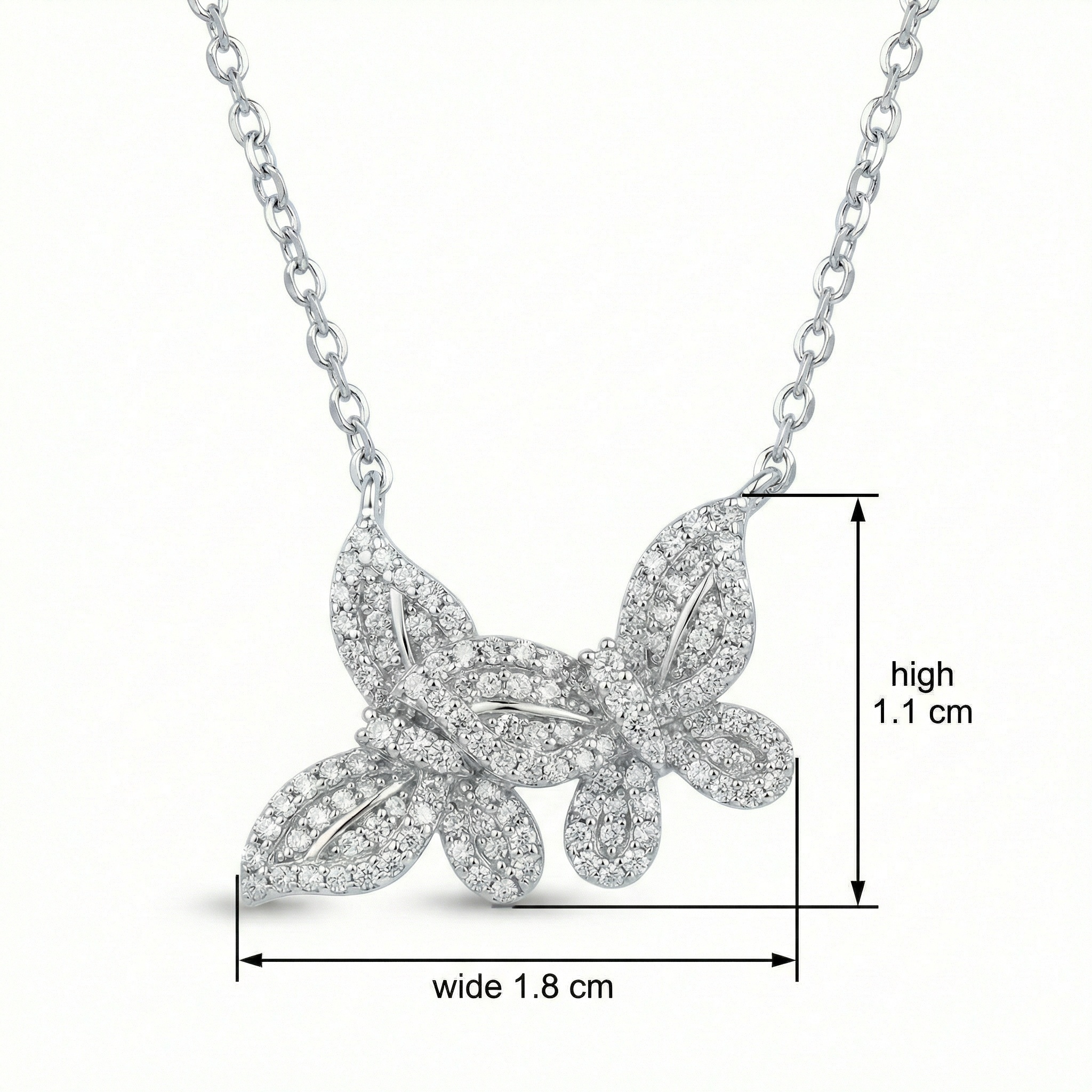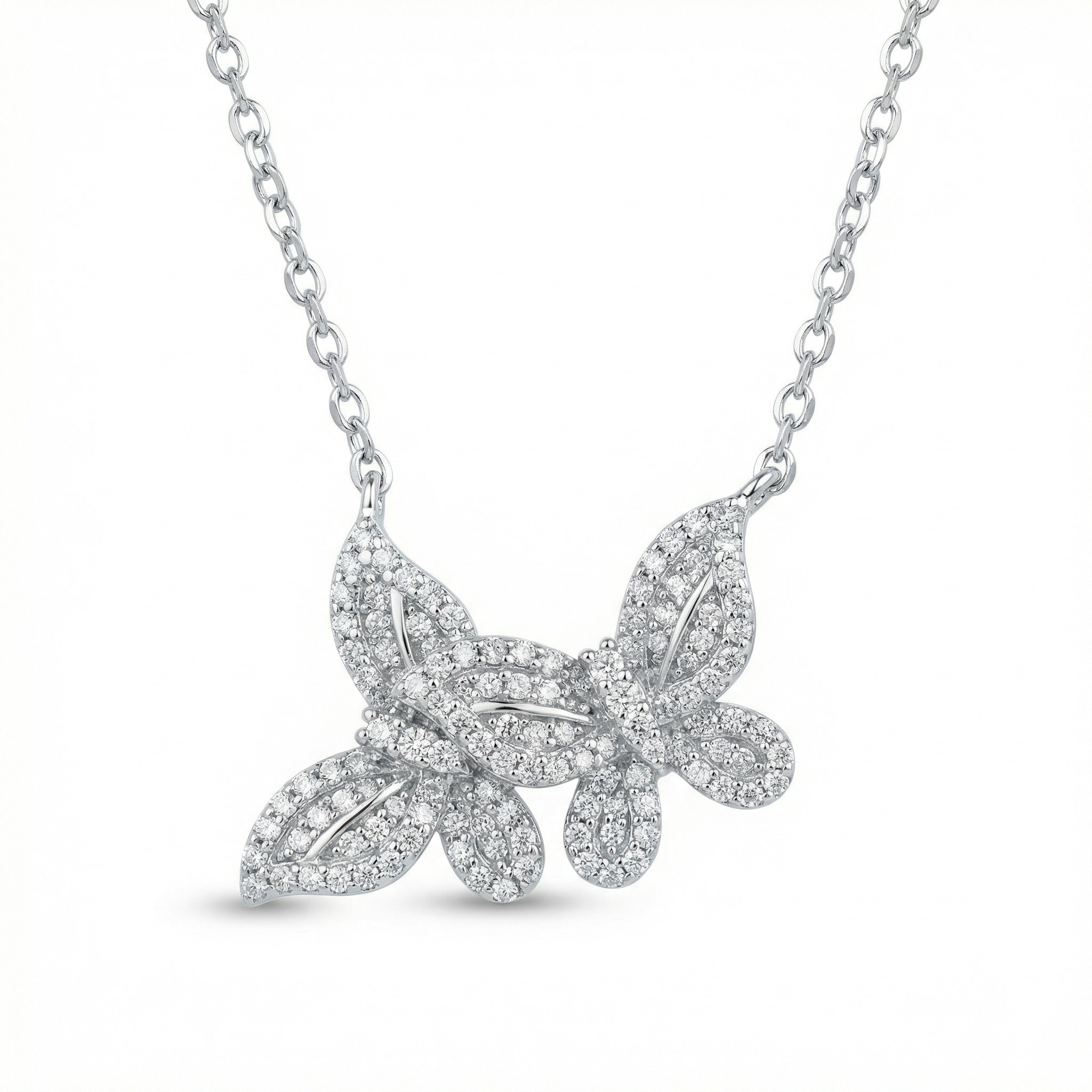 • This exquisite necklace features a whimsical butterfly pendant, intricately crafted and adorned with a multitude of shimmering round-cut stones. The layered, wing-like design creates a dynamic sense of movement and depth, capturing the light from every angle. Suspended from a delicate yet durable chain, this piece is crafted from high-quality sterling silver, offering a brilliant, polished finish. Its elegant and timeless design makes it a versatile accessory, perfect for both everyday wear and special occasions. Whether as a treat for yourself or a thoughtful gift for a loved one, this butterfly necklace adds a touch of sophisticated sparkle to any jewelry collection. Its nature-inspired charm evokes beauty and transformation, making it a meaningful and stylish addition to your wardrobe. | Brand: jewelryodm