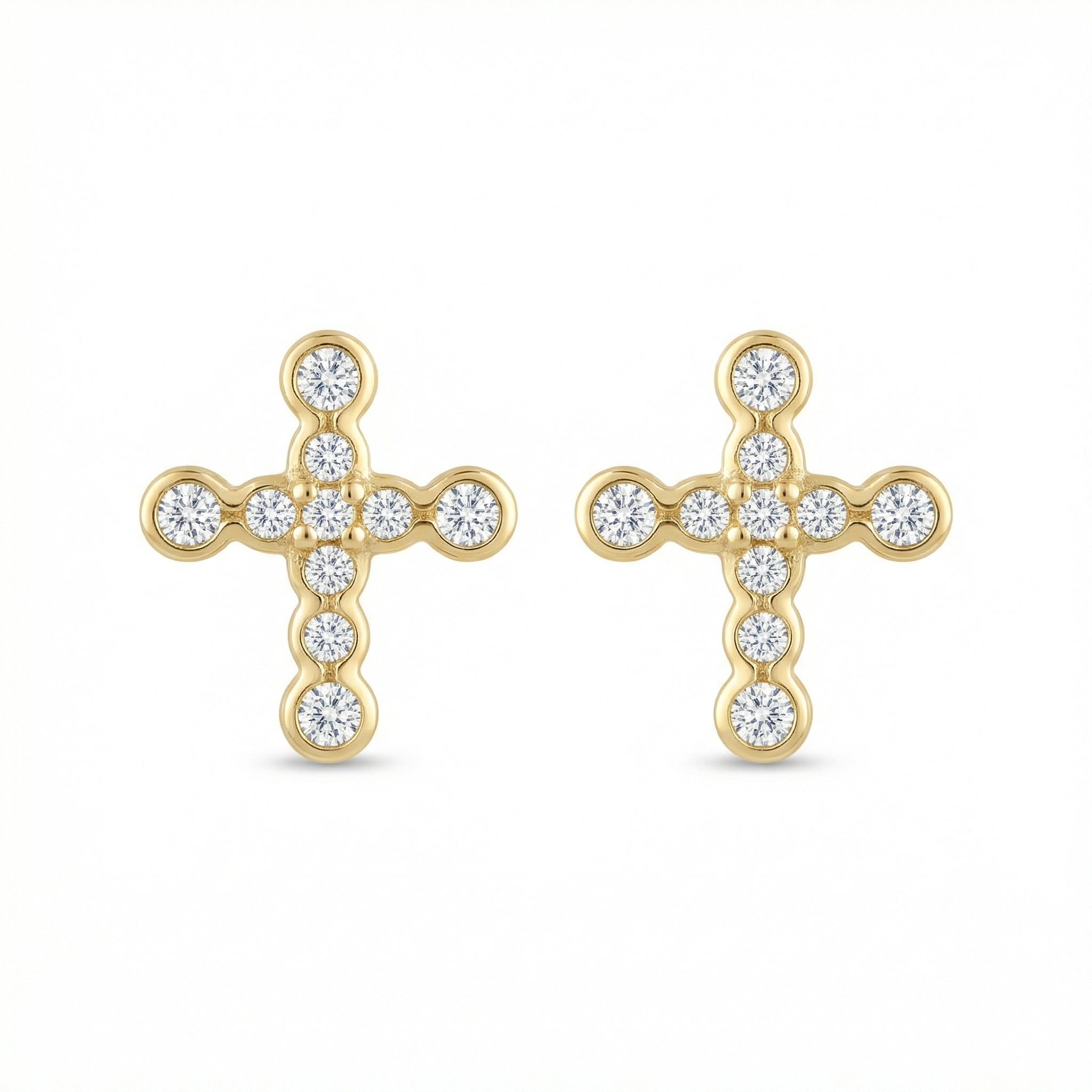 These stunning cross-shaped stud earrings offer a blend of timeless symbolism and contemporary elegance. Each piece is meticulously crafted with a series of round, brilliant-cut diamonds that follow the graceful lines of the cross. The stones are securely held in individual settings, creating a unique “bubble” texture that enhances their brilliance and fire. The warm tone of the polished precious metal provides a luxurious backdrop for the shimmering gems. Perfect for daily wear or special religious milestones, these earrings represent devotion and modern style. They feature a secure post-back closure for comfortable and reliable wear. Whether gifted to a loved one or worn as a personal statement of faith, these radiant studs are designed to capture light and attention from every angle with their exquisite, high-shine finish. | Brand: jewelryodm