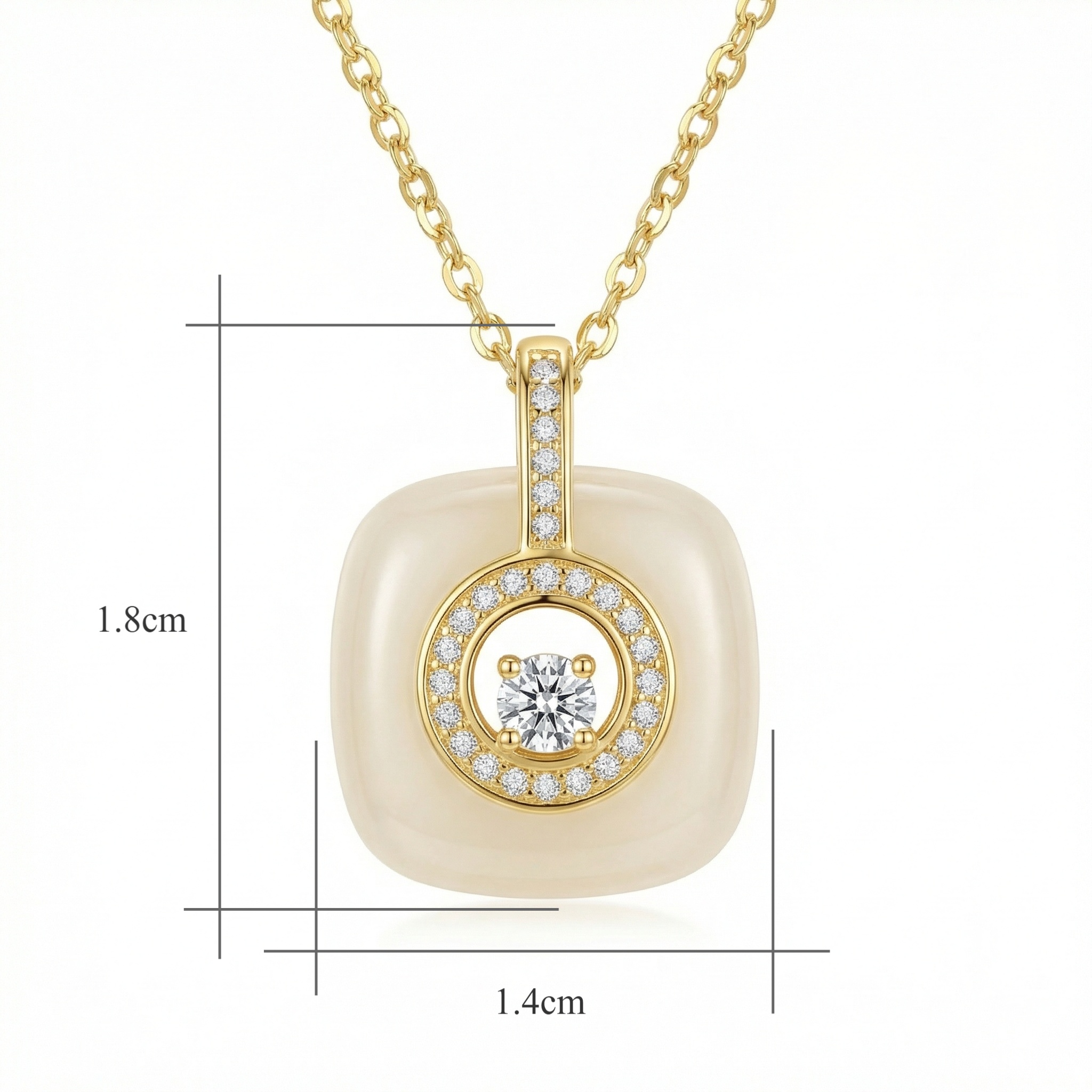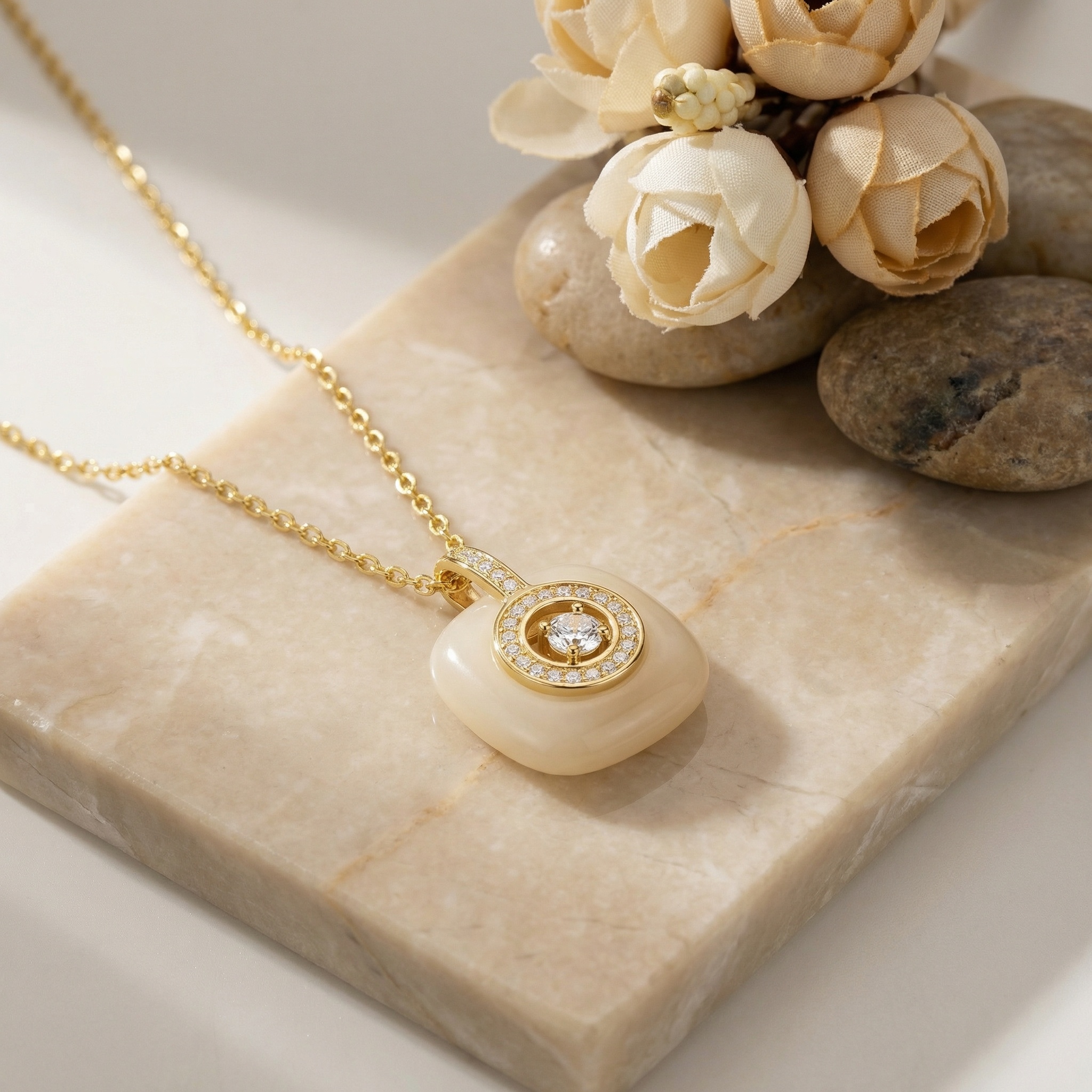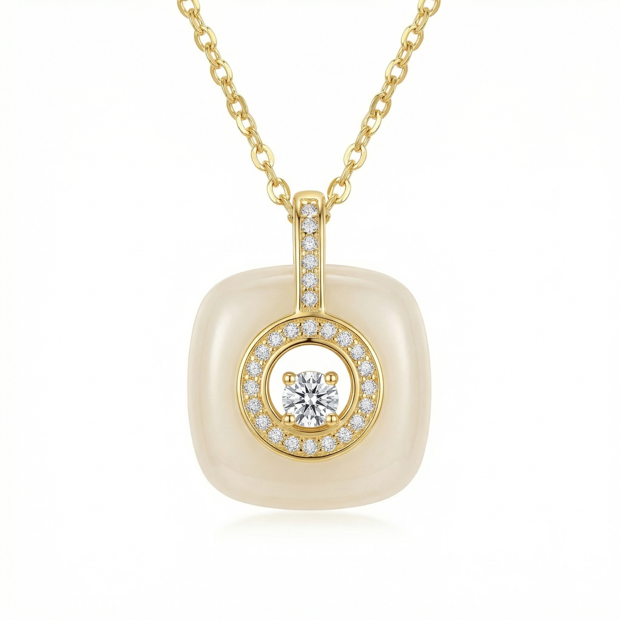This exquisite necklace features a luminous cushion-shaped cream stone as its centerpiece, radiating a soft and elegant glow. At the heart of the stone lies a brilliant round-cut diamond, delicately suspended within a sparkling diamond halo that captures and reflects light from every angle. The yellow metal setting complements the warm tones of the pendant perfectly. The vertical bale is meticulously pavé-set with shimmering diamonds, adding a touch of sophisticated detail. Suspended from a classic fine-link chain, this piece blends modern geometric design with timeless grace. Whether worn for a special occasion or as a daily statement of luxury, this pendant necklace is a testament to refined craftsmanship and understated beauty. Its unique combination of a neutral stone and brilliant accents makes it a versatile addition to any jewelry collection, perfect for gifting or personal indulgence. | Brand: jewelryodm
