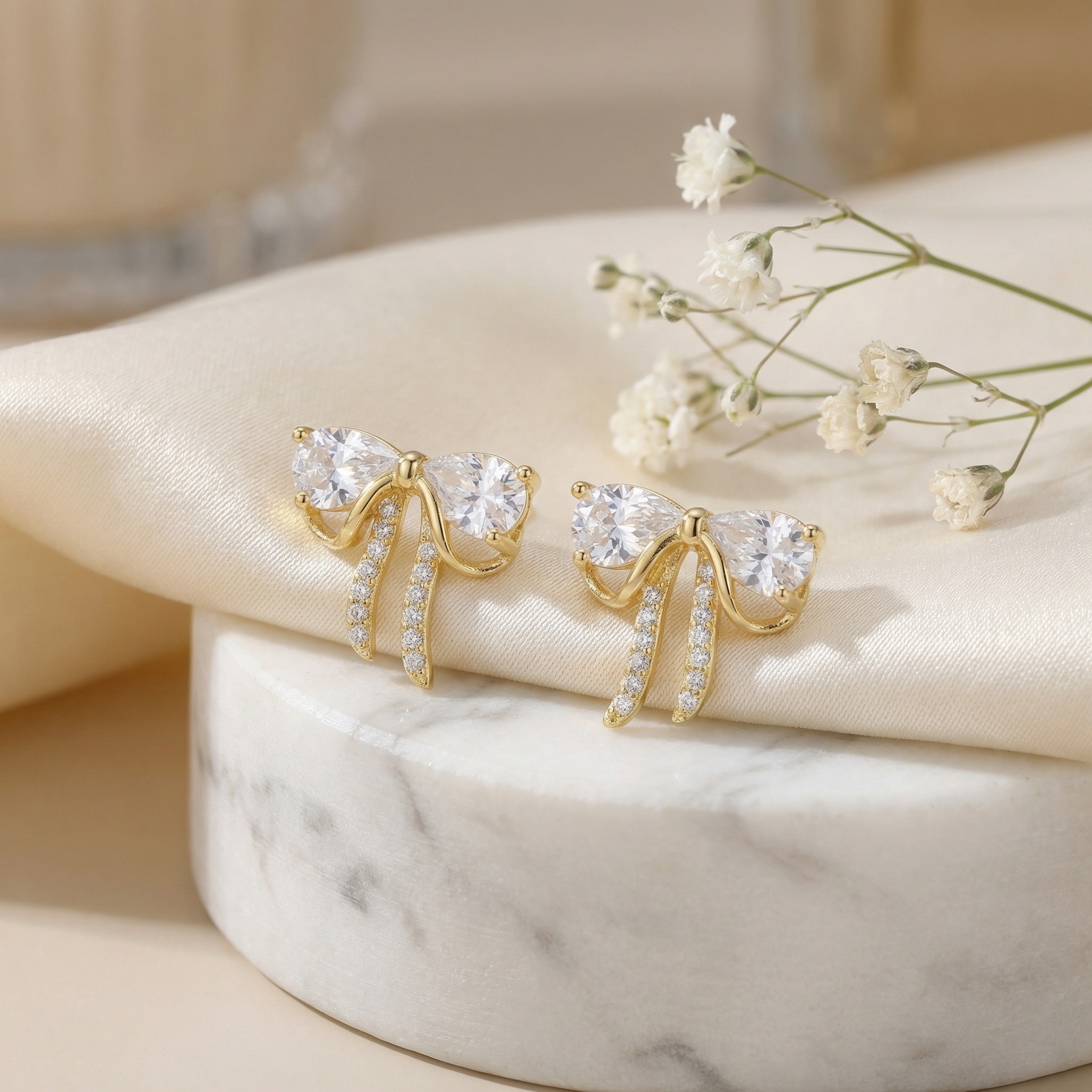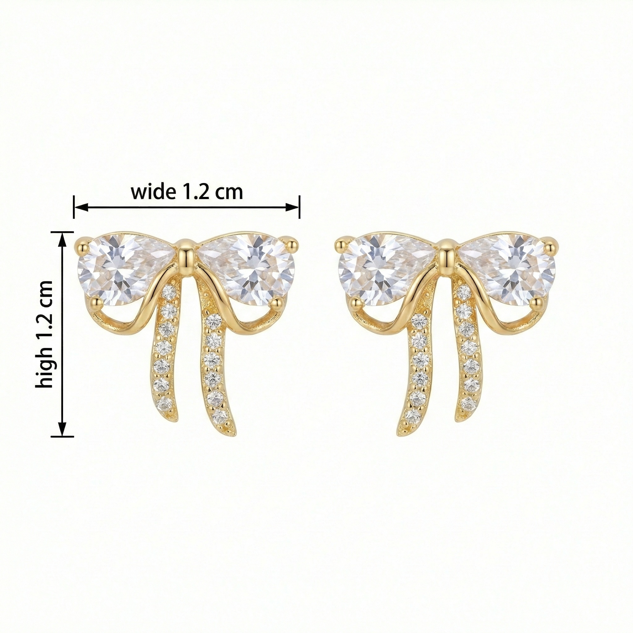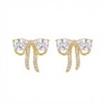 • Elevate your jewelry collection with these exquisite bow-inspired stud earrings, designed to capture light from every angle. Each earring features two prominent pear-shaped brilliant stones that elegantly form the bow’s silhouette. For added charm, the flowing ribbon tails are meticulously set with shimmering round-cut accents, creating a harmonious blend of classic and modern aesthetics. The polished metallic finish offers a warm, sophisticated luster that enhances the overall radiance of the piece. Lightweight and secure, these earrings provide lasting comfort for any occasion, from formal gatherings to everyday style. Their dainty yet dazzling appearance makes them a perfect choice for those who appreciate feminine and timeless designs. Add a touch of whimsical elegance to your look or surprise someone special with these beautifully crafted accessories that celebrate grace and brilliance. | Brand: jewelryodm