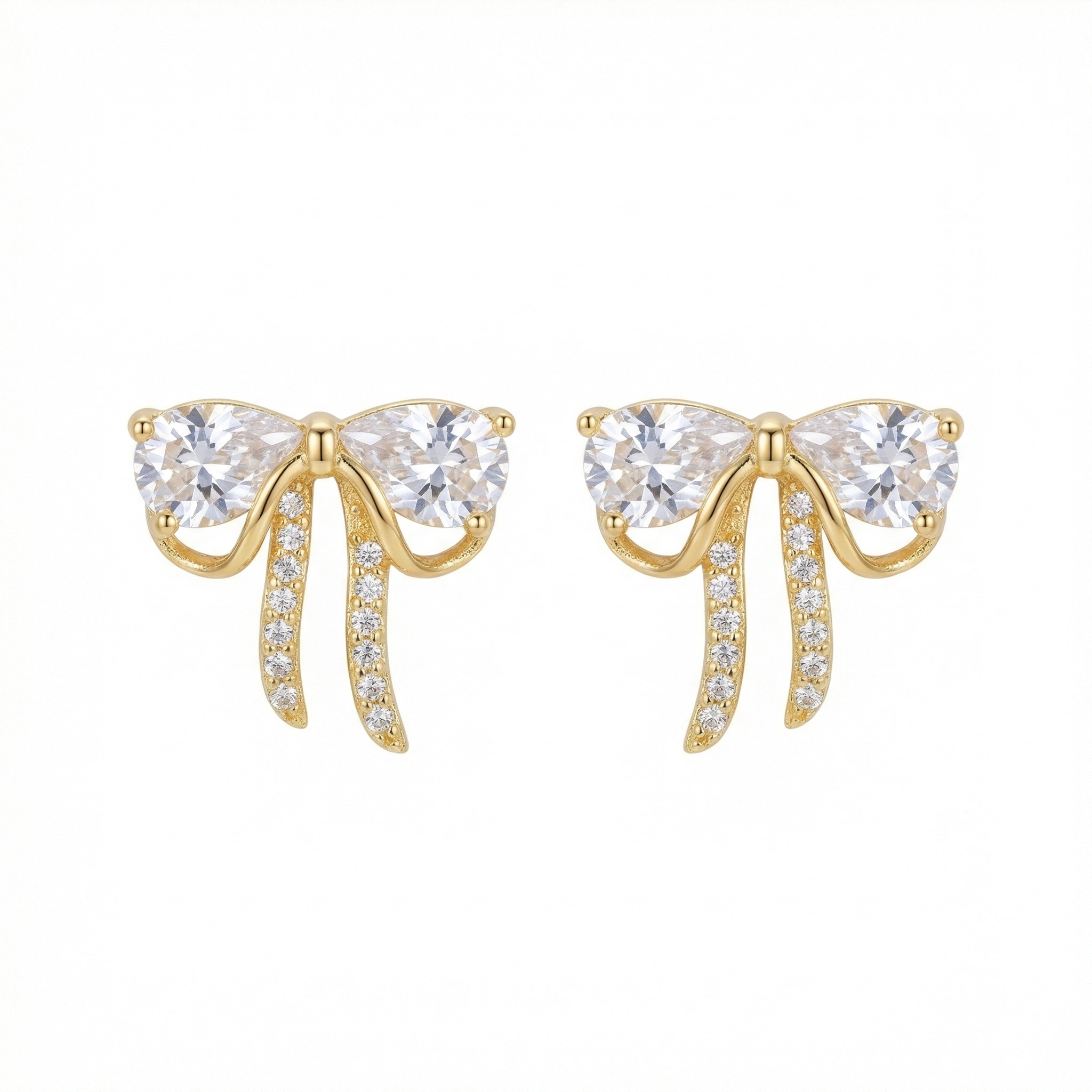 Elevate your jewelry collection with these exquisite bow-inspired stud earrings, designed to capture light from every angle. Each earring features two prominent pear-shaped brilliant stones that elegantly form the bow’s silhouette. For added charm, the flowing ribbon tails are meticulously set with shimmering round-cut accents, creating a harmonious blend of classic and modern aesthetics. The polished metallic finish offers a warm, sophisticated luster that enhances the overall radiance of the piece. Lightweight and secure, these earrings provide lasting comfort for any occasion, from formal gatherings to everyday style. Their dainty yet dazzling appearance makes them a perfect choice for those who appreciate feminine and timeless designs. Add a touch of whimsical elegance to your look or surprise someone special with these beautifully crafted accessories that celebrate grace and brilliance. | Brand: jewelryodm