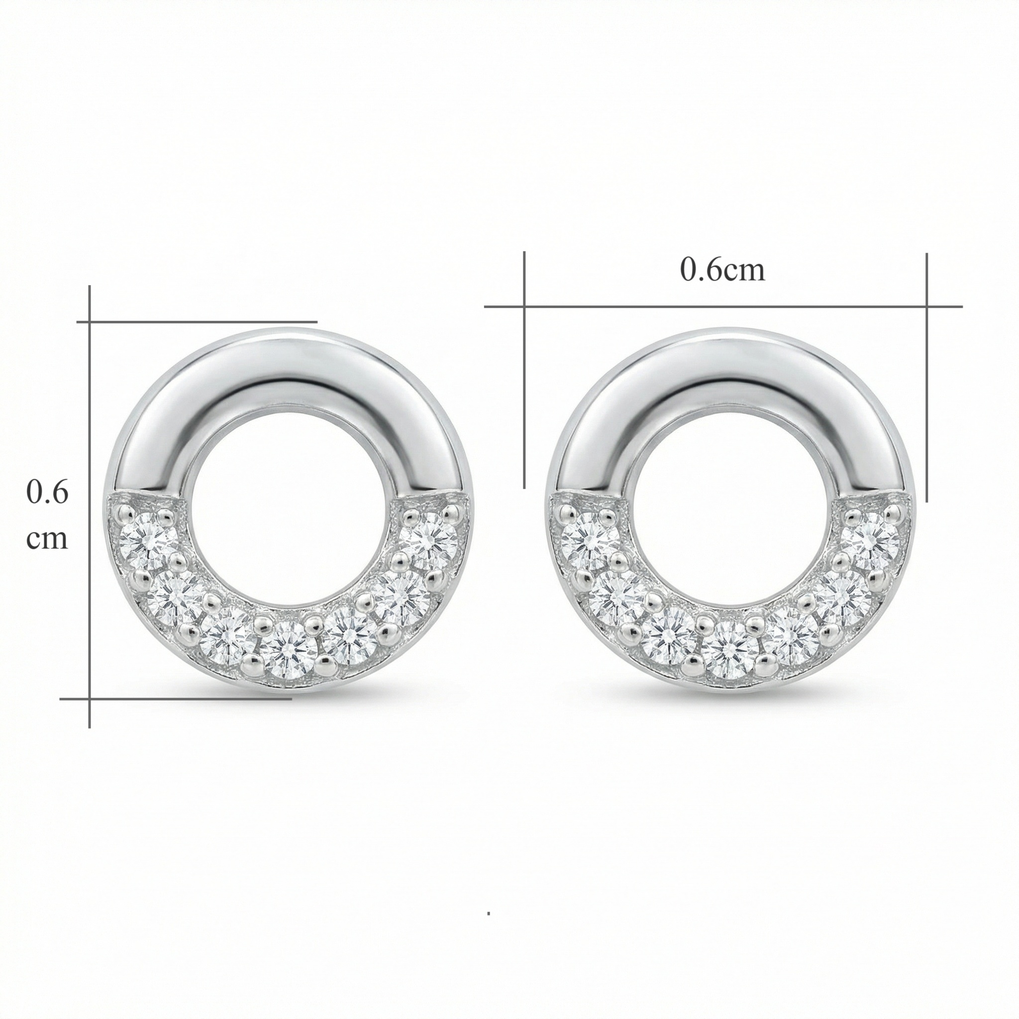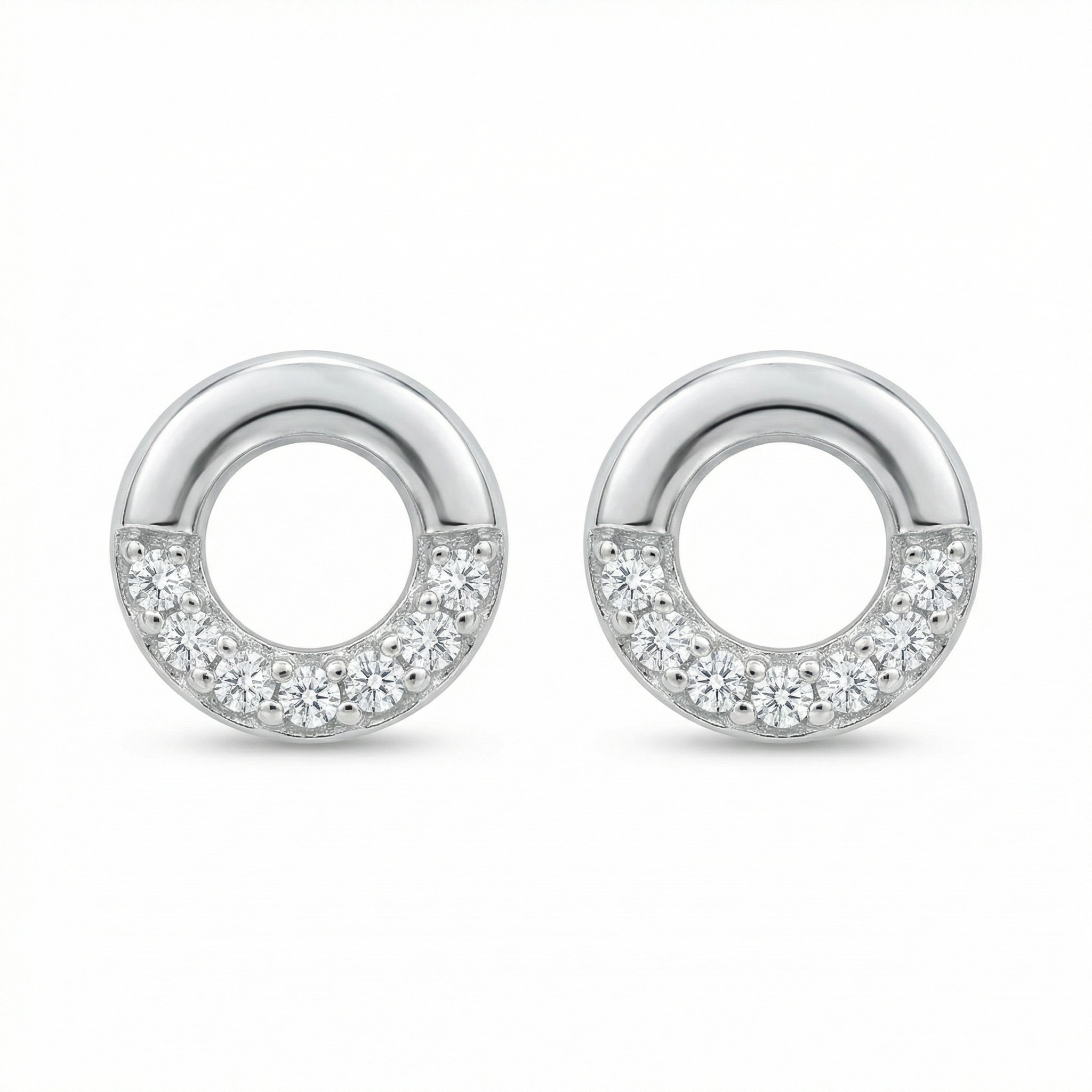 • Elevate your everyday style with these stunning open circle stud earrings. Crafted in polished sterling silver, these earrings feature a minimalist geometric design that transitions effortlessly from day to night. The bottom half of each circular silhouette is meticulously pavé-set with a row of brilliant round-cut stones, adding a touch of sophisticated sparkle to your look. Their sleek, high-shine finish and delicate size make them a versatile addition to any jewelry collection. Perfect for gifting or treating yourself, these lightweight and comfortable studs provide a timeless aesthetic. Whether worn alone or paired with other silver-toned accessories, they offer a refined glow that enhances your natural beauty. Experience the perfect blend of modern elegance and classic charm with these exquisite sparkling circle earrings. | Brand: jewelryodm