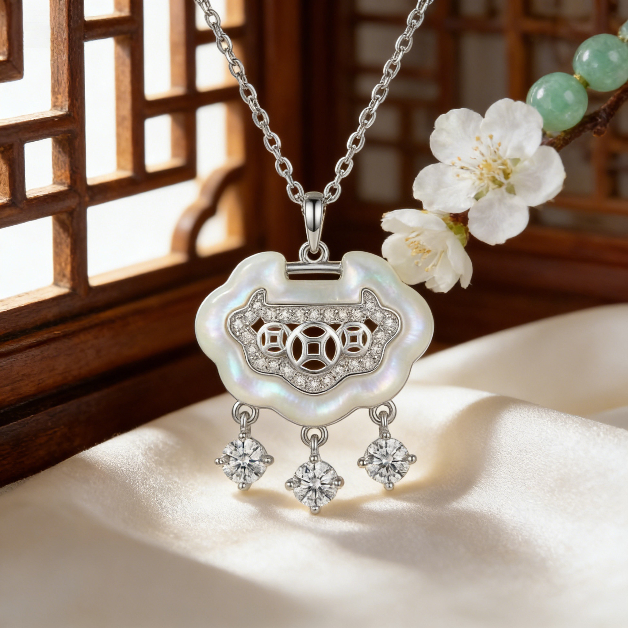 • This exquisite necklace features a traditional Chinese Ruyi longevity lock pendant, beautifully crafted from sterling silver. The centerpiece showcases a lustrous white mother-of-pearl inlay that provides a soft, iridescent glow. Elaborate pavé-set crystals adorn the middle, forming a pattern inspired by ancient coins to symbolize wealth and good fortune. Adding a touch of dynamic elegance, three brilliant-cut round crystals dangle gracefully from the bottom, catching the light with every movement. Suspended from a delicate silver chain, this pendant blends cultural heritage with modern sophistication. It serves as a meaningful gift, representing wishes for protection, prosperity, and a long, happy life. Whether worn for a special occasion or as a daily statement piece, this necklace adds a refined touch of symbolic beauty to any outfit. | Brand: jewelryodm