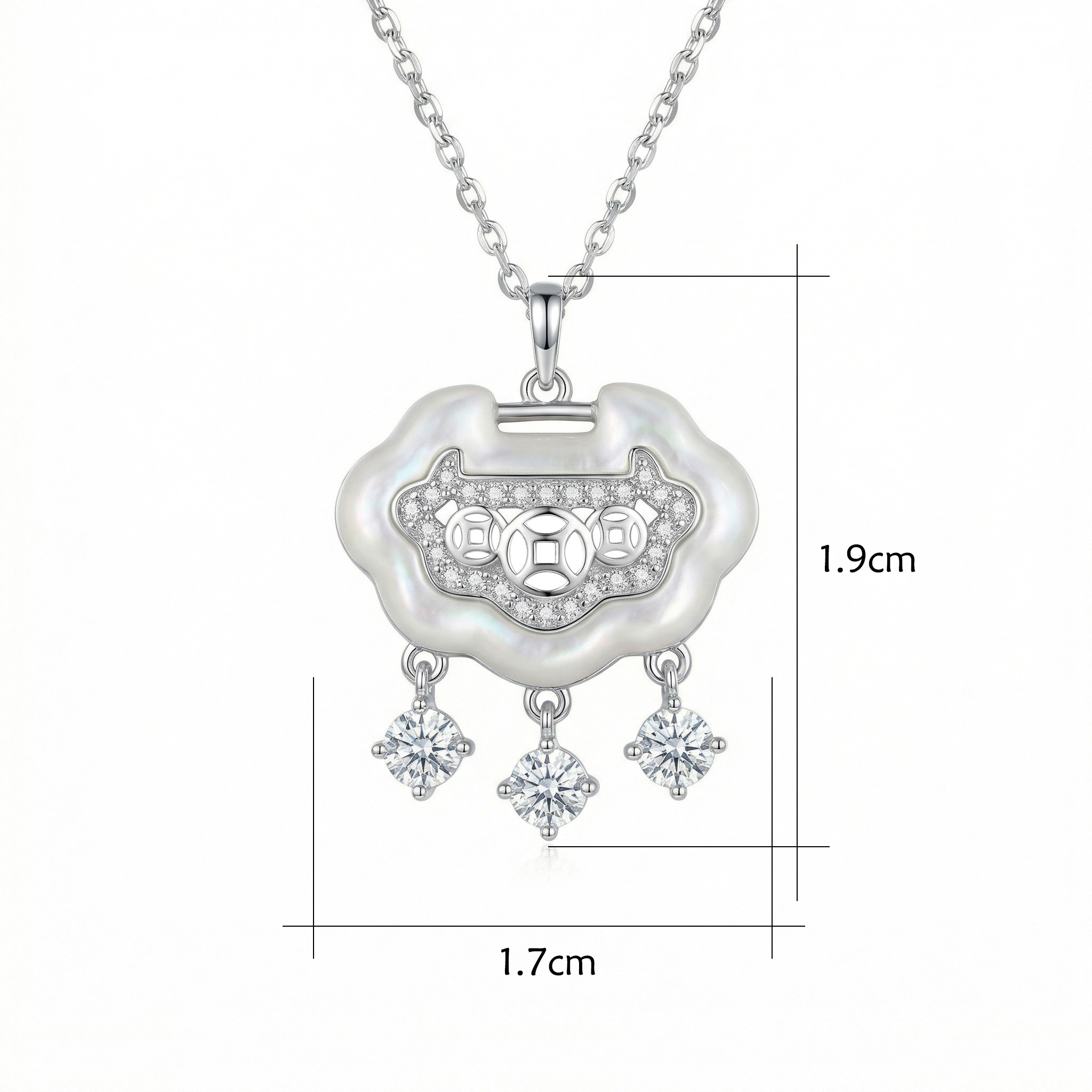 This exquisite necklace features a traditional Chinese Ruyi longevity lock pendant, beautifully crafted from sterling silver. The centerpiece showcases a lustrous white mother-of-pearl inlay that provides a soft, iridescent glow. Elaborate pavé-set crystals adorn the middle, forming a pattern inspired by ancient coins to symbolize wealth and good fortune. Adding a touch of dynamic elegance, three brilliant-cut round crystals dangle gracefully from the bottom, catching the light with every movement. Suspended from a delicate silver chain, this pendant blends cultural heritage with modern sophistication. It serves as a meaningful gift, representing wishes for protection, prosperity, and a long, happy life. Whether worn for a special occasion or as a daily statement piece, this necklace adds a refined touch of symbolic beauty to any outfit. | Brand: jewelryodm
