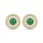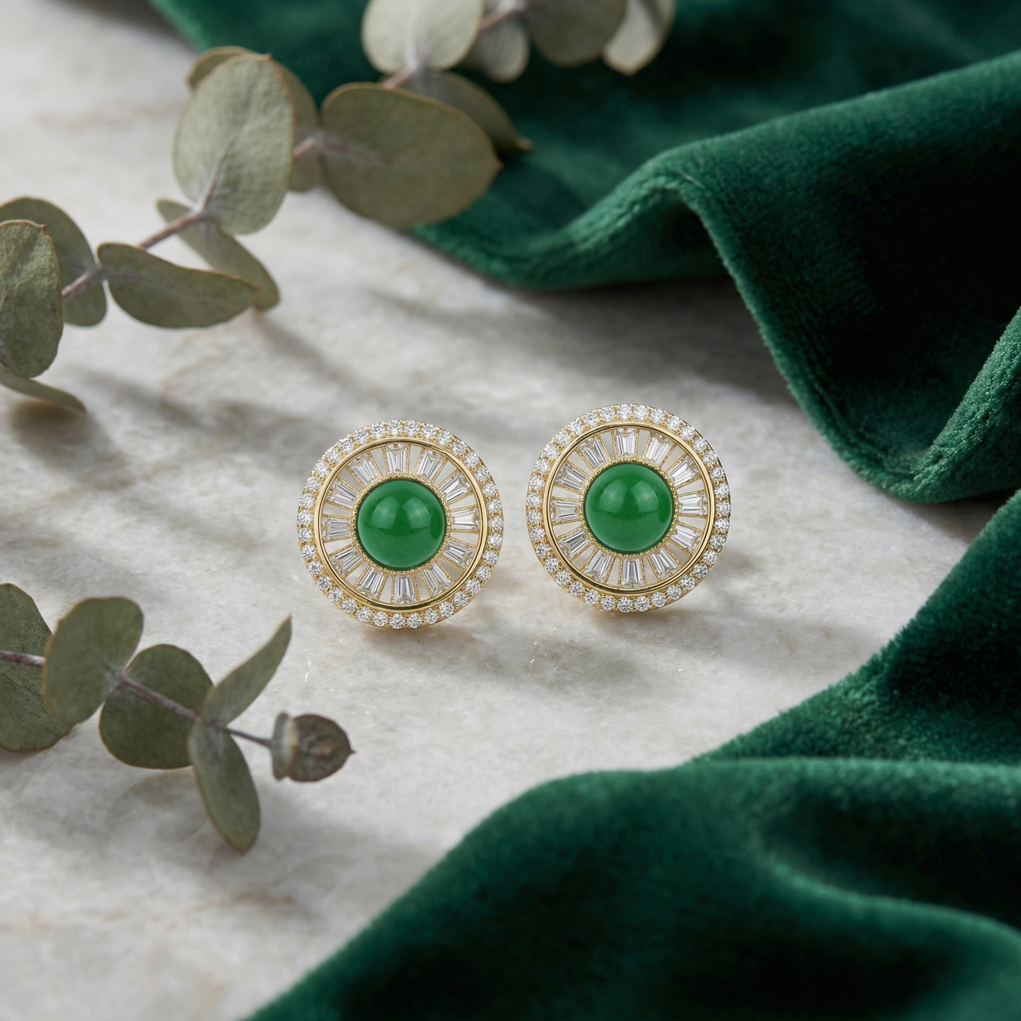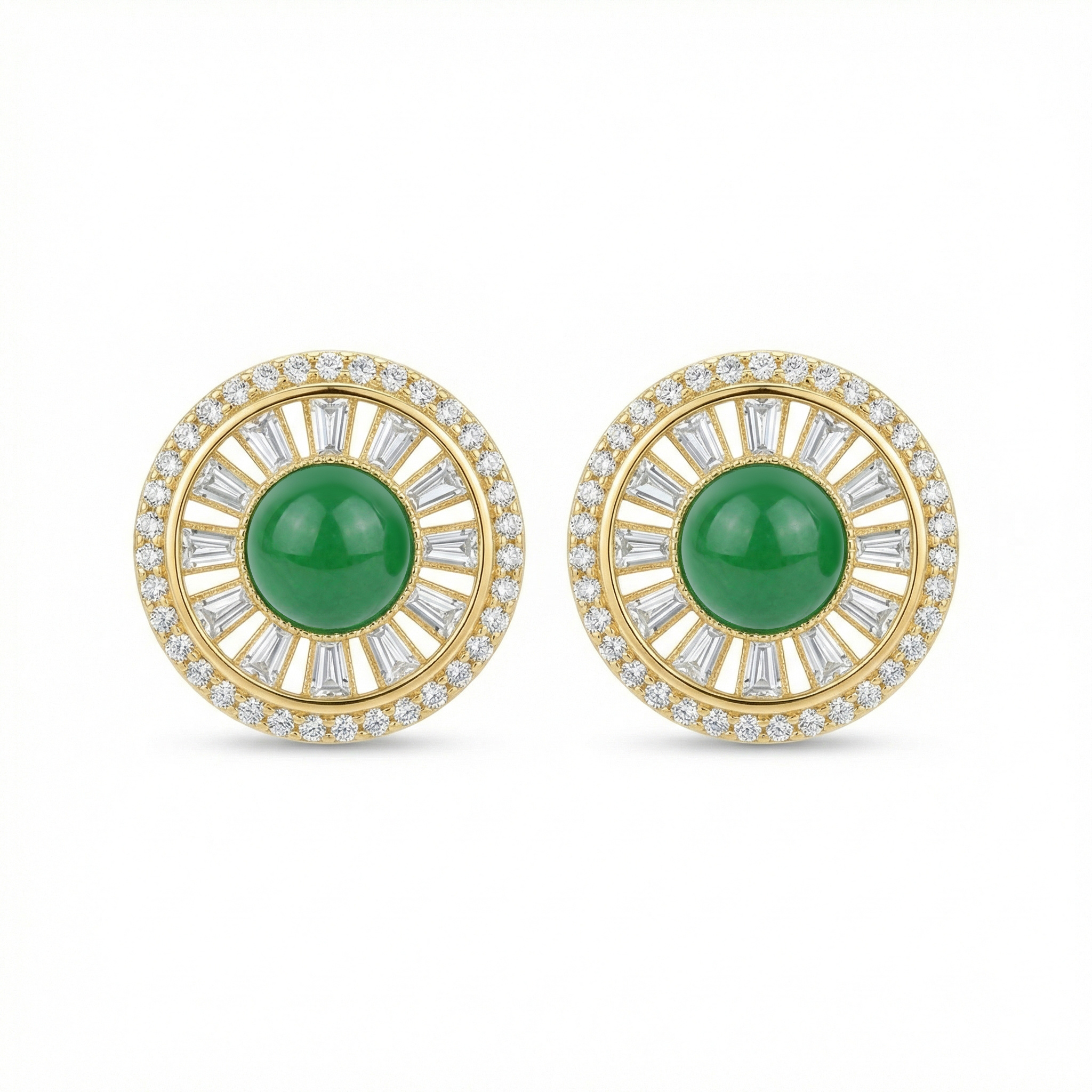 • These exquisite stud earrings feature a vibrant green emerald at the center, radiating timeless elegance. The central gemstone is beautifully framed by a unique sunburst arrangement of baguette-cut diamonds, adding a sophisticated geometric flair reminiscent of Art Deco design. An outer halo of pavé-set round brilliant diamonds encircles the entire piece, providing a continuous sparkle that catches the light from every angle. Crafted with a warm yellow-toned setting, these earrings offer a striking contrast against the vivid green and sparkling white stones. Perfect for special occasions or adding a touch of luxury to everyday wear, these earrings are a masterpiece of craftsmanship and style, designed to be cherished for a lifetime. | Brand: jewelryodm