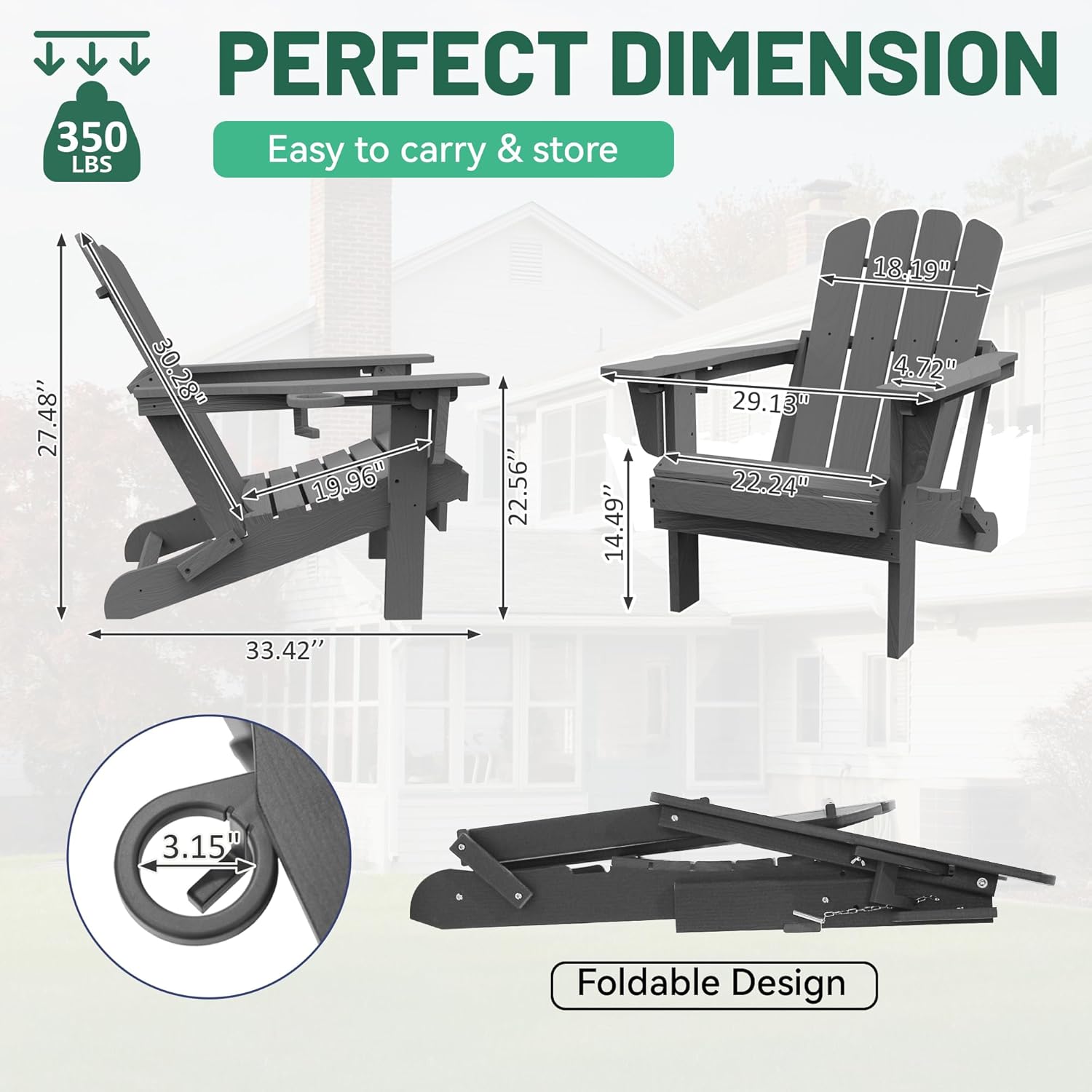 • Single Box ProductProduct Name:Adirondack Chair, Plastic Adirondack Chairs, HDPE Adirondack Chair, Folding Adirondack Chairs,Outdoor Chairs with Cup Holder for Lawn Patio Deck Fire Pit -GrayMain Color:GrayMain Material:HDPEProduct Style:ModernUse Case:Garden & OutdoorSet Design:AdirondackCushions Included:NoProduct DimensionsAssembled Length (in.):33.42Assembled Width (in.):27.48Assembled Height (in.):29.13Product Weight (lbs.):33.50Package SizeLength (in.):34.65Width (in.):22.44Height (in.):6.30Weight (lbs.):38.00