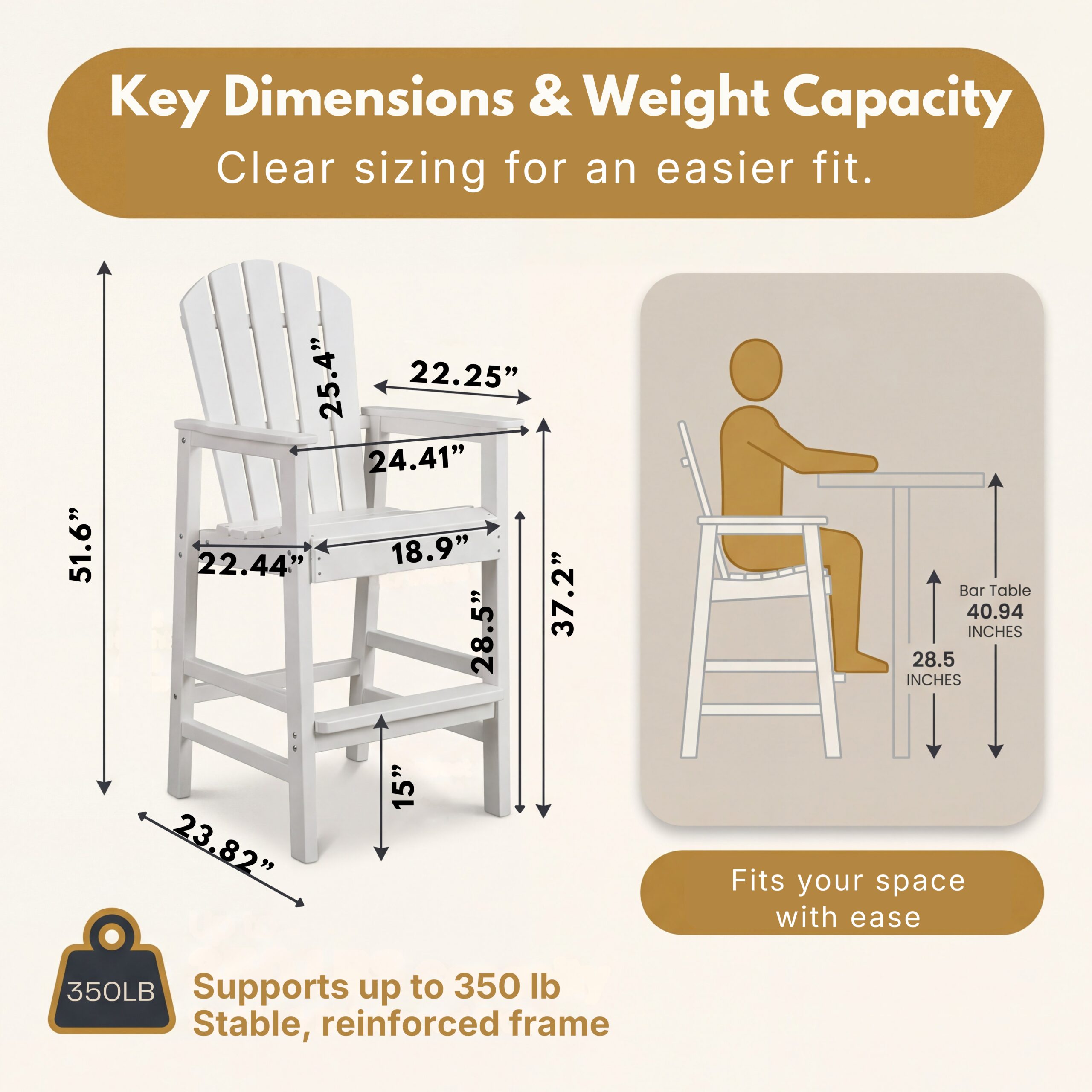 Single Box ProductProduct Name:All-Weather HDPE Bar Height Adirondack Chair, Outdoor Patio Bar Chair with Armrests & Cup Holder, UV/Weather Resistant, White 1 Piece (WH)Place of Origin:ChinaMain Color:WhiteMain Material:HDPEFiller:HDPEProduct Style:Beach,Casual,Classic,CoastalUse Case:Garden & OutdoorSet Design:AdirondackCushions Included:NoFrame Durability:Weather Resistant FrameProduct DimensionsAssembled Length (in.):24.41Assembled Width (in.):23.82Assembled Height (in.):51.60Product Weight (lbs.):40.10Package SizeLength (in.):37.00Width (in.):22.44Height (in.):6.10Weight (lbs.):48.50