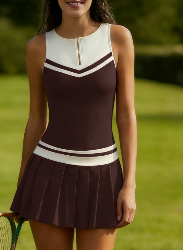 American-style Campus-inspired Color-blocked Zippered Pleated Tennis Dress For Women