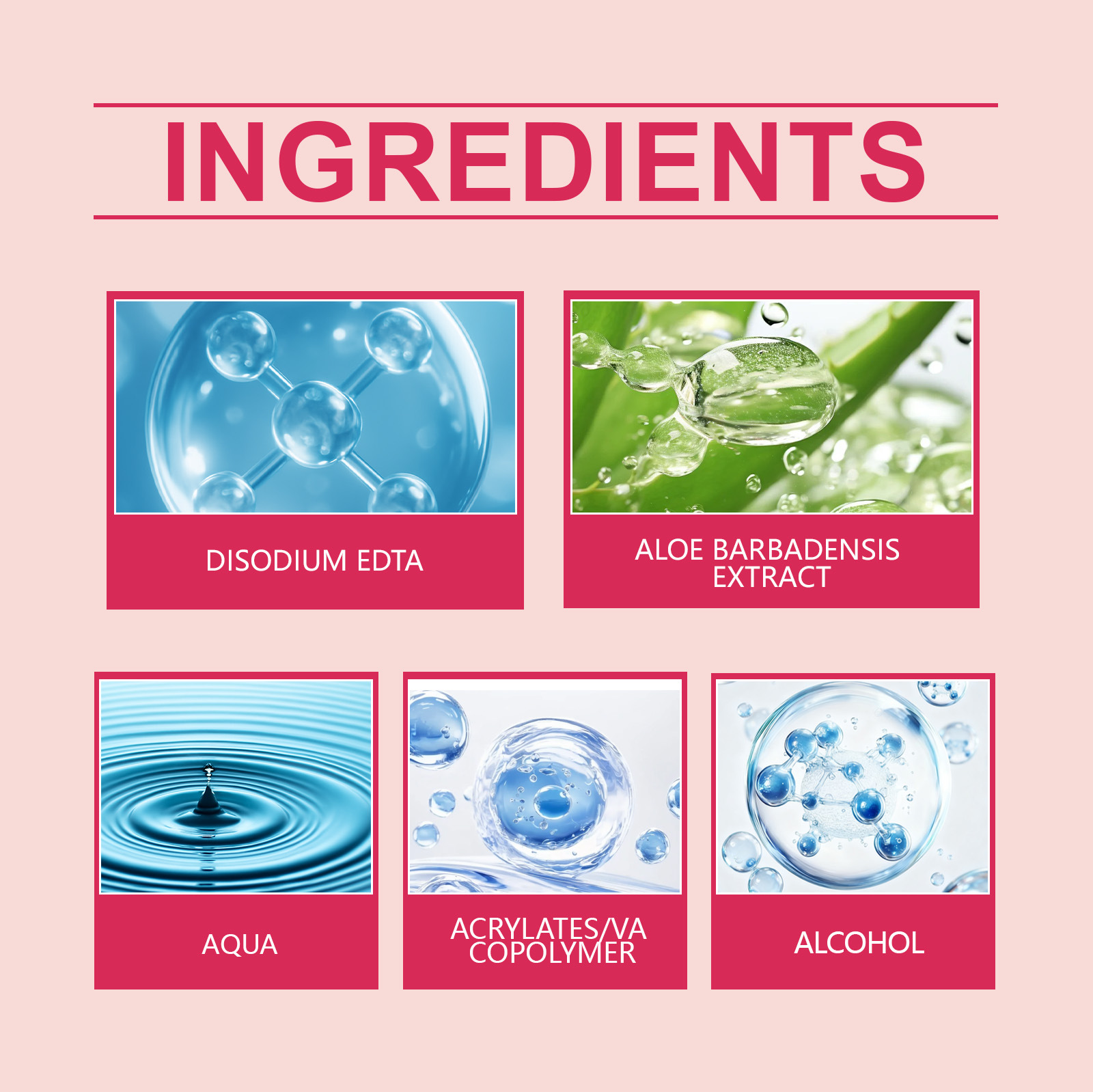 - Water, acrylic acid/VA copolymer, ethanol, disodium EDTA, aloe vera extract.