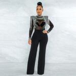 Arrival Hot-Stone Embellished Tassel-Trimmed Shoulder Design Sheer Polyester Mesh Patchwork Jumpsuit