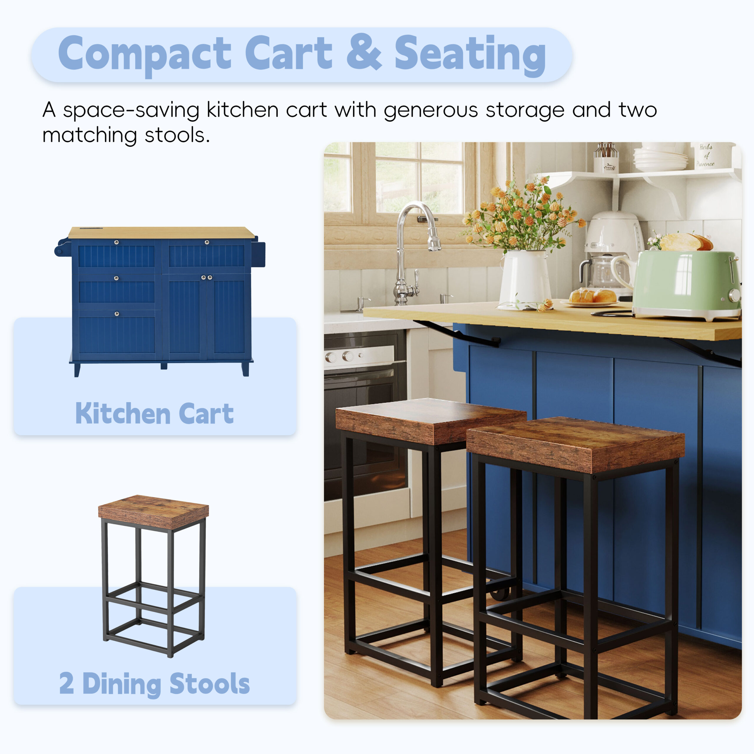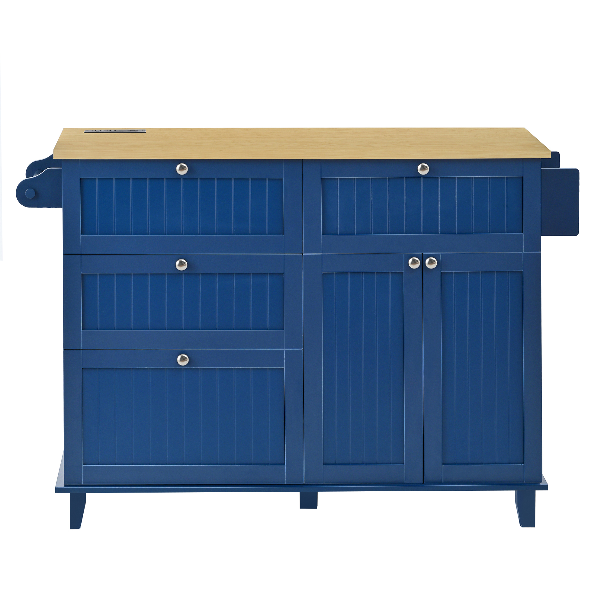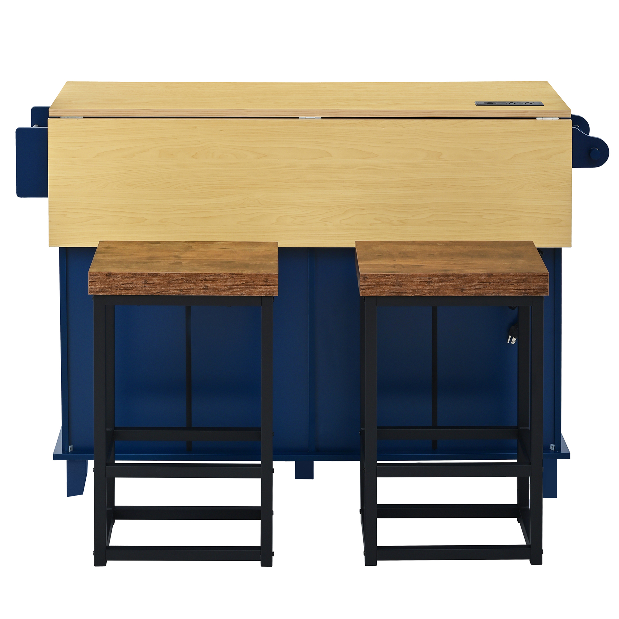 Available TOPMAX Farmhouse Kitchen Island With Drop Leaf And 2 Seatings, Kitchen Table Set With Storage Cabinet, Drawers, Door Shelves And Power Outlet, Blue