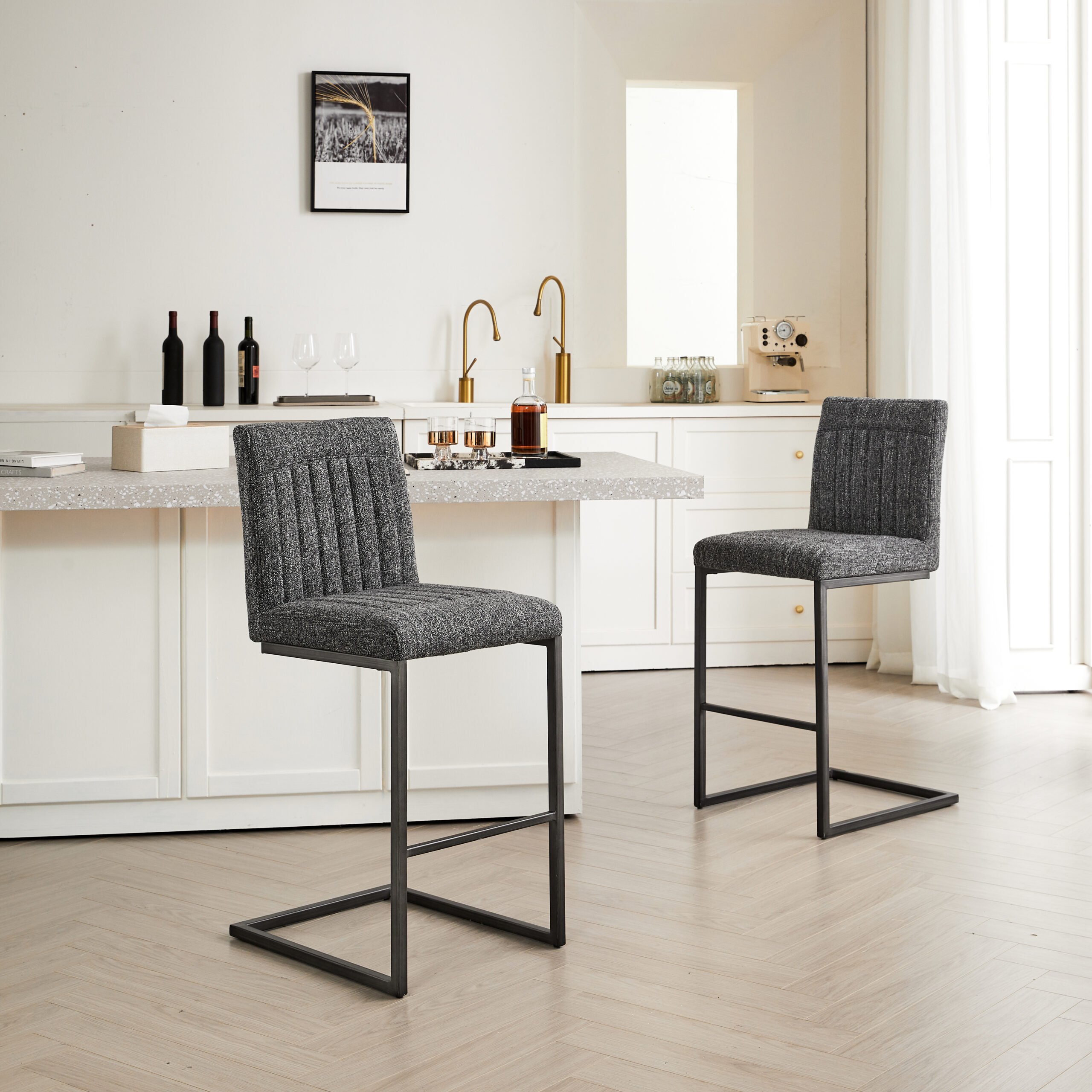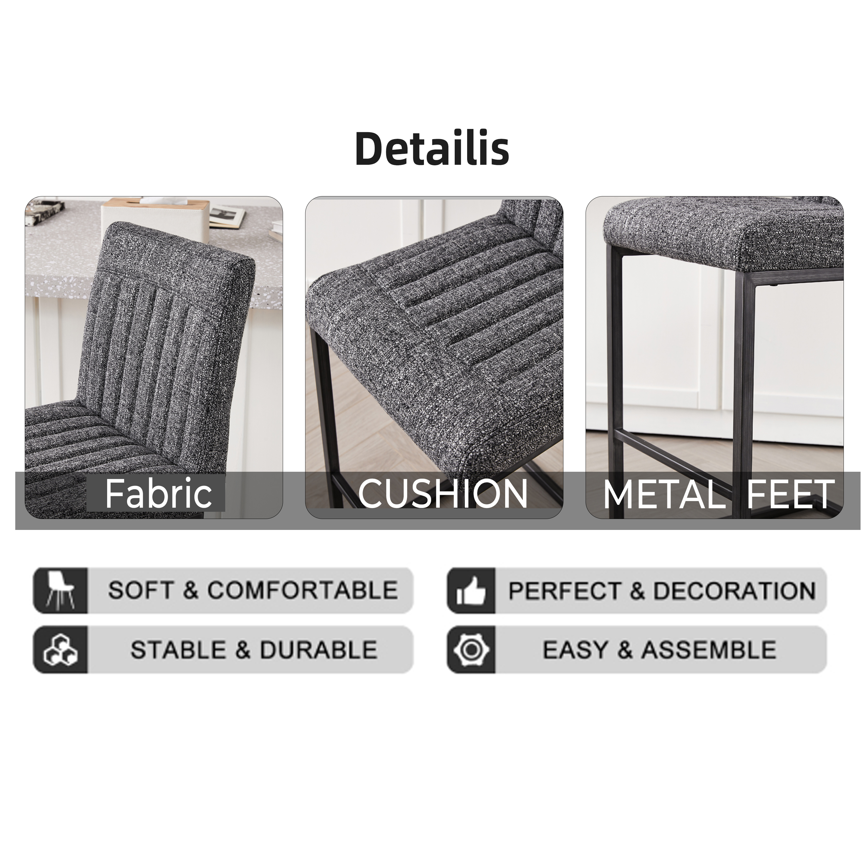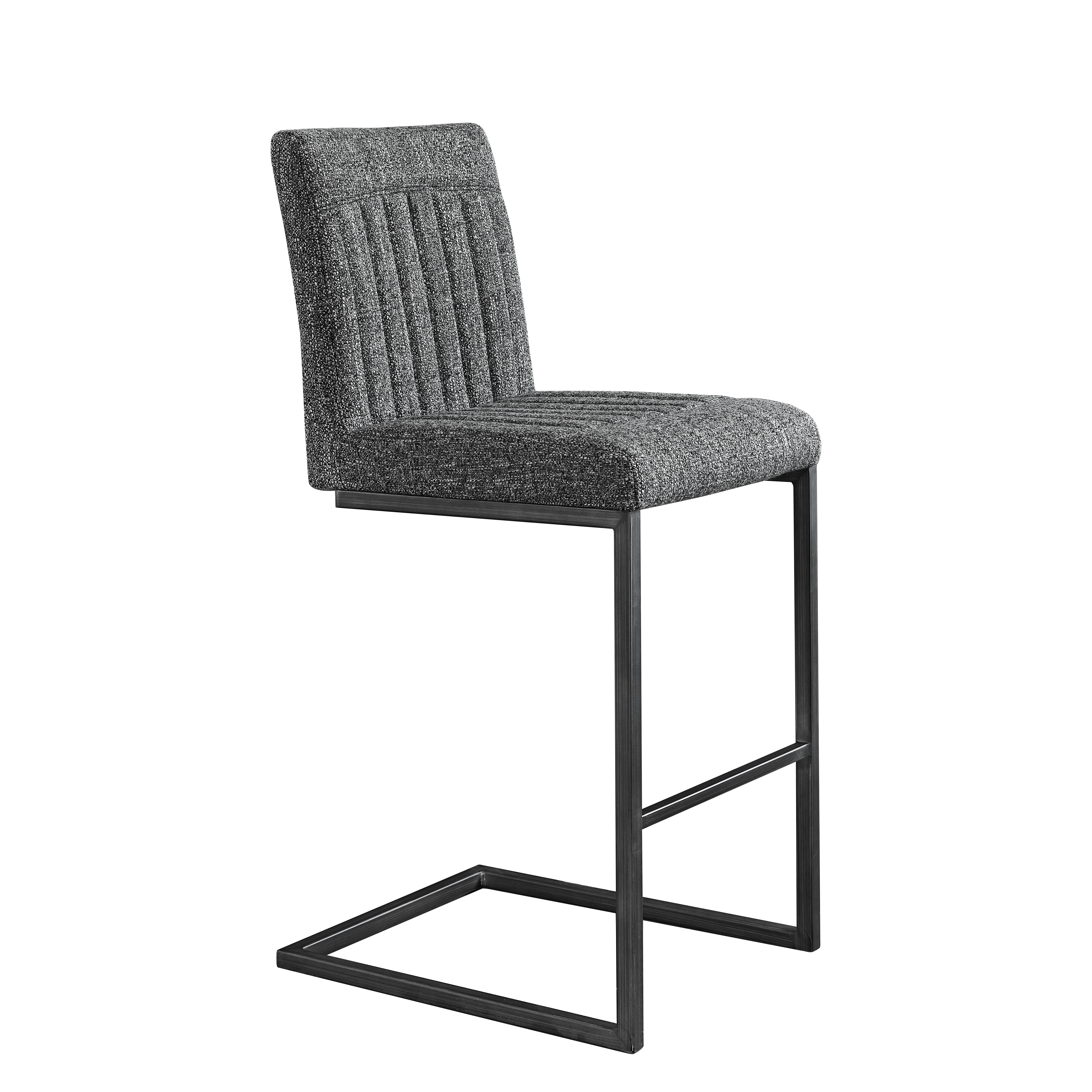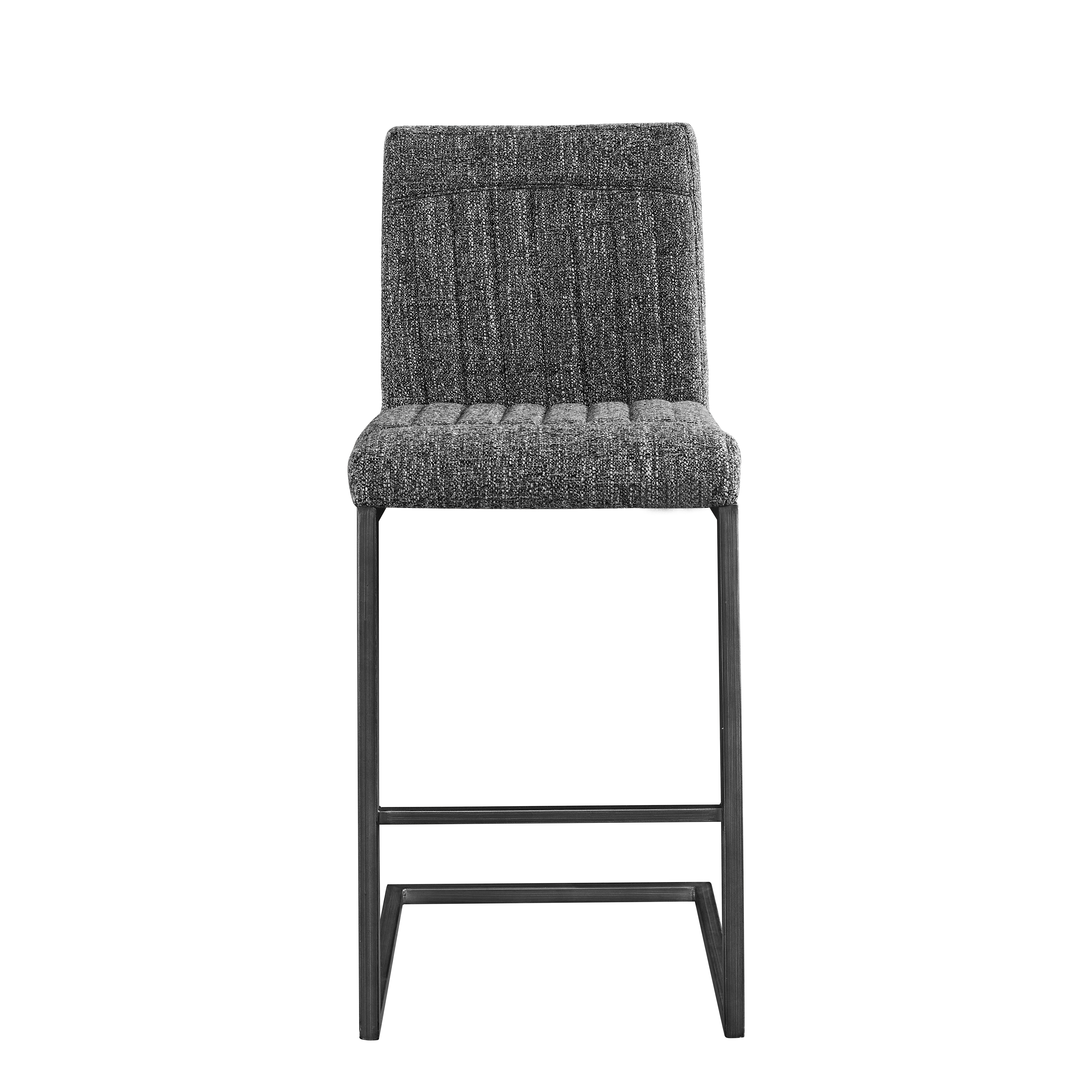 - W5096P400650Product type:Single Box ProductProduct Name:Bar Stool – Speckled Gray Textured Fabric with Vertical Tufted Backrest, , Sturdy Black Metal Frame & Footrest for Kitchen Island & Home Bar,2 SetsColor:Dark GrayMaterial:Fabric+MetalFilling:FoamProduct style:American Design,Contemporary,European,Minimalist,ModernApplicable scenarios:Dining RoomDecorative material:Faux LeatherFrame material:MetalChair features:ErgonomicInterior color:GreyChair shape:SquareChair use case:Bar Stools & Counter StoolsProduct sizeAssembled length (inches):20.88Assembled width (inches):16.55Assembled height (inches):39.20Product weight (pounds):32.78Packaging sizeLength (inches):25.61Width (inches):22.85Height (inches):18.12Weight (pounds):39.38Product featuresThis 26-inch counter height bar stool features premium speckled gray textured fabric upholstery that’s soft to the touch yet resistant to daily spills and minor scratches, paired with a vertical tufted backrest that fits the natural curve of your lumbar—perfect for lingering over morning coffee at the kitchen island or chatting with friends at the home bar without back fatigue.Built with a heavy-duty black metal frame reinforced with crossbars, this bar stool offers exceptional stability and can safely support up to 250 lbs; the integrated footrest provides a comfortable spot to rest your legs, while the matte metal finish resists rust and wear, ensuring long-lasting reliability for high-traffic residential or light commercial use.The unique speckled gray textured fabric and vertical tufted backrest blend modern charm with subtle texture, making this bar stool a stylish addition to industrial, minimalist, or casual home decors—its 18-inch wide seating surface offers ample space for comfort, while the compact metal base fits seamlessly into small kitchen corners or home bar setups without cluttering the area.Designed for hassle-free daily use, this bar stool’s one-piece upholstered seat and backrest eliminate hard-to-clean gaps where crumbs or dust accumulate; the textured fabric is easy to maintain with just a damp cloth, and the sturdy metal frame’s anti-wobble design ensures a steady seating experience, even when leaning back to reach for drinks or snacks.